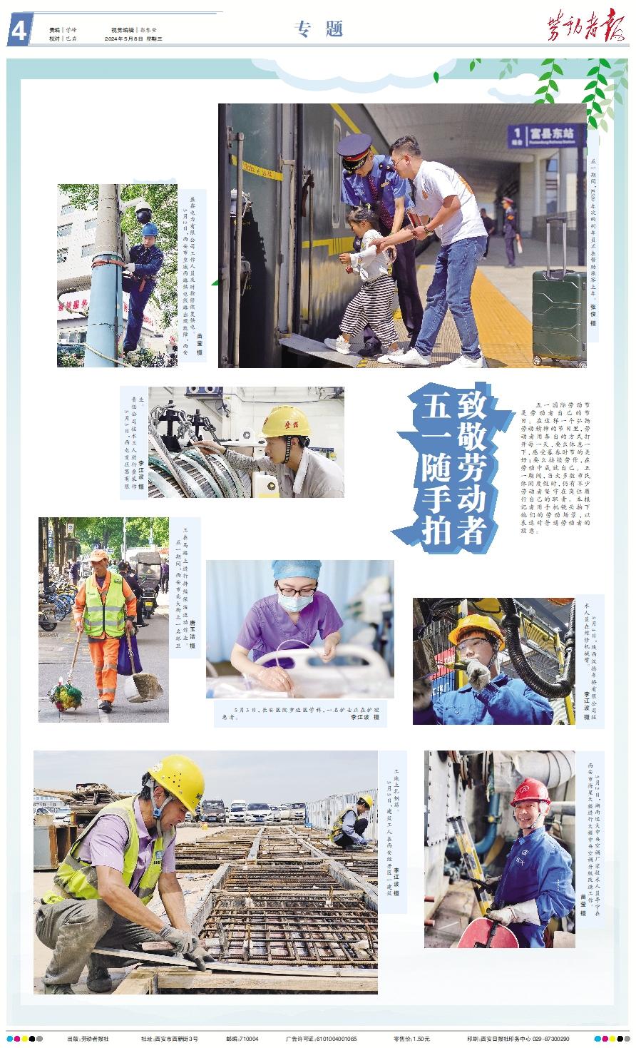 五一国际劳动节是劳动者自己的节日。在这样一个弘扬劳动精神的节日里,劳动者用各自的方式打开每一天,要么休息一下,感受暮春时节的美好;要么接续劳作,在劳动中成就自己。五一期间,当大多数市民休闲度假时,仍有不少劳动者坚守在岗位履行自己的职责。本报记者用手机镜头拍下他们的劳动场景,以表达对普通劳动者的敬意。 五一期间,K559车次的列车员正在帮助旅客上车。张俊 摄 5月2日,西安市皇城西路供电线路出现故障,西安盛鑫电力有限公司工作人员及时抢修恢复供电。 苗莹 摄 5月3日,西电变压器有限责任公司技术工人进行叠装作业。 李江波 摄 五一期间,西安市北大街上一名环卫工在马路上进行持续保洁流动作业。 唐玉洁 摄 5月3日,长安医院重症医学科,一名护士正在护理患者。 李江波 摄 5月4日,陕西汉德车桥有限公司技术人员在维修机械臂。 李江波 摄 5月5日,建筑工人在西安经开区一建筑工地上扎钢筋。 李江波 摄 5月2日,湖南远大中央空调厂家技术人员李宁在西安市海星大楼进行大楼中央空调升级改造工作。 苗莹 摄
