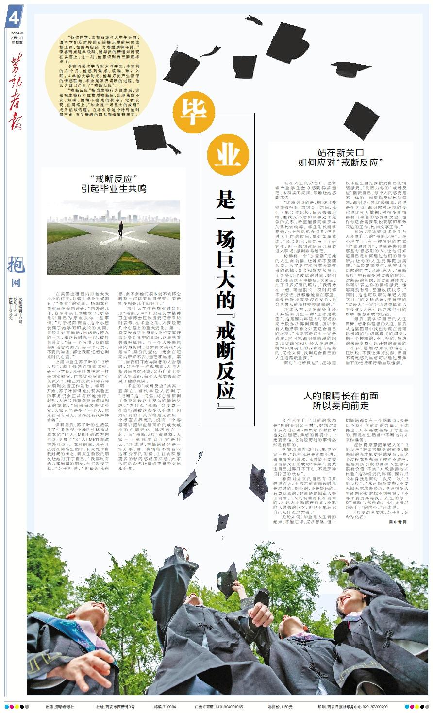 “各位同学,离校系统今天中午开放,请同学们及时按照系统提示提前完成离校流程,如图书归还、欠费缴纳等手续。”李睿琦点进年级群,辅导员的新通知出现在屏幕上,这一刻,他意识到自己彻底毕业了。 李睿琦是法学专业大四学生,毕业前的几个月,他感到焦虑、烦躁,难以入眠。4年的大学时光,他与好友产生很深的情感联结,毕业是强行切断的过程,他认为自己产生了“戒断反应”。 “戒断反应”指当成瘾行为形成后,突然把成瘾行为或物质戒断后,出现焦虑不安、烦躁、情绪不稳定的状态。记者发现,在网络上,“毕业是一场巨大的戒断”成为热议话题。在毕业季这个特殊的时间节点,有关青春的离愁别绪重新袭来。“戒断反应”引起毕业生共鸣 在美国出租屋内打包大大小小的行李,让硕士毕业生杨阳有了“毕业”的实感。杨阳本科毕业后在美国读研,“国外的几年,我在生活上更独立了,更多是以自己为原点去做一些事情。”对于杨阳而言,这个小屋装满了她学习和成长的点滴。曾经让她喜悦的、焦虑的、怀念的一切,和这段时光一起,被打包带走。“每一个污渍,我仿佛都知道它的源头,每一件可要可不要的物品,都让我回忆起它到来时的心境。” 上海毕业生苏子叶的“戒断反应”,源于强烈的情感体验。研三下学期,苏子叶像往常一样来到实验室,作为实验室的“小负责人”,她正为没法和师弟师妹顺利交接工作发愁。学期一开始,苏子叶惊讶地发现实验室的事务仍会正常有序地运行。起初,大家会感慨毕业后难以相见的惆怅,“后来每次去实验室,大家只当是多了一个人,原来我可有可无,世界没有我照样会转”。 读研前后,苏子叶的生活发生了许多改变,让她的性格也从原本的“I”人(MBTI测试为内向型)变成了“E”人(MBTI测试为外向型)。本科期间,苏子叶沉浸在网络生活中,长期处于自我封闭的状态,研究生阶段的朋友让她打开了自己。“我喜欢有活力和能量的朋友,他们改变了我。”苏子叶说,“但最近我在想,会不会他们根本就不会怀念跟我一起玩耍的日子呢?要是能多相处几年就好了。” 为什么学生在毕业时会出现“戒断反应”?北京大学精神卫生学博士汪冰接受记者采访时表示,在毕业之时,人要经历几个心理上的重大变化。第一,将要失去学生身份,也将要离开曾经身处其中的组织,这意味着失去归属感。当一个人失去原来的身份时,他要再次确认“我是谁”,身份的变化一定会在短期内带来不安、迷茫和焦虑。第二,当我们开始与熟悉的人告别时,会产生一种孤独感,人与人相遇后再次分离,又各自走上新的人生道路,每个人都要去面对属于他的现实。 毕业的“戒断反应”其实一直存在,当代年轻人找到了“戒断”这一词语,将它借用到了毕业阶段这个复杂的情绪状态。“为什么‘戒断’会变成一个流行词被这么多人分享?因为以前的千头万绪是无法用一个标签去界定的,没有一个容器可以把毕业所面临的或大或小的心情变化、挑战放在一起。而‘戒断反应’很形象,大家一下就感觉到了它是什么。”汪冰说,为情绪命名是一件好事,当一种情绪不能被表达和分享的时候,往往会积累更多的憋闷感或压抑感,大家认同的命名让情绪更易于交流和分享。站在新关口 如何应对“戒断反应” 站在人生的分岔口,社会学专业学生金今感到异常迷茫,本科实习期间,职场让她感到不适。 “比较典型的是,把KPI(关键绩效指标)放到头上之后,我们可能会作比较,每天去做小结,但我又不想和同事处于竞争的关系,希望能像同学那样关系比较纯粹。学生时代能够犯错,被包容的机会很多,但是进入工作岗位后,处处如履薄冰。”金今坦言,虽然考上了研究生,但一想到读研后仍然要进入职场,感到非常迷茫。 仿佛有一个“加速器”把她的人生向前推,让她来不及回头望。为了尽可能消弭分离带来的遗憾,金今和好友都留出了更多陪伴彼此的时间,她们去苏州西园寺里撸猫、吃素面,拍了很多好看的照片。“我俩待在一起,可能很长一段时间都不会说话,就静静地坐在那里,感受在好朋友身边的安心,不会再像从前那样吵吵闹闹的。” 汪冰认为,现在很多年轻人开始表现出一种“工作过敏症”,这是因为年轻人对职场的期待没办法得到满足,所以会有人选择职场之外更适合自己的环境。“我倒觉得这不一定是逃避,它可能说明现阶段的职场现实确实和年轻人在思想、精神和灵魂上的诉求是有距离的,无论如何,找到适合自己的人生道路最重要。” 面对“戒断反应”,汪冰建议毕业生首先要接受自己的情绪感受。“别因为你的‘戒断反应’指责自己,每个人的感受是不一样的。如果你反应比较强烈,说明你可能比较敏感,这也是个优点,说明你对环境的变化也比别人敏锐,对很多事情都有很丰富的感受和反应,也许你适合需要敏锐观察和细致表达的工作,比如文字工作。” 其次,汪冰建议毕业生与人分享自己的“戒断反应”。在心理学上,有一种很好的方式叫“感恩拜访”,也就是去感谢那些你想感谢的人,让他们知道自己是如何通过他们的所作所为让你的人生变得更加美好。“如果见面不行,就写封信给你的同学、老师、家人,‘戒断反应’中有很多对过去的留恋、对未来的焦虑,通过感恩拜访,你可以表达你的情绪感受,缓解离别愁绪,甚至收获快乐。”同时,这也可以帮助年轻人建立自己