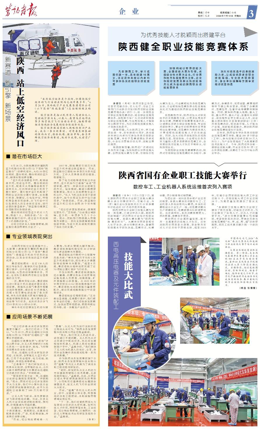 “虽然低空经济是个热词,但围绕低空经济的飞行活动在陕西已经开展多年。”6月26日,陕西航空产业发展集团有限公司(以下简称“陕航集团”)总经理助理王昀说。 低空经济是指以民用有人驾驶和无人驾驶航空器为主,以载人、载货及其他作业等多场景低空飞行活动为牵引,辐射带动相关领域融合发展的综合性经济形态。 低空经济被国家纳入战略性新兴产业后,成为一条全新赛道。对有着良好基础的陕西而言,抢抓机遇、激活市场,奋力开辟低空经济新赛道,既时不我待,也前景广阔。■ 潜在市场巨大 6月26日,在陕航集团所属陕西直升机股份有限公司(以下简称“陕直股份”)的停机库内,大约20架红白相间、蓝白相间、橙白相间的直升机,错落有致地停放着。 “直升机涂装颜色不同,配备设备不同,用途也不同。橙白相间的直升机,配备灭火吊桶等设备用于森林灭火,红白相间的直升机用于医疗救护。医疗救护直升机配备了国际认证的航空医疗装备,包含医疗担架、除颤仪、心电监护仪、呼吸机等急救常用设备,在飞行途中可以监测病人的生命体征变化,进行必要的紧急救护。”陕直股份党群工作部副部长孙晓乐说。 橙白相间的轻型直升机长十几米,限载7人。孙晓乐说:“在一次秦岭救援行动中,通过直升机找到了2名迷路的驴友。” 在低空经济有人驾驶器领域,陕直股份是全国领先企业之一。 2017年,陕航集团引进贝尔系列直升机并成立陕直股份。目前,陕直股份已接收80余架贝尔系列直升机。工作人员具备良好的组装、维修能力。 除了电力巡检等通用航空作业项目,直升机如今已逐渐“走进”普通家庭,成为一种新兴的交通和生活方式。每年假期,高速公路拥堵现象频发,部分人会选择乘坐直升机出行。“私人飞机过去常见于影视作品中,如今在现实生活中也日益增多。”孙晓乐说。目前,陕直股份的直升机已经在全国28个省市租售。 “低空经济要发展起来,政策规划要先行。”王昀说,“以前受空域影响,直升机一年顶多飞几十个小时。现在,民航部门围绕准入管理等方面推出一系列支持政策和改革创新举措,为直升机有效利用提供了强有力的支撑。”■ 专业领域表现突出 在陕西省航空应急救援中心,大屏幕上清晰显示着陕西秦汉通用航空有限公司(以下简称“秦汉通航”)救援直升机执行任务的实时动态,以及全省各地的直升机停机坪。 秦汉通航拥有一支近130人的航空专业队伍,能够执行应急救援、医疗救护、空中巡查、消防灭火、短途运输、大型活动保障等任务。目前,这支队伍是陕西省航空应急救援的主力军。 一次,秦岭突发山洪,秦汉通航出动3架直升机火速赶往蓝田县九间房镇。救援队克服气象条件和复杂地形等困难,成功将10名救援人员和4部卫星电话送到了受灾区域,并先后完成受灾区域灾情检查、救援保障物资投放、受灾群众空中转运等飞行任务。此次任务合计飞行81架次32小时58分钟。 神木市花石崖镇发生机动车撞人事故,伤者右臂和大腿不能动。秦汉通航救援机组仅用20分钟就将伤者送到神木市医院。 秦汉通航运行指挥中心保障专员鱼杰说:“神木市每月平均有5次直升机救援行动,把伤者从乡镇医院转送到神木市医院。”截至4月底,秦汉通航在榆林地区完成了近70项航空医疗救护飞行任务。 不仅在陕西,秦汉通航救援队还在青海、内蒙古及东北地区等地实施失联人员搜救、地震救援、矿井救援和山洪救援。在2023年的甘肃省积石山6.2级地震救援行动中,秦汉通航与地面救援力量紧密配合,成功完成地震救援空中巡查等任务。 秦汉通航总经理梁辰说:“无论是应急救援,还是医疗救护,我们都有专业的经验。我们将创新发展模式,加强运营环境建设,拓展终端应用市场,进一步激发产业活力。”■ 应用场景不断拓展 “低空经济是未来经济发展的重要引擎之一,我们已经站上了风口。”6月28日,西安远超航空科技有限公司(以下简称“远超航空”)董事长李晓刚说。 远超航空是秦创原“e起创”计划入孵企业,在无人机关键的3大核心系统——总体设计、航电、飞控等方面拥有自主核心技术。 目前,远超航空自主研发的多用途、长航时、全智能无人直升机产品,已用于农业植保、电力巡线、航空摄影、环境监测等领域。 “正是看中了我们研发的无人机具有长航时、全智能的优点,吉尔吉斯共和国舒姆卡尔集团与远超航空达成合作协议。”李晓刚说。 “和很多初创企业一样,远超航空前期也遇到发展瓶颈。”李晓刚说,“现在,国家对低空经济发展给予大力支持,我们中小微科技企业无须抵押就能拿到贷款,前不久远超航空就拿到了500万元银行贷款。” 让无人机飞起来,首先要解决试飞测试场地问题。当前,许多无人机企业面临测试场地困境,预约难、价格高成为普遍问题。 远超航空计划在榆林清涧建一个测试基地。根据规划,该基地将配备测试场、厂房、机库等设施,并兼具培训等功能。 “目前,低空物流领域是一片‘蓝海’,以无人机为运行主体的低空物流大有可为。”陕西水务发展智能科技有限公司总经理孟晨说。 “现在,我们用无人机送外卖、送快递已不成问题。无人机先点对点完成空中配送任务,然后将包裹投放给机器人,机器人再将包裹送到客户手中。”孟晨介绍,“我们解决了无人机与机器人的定位、交互、协同作业及操作系统
