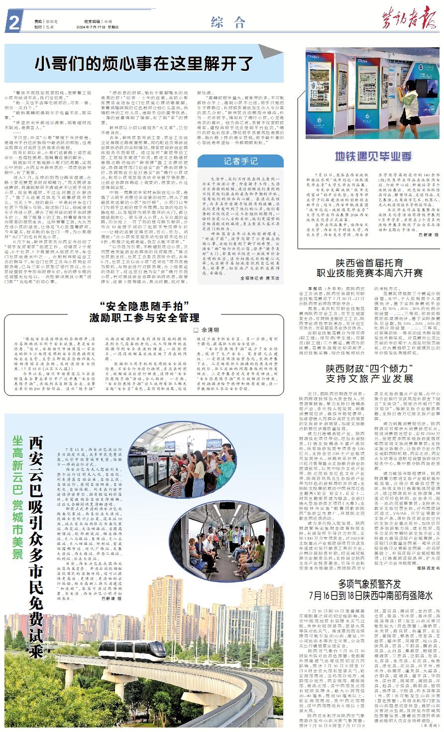 7月13日,西安云巴试运行多日热度不减,众多市民免费试乘,从空中欣赏城市美景,体验不一样的出行方式。 西安云巴为无人驾驶列车,整个运行过程无人化、自动化。列车清晨自动出库、自动上线、自动运行,夜间自动回库、自动充电、自动休眠。列车在行驶中途径涉密单位、距离较近的社区时,车窗玻璃会自动变得模糊,过后又会瞬间恢复清晰透明。 即将正式开通的西安云巴北起鱼化寨站,南至恒业大道站,线路全长约17.2公里,设车站18座,站点自北向南依次为鱼化寨站、西晁站、天谷四路站、省图高新馆站、软件新城站、锦业路西站、丈八七路站、东滩站、丈八五路站、丈八四路站、付村站、紫薇田园都市站、时代广场站、发展大道站、西太路站、毕原二路站、祝村站、恒业大道站。 目前,西安云巴在我国西北地区尚属首条。开通后既能缩短沿线居民的通勤时间,还可以提供更高效、更便捷、更通畅的出行体验,助力高新三期交通建设“加速跑”,乘客可通过现场购票、长安通、西安云巴小程序扫码乘车。 巴新建 摄