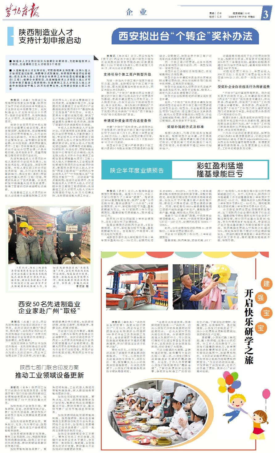 ■ 制造业人才支持计划分为创新企业家项目、先进制造技术人才项目、先进基础工艺人才项目3个项目■ 入选制造业人才支持计划,可获得相关支持政策:支持入选人才按规定通过挂职、特聘等方式到高校、科研院所等进行培养锻炼;优先支持入选人才所在企业承担工业和信息化领域重大项目(工程);创新企业家项目、先进制造技术人才项目入选人才可直接申报正高级工程师职称;先进基础工艺人才项目入选人才由中央财政给予每人25万元经费支持,支持建设技能大师工作室 本报讯 (沈谦) 为落实工信部等国家部委安排部署,陕西省工信厅日前启动2024年制造业人才支持计划申报推荐工作。此次制造业人才支持计划分3个项目:创新企业家项目、先进制造技术人才项目、先进基础工艺人才项目。 创新企业家项目的申报人需担任企业董事长或总经理,具有全球视野、战略思维、创新精神和突出的经营管理能力,在行业内具有较大影响力。申报人要带领企业聚焦主业,走专精特新发展道路,在科技创新、承担国家重大项目(工程)方面取得突出成效,所在企业应在经营业绩、产品市场份额、技术创新水平、质量管理能力等方面位居行业前列。 先进制造技术人才项目的申报人需担任企业技术负责人,包含技术总监、研发总监、首席科学家等。申报人要长期工作在企业技术研发一线,在行业内具有较高影响力,具有主持(承担)国家或地方重大项目(工程)经验,带领团队攻克了技术难题。在技术研发中取得重大技术革新成果,取得了显著的经济效益和社会效益。 先进基础工艺人才项目的申报人必须是企业基础制造工艺方面的带头人,长期从事基础工艺技术攻关、实践操作等工作,其掌握的先进基础工艺应符合《产业基础创新发展目录》中“基础制造工艺及装备”所列方向。申报人要具有丰富的实践经验,解决了生产制造过程中的关键工艺难题或掌握先进操作技术方法,取得了显著的经济效益和社会效益。 申报人入选制造业人才支持计划,可获得相关支持政策:如依托企业经营管理人才素质提升工程、专业技术人才知识更新工程等,组织入选人才参加国内外专题研修培训;支持入选人才按规定通过挂职、特聘等方式到高校、科研院所、科技社团、国家制造业创新中心等进行培养锻炼;优先支持入选人才所在企业承担工业和信息化领域重大项目(工程);将入选人才指标纳入工业和信息化领域示范项目的认定或评价体系;推荐符合条件的入选人才申报“国家工程师奖”“全国杰出专业技术人才”“中华技能大奖”“全国技术能手”“五一劳动奖章”等表彰奖励;创新企业家项目、先进制造技术人才项目入选人才可直接申报正高级工程师职称;先进基础工艺人才项目入选人才由中央财政给予每人25万元经费支持,支持建设技能大师工作室。