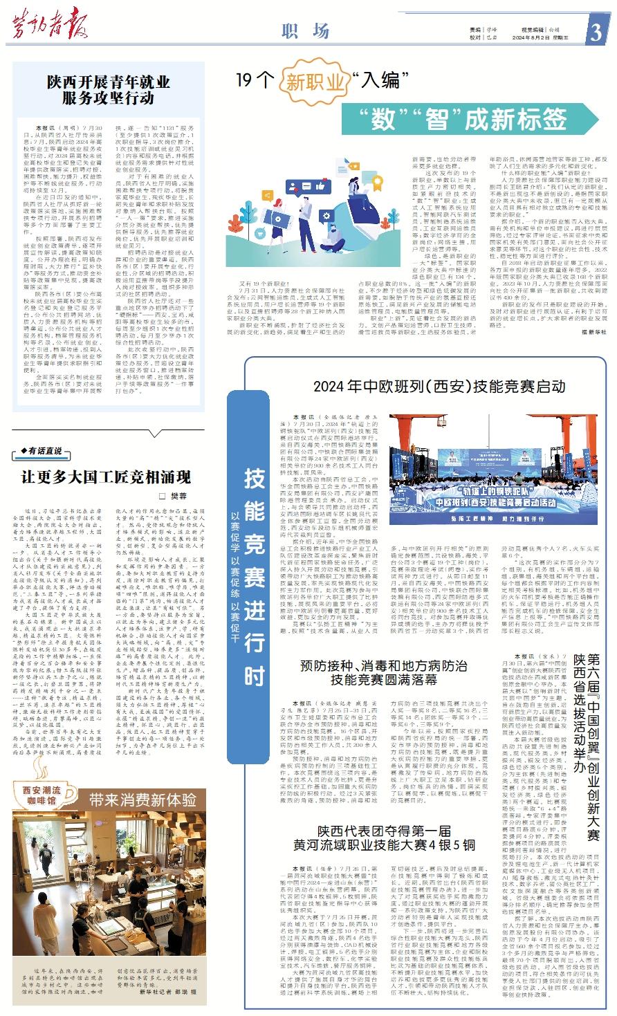 又有19个新职业! 7月31日,人力资源社会保障部向社会发布:云网智能运维员、生成式人工智能系统应用员、用户增长运营师等19个新职业,以及直播招聘师等28个新工种纳入国家职业分类大典。 新职业不断涌现,折射了经济社会发展的新变化、新趋势,满足着生产和生活的新需要,也给劳动者带来更多就业选择。 这次发布的19个新职业,半数以上与新质生产力密切相关。如紧跟前沿技术的“数”“智”职业:生成式人工智能系统应用员、智能网联汽车测试员、智能制造系统运维员、工业互联网运维员等;数字经济孕育的全新岗位:网络主播、用户增长运营师等。 绿色,是新职业的一大“标签”。国家职业分类大典中标注的绿色职业已有134个,占职业总数的8%。这一批“入编”的新职业,不少源于经济转型和绿色低碳发展的新需要,如脱胎于传统产业的氢基直接还原炼铁工、满足新兴产业发展的储能电站运维管理员、电能质量管理员等。 职业“上新”,见证着社会发展的新活力。文创产品策划运营师、口腔卫生技师、滑雪巡救员等新职业,生活服务体验员、老年助浴员、休闲露营地管家等新工种,都反映了人们生活需求的多元化和新变化。 什么样的职业能“入编”新职业? 人力资源社会保障部职业能力建设司副司长王晓君介绍:“我们认定的新职业,不是新出现也不是新创设的,是指国家职业分类大典中未收录、但已有一定规模从业人员且具有相对独立成熟的专业和技能要求的职业。” 据介绍,一个新的职业能否入选大典,需有关机构和单位申报建议,再进行层层筛选,经过专家评审论证、书面征求中央和国家机关有关部门意见、面向社会公开征求意见等环节,对这个职业的社会性、技术性、稳定性等方面进行评价。 自2018年启动新职业征集工作以来,各方面申报的新职业数量逐年增多。2022年版国家职业分类大典已收录168个新职业。2023年10月,人力资源社会保障部面向社会公开征集新一批新职业,共收到建议书430余份。 新职业的发布只是职业建设的开始。及时对新职业进行规范认证,有利于培育新的就业增长点,扩大求职者的职业发展路径。 据新华社