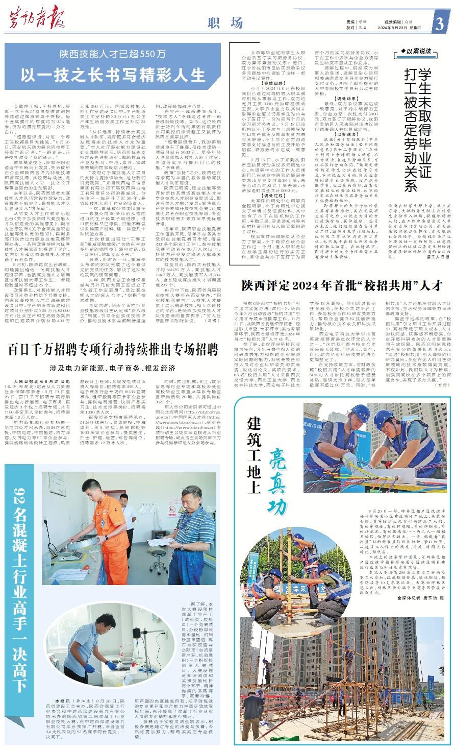 根据《陕西省“校招共用”引才用才实施办法(试行)》,陕西今年3月启动省级“校招共用”引才用才专项申报推荐工作。8月21日,从陕西省委组织部获悉:经过形式审查、专家评审、实地考察等环节,陕西省最终评定2024年首批“校招共用”人才65名。 据了解,此次评审坚持以实绩为导向,突出考察申报人员的科研攻关能力和帮助企业解决实际问题的能力,特别是关注申报人员对企业科研攻关的贡献度,淡化对论文、奖项的要求。65名“校招共用”人才来自西安交通大学、西北工业大学、西北农林科技大学、西安电子科技大学等18所高校。他们通过长期驻企服务、在校企共建平台工作、参与校企合作科研攻关等方式,帮助企业提升科技创新能力,推动核心技术攻关和科技成果转化。 西安电子科技大学华山菁英教授蔡清是此次评定的人才之一。“这给我们参与校企合作带来很大鼓舞。”他表示,如今,自己助力企业科研攻关的决心更加坚定了。 在支持政策方面,省财政按照“校招共用”人才年度薪酬的50%对人才依托高校给予经费补贴,连续支持3年,每人每年最高不超过50万元。同时,“校招共用”人才还能在省级人才计划申报、生活服务保障等方面获得政策支持。 得益于这样的政策,在“校招共用”引才用才工作开展过程中,高校降低了用人成本,人才的认同感、获得感不断增强,企业开展科研攻关的人才资源得到有效保障。陕西启明信息技术有限公司董事长刘飞表示:“通过‘校招共用’引入高校的科研力量后,企业在无人机自主决策领域的技术瓶颈得到突破。不仅如此,我们以人才为桥梁,加强同高校在多个项目上的深度合作,实现了多方共赢。” (甘甜)