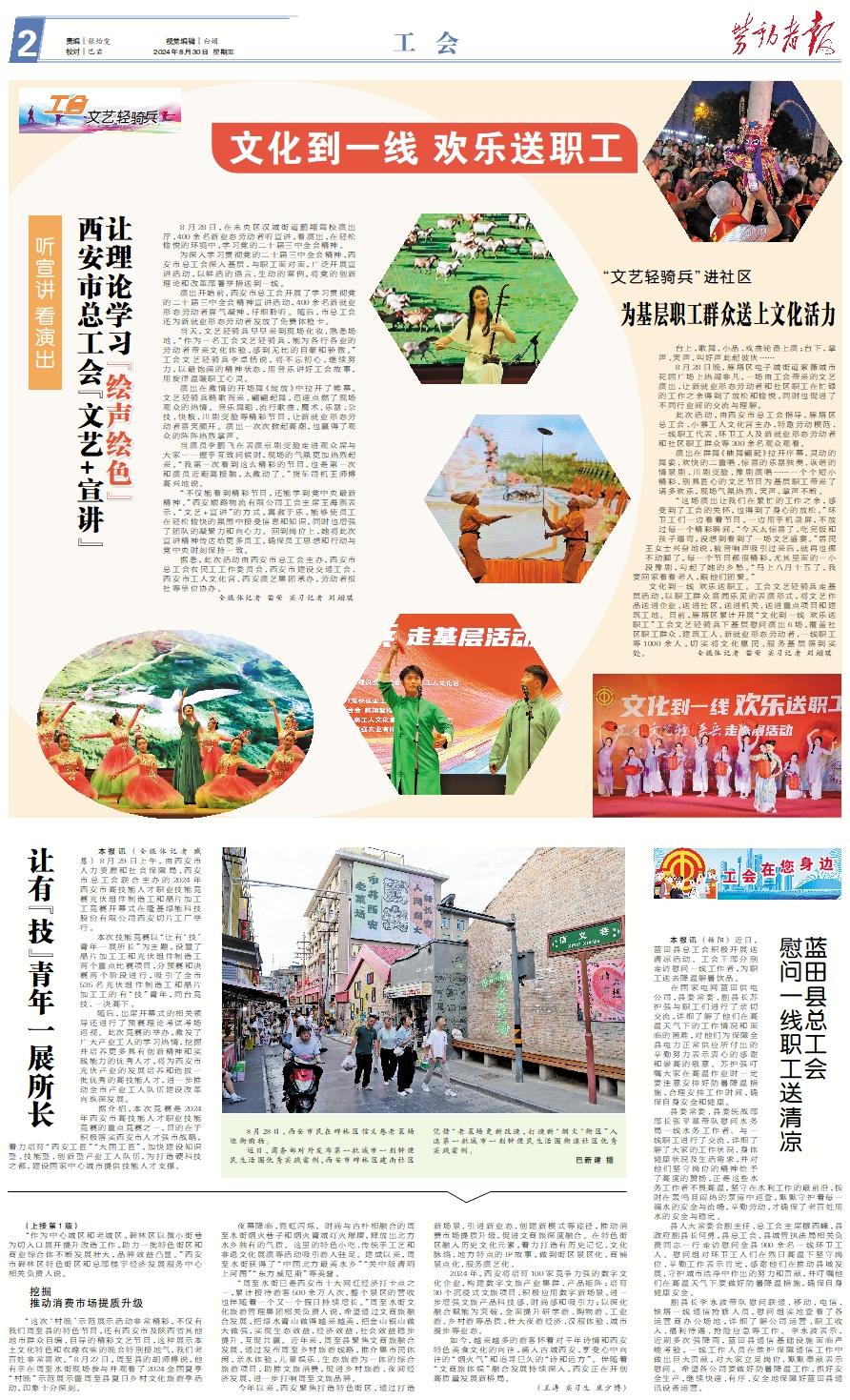 台上,歌舞、小品、戏曲轮番上演;台下,掌声、笑声、叫好声此起彼伏…… 8月28日晚,雁塔区电子城街道紫薇城市花园广场上热闹非凡,一场由工会带来的文艺演出,让新就业形态劳动者和社区职工在忙碌的工作之余得到了放松和愉悦,同时也促进了不同行业间的交流与理解。 此次活动,由西安市总工会指导,雁塔区总工会、小寨工人文化宫主办,特邀劳动模范、一线职工代表、环卫工人及新就业形态劳动者和社区职工群众等300余名观众观看。 演出在群舞《袖舞翩跹》拉开序幕,灵动的舞姿、欢快的二重唱、惊喜的乐器独奏、诙谐的情景剧、川剧变脸、豫剧演唱……一个个短小精彩、别具匠心的文艺节目为基层职工带来了诸多欢乐,现场气氛热烈,笑声、掌声不断。 “这场演出让我们在繁忙的工作之余,感受到了工会的关怀,也得到了身心的放松。”环卫工们一边看着节目,一边用手机录屏,不放过每一个精彩瞬间。“今天太惊喜了,吃完饭和孩子遛弯,没想到看到了一场文艺盛宴。”居民王女士兴奋地说,被音响声吸引过来后,就再也挪不动脚了,每一个节目都很精彩,尤其里面的一小段豫剧,勾起了她的乡愁。“马上八月十五了,我要回家看看老人,跟他们团聚。” 文化到一线 欢乐送职工。工会文艺轻骑兵走基层活动,以职工群众喜闻乐见的表演形式,将文艺作品送进企业、送进社区,送进机关、送进重点项目和建筑工地。目前,雁塔区累计开展“文化到一线 欢乐送职工”工会文艺轻骑兵下基层慰问演出6场,覆盖社区职工群众、建筑工人、新就业形态劳动者、一线职工等1000余人,切实将文化惠民、服务基层落到实处。 全媒体记者 苗莹 实习记者 刘翊琪