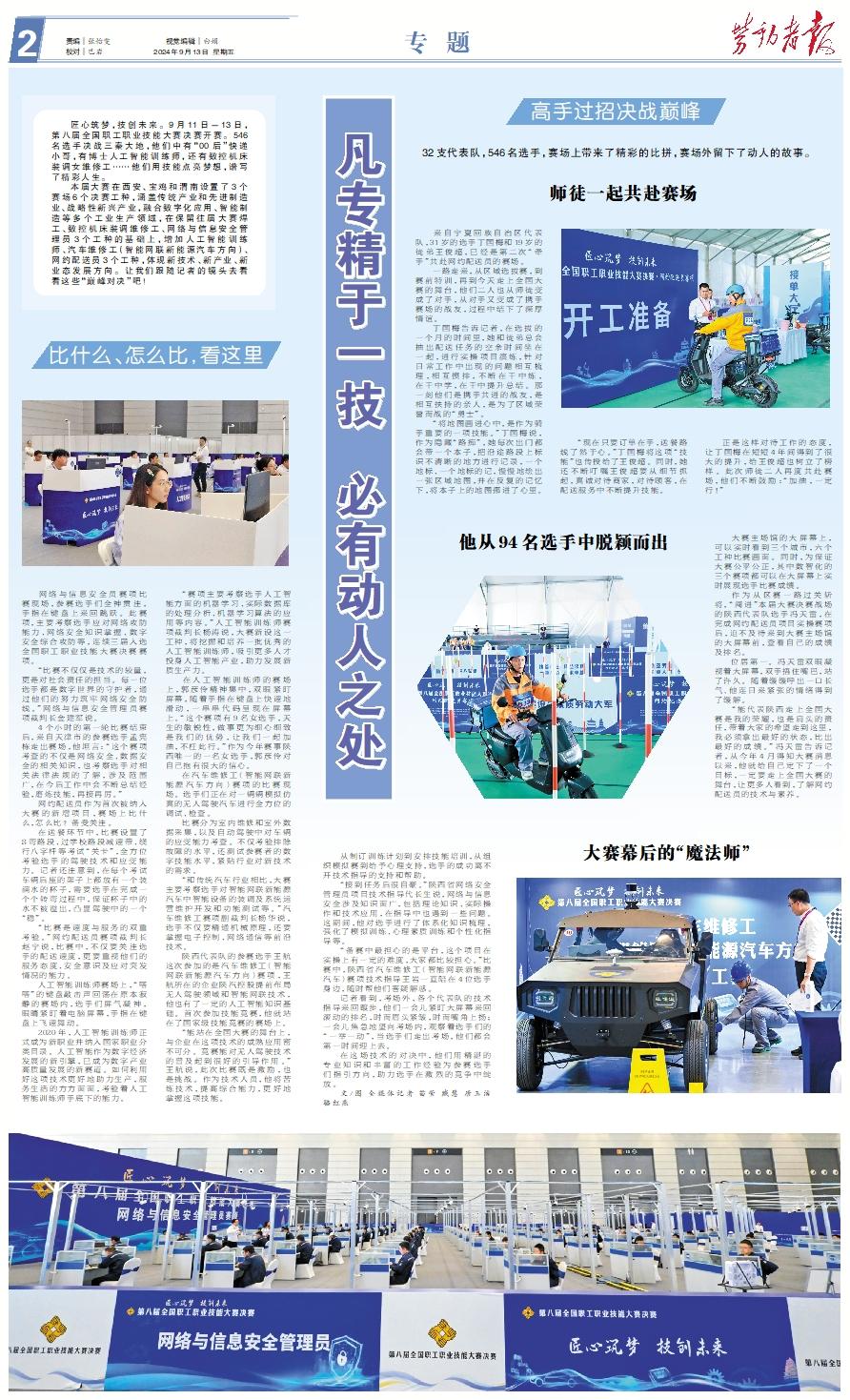 匠心筑梦,技创未来。9月11日-13日,第八届全国职工职业技能大赛决赛开赛。546名选手决战三秦大地,他们中有“00后”快递小哥,有博士人工智能训练师,还有数控机床装调女维修工……他们用技能点亮梦想,谱写了精彩人生。 本届大赛在西安、宝鸡和渭南设置了3个赛场6个决赛工种,涵盖传统产业和先进制造业、战略性新兴产业,融合数字化应用、智能制造等多个工业生产领域,在保留往届大赛焊工、数控机床装调维修工、网络与信息安全管理员3个工种的基础上,增加人工智能训练师、汽车维修工(智能网联新能源汽车方向)、网约配送员3个工种,体现新技术、新产业、新业态发展方向。让我们跟随记者的镜头去看看这些“巅峰对决”吧!比什么、怎么比,看这里 网络与信息安全员赛项比赛现场,参赛选手们全神贯注,手指在键盘上来回跳跃。此赛项,主要考察选手应对网络攻防能力、网络安全知识掌握、数字安全综合攻防等,连续三届入选全国职工职业技能大赛决赛赛项。 “比赛不仅仅是技术的较量,更是对社会责任的担当。每一位选手都是数字世界的守护者,通过他们的努力筑牢网络安全防线。”网络与信息安全管理员赛项裁判长金建军说。 4个小时的第一轮比赛结束后,来自天津市的参赛选手孟宪栋走出赛场,他坦言:“这个赛项考查的不仅是网络安全、数据安全的相关知识,也考察选手对相关法律法规的了解,涉及范围广,在今后工作中会不断总结经验,磨炼技能,再接再厉。” 网约配送员作为首次被纳入大赛的新增项目,赛场上比什么,怎么比?备受关注。 在送餐环节中,比赛设置了S弯路段、过学校路段减速带、绕行八字杆等考试“关卡”,全方位考验选手的驾驶技术和应变能力。记者还注意到,在每个考试车辆后座的架子上都放有一个装满水的杯子,需要选手在完成一个个转弯过程中,保证杯子中的水不被溢出,凸显驾驶中的一个“稳”。 “比赛是速度与服务的双重考验。”网约配送员赛项裁判长赵宁说,比赛中,不仅要关注选手的配送速度,更要重视他们的服务态度、安全意识及应对突发情况的能力。 人工智能训练师赛场上,“嗒嗒”的键盘敲击声回荡在原本寂静的赛场内,选手们屏气凝神,眼睛紧盯着电脑屏幕,手指在键盘上飞速舞动。 2020年,人工智能训练师正式成为新职业并纳入国家职业分类目录。人工智能作为数字经济发展的新引擎,已成为数字产业高质量发展的新赛道。如何利用好这项技术更好地助力生产,服务生活的方方面面,考验着人工智能训练师手底下的能力。 “赛项主要考察选手人工智能方面的机器学习、实际数据库的处理分析、机器学习算法的应用等内容。”人工智能训练师赛项裁判长杨涛说,大赛新设这一工种,将挖掘和培养一批优秀的人工智能训练师,吸引更多人才投身人工智能产业,助力发展新质生产力。 在人工智能训练师的赛场上,郭彦伶精神集中,双眼紧盯屏幕,随着手指在键盘上快速地滑动,一串串代码呈现在屏幕上。“这个赛项有9名女选手,天生的敏锐性,做事更为细心细致是我们的优势,让我们一起加油,不枉此行。”作为今年赛事陕西唯一的一名女选手,郭彦伶对自己抱有很大的信心。 在汽车维修工(智能网联新能源汽车方向)赛项的比赛现场。选手们正在对一辆辆模拟仿真的无人驾驶汽车进行全方位的调试、检查。 比赛分为室内维修和室外数据采集,以及自动驾驶中对车辆的应变能力考查。不仅考验排除故障的水平,还测试参赛者的数字技能水平,紧贴行业对新技术的需求。 “和传统汽车行业相比,大赛主要考察选手对智能网联新能源汽车中智能设备的装调及系统运营维护开发和功能测试等。”汽车维修工赛项副裁判长杨华说,选手不仅要精通机械原理,还要掌握电子控制、网络通信等前沿技术。 陕西代表队的参赛选手王航这次参加的是汽车维修工(智能网联新能源汽车方向)赛项,王航所在的企业陕汽控股提前布局无人驾驶领域和智能网联技术,他也有了一定的人工智能知识基础。首次参加技能竞赛,他就站在了国家级技能竞赛的赛场上。 “能站在全国大赛的舞台上,与企业在这项技术的成熟应用密不可分。竞赛能对无人驾驶技术的普及起到很好的引导作用。”王航说,此次比赛既是激励,也是挑战。作为技术人员,他将苦练技术,提高综合能力,更好地掌握这项技能。高手过招决战巅峰32支代表队,546名选手,赛场上带来了精彩的比拼,赛场外留下了动人的故事。师徒一起共赴赛场 来自宁夏回族自治区代表队,31岁的选手丁国梅和19岁的徒弟王俊超,已经是第二次“牵手”共赴网约配送员的赛场。 一路走来,从区域选拔赛,到赛前特训,再到今天走上全国大赛的舞台,他们二人也从师徒变成了对手,从对手又变成了携手赛场的战友,过程中结下了深厚情谊。 丁国梅告诉记者,在选拔的一个月的时间里,她和徒弟总会抽出配送任务的空余时间坐在一起,进行实操项目演练,针对日常工作中出现的问题相互梳理,相互摸排,不断在干中练,在干中学,在干中提升总结。那一刻他们是携手共进的战友,是相互扶持的亲人,是为了区域荣誉而战的“勇士”。 “将地图画进心中,是作为骑手重要的一项技能。”丁国梅说,作为隐藏“路痴”,她每次出门都会带一个本子,把沿途路段上标识不清晰的地方进行记录,一个地标、一个地标的记,慢