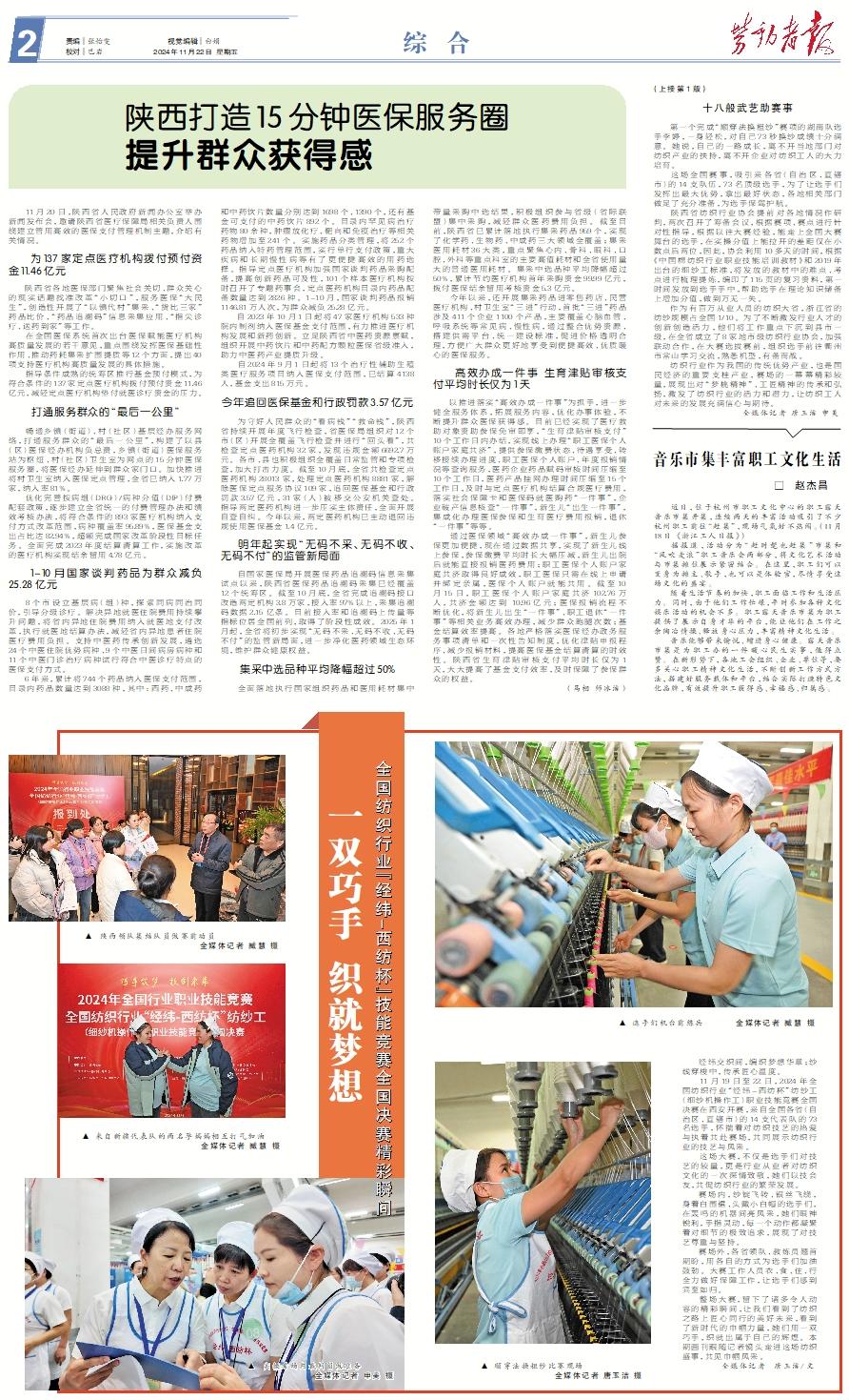 ▲ 陕西领队集结队员做赛前动员 全媒体记者 臧慧 摄▲ 来自新疆代表队的两名孕妈妈相互打气加油 全媒体记者 臧慧 摄▲ 实操考场内裁判员做准备 全媒体记者 申美 摄▲ 选手们机台前练兵 全媒体记者 臧慧 摄 ▲ 顺穿法换粗纱比赛现场 全媒体记者 唐玉洁 摄 经纬交织间,编织梦想华章;纱线穿梭中,传承匠心温度。 11月19日至22日,2024年全国纺织行业“经纬-西纺杯”纺纱工(细纱机操作工)职业技能竞赛全国决赛在西安开赛,来自全国各省(自治区、直辖市)的14支代表队的73名选手,怀揣着对纺织技艺的热爱与执着共赴赛场,共同展示纺织行业的技艺与风采。 这场大赛,不仅是选手们对技艺的较量,更是行业从业者对纺织文化的一次深情致敬,她们以技会友,共促纺织行业的繁荣发展。 赛场内,纱锭飞转、银丝飞绕,身着白围裙、头戴小白帽的选手们,在轰鸣的机器间亮风采,她们眼神锐利,手指灵动,每一个动作都凝聚着对细节的极致追求,展现了对技艺尊重与坚持。 赛场外,各省领队、教练员翘首期盼,用各自的方式为选手们加油鼓劲。大赛工作人员衣、食、住、行全力做好保障工作,让选手们感到宾至如归。 整场大赛,留下了诸多令人动容的精彩瞬间,让我们看到了纺织之路上匠心同行的美好未来,看到了新时代的巾帼力量,她们用一双巧手,织就出属于自己的辉煌。本期画刊跟随记者镜头走进这场纺织盛事,共见巾帼风采。 全媒体记者 唐玉洁/文