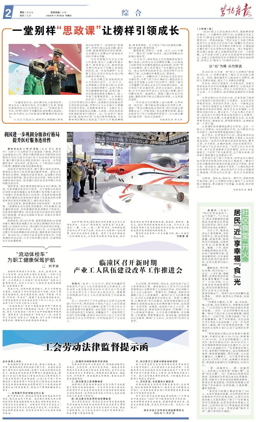 “在重症监护室,每天都会有人被救治好,但也会有人离我们而去,作为医护工作者,要做的是始终全力以赴抢救生命……”宽敞的报告厅内,同学们因护士李静的抗疫故事大受感动,140余名师生从中体悟到劳模精神的深刻含义。 11月27日至28日,碑林区大学南路小学朱雀分校开展了一堂别样的“思政课”,同学们通过走进劳模,聆听劳模,渐渐领悟到劳动的真谛,从劳模的生动事迹中感受到劳动的不易与荣耀。 为培育和践行社会主义核心价值观,助力广大青少年成长成才,碑林区总工会、碑林区教育局共同主办了劳模工匠进校园活动,进一步发挥辖区广大劳模工匠以及各行各业先进人物的榜样引领作用。 此次劳模工匠进校园活动分为两部分进行。11月27日,大学南路小学朱雀分校32名学生在老师的带领下,走进了西安市劳模精神展示馆,同学们第一次近距离地接受劳模洗礼,脸上写满了敬意和好奇。在讲解员的介绍下,他们在一位位劳模的工作经历和生活点滴中,感受到劳动创造美好生活的深刻内涵,同学们在杂交水稻之父袁隆平的展示区前,听到袁爷爷终其一生都在为人民解决吃饭温饱的问题,六年级二班的陈梁胤启男想起课本中《悯农》一诗,“以前学习‘谁知盘中餐,粒粒皆辛苦’让我们要珍惜粮食,今天袁爷爷的事迹让我知道了为什么不能浪费粮食,袁爷爷奉献一生才改变了我们的粮荒问题,我们要感恩,更要珍惜。” 整场参观,同学们一边看一边记,在心中播下了一颗名为“劳模”的种子,通过潜移默化的影响生根发芽。 11月28日,碑林区总工会特邀辖区奋战在医疗战线上的西安市劳动模范李静、公安战线上的碑林区劳动模范高嘉涛走进校园,开展“学习劳动模范,匠心筑梦成长”为主题的宣讲活动。通过与同学的现场互动,增进同学们对劳模的了解,让劳模的形象更生动,更鲜活。 宣讲会上,李静讲述了多年前武汉抗疫的亲身经历,分享了自己的心得体会;高嘉涛将交通安全普及融入在自己的分享中,展现了身为人民警察守护群众安全出行的职责与使命。他们用自己的亲身经历,讲述立足岗位、攻坚克难、在平凡岗位谱写奋斗人生的感人故事,他们的事迹如同一盏盏明灯,照亮了青少年前行的道路,激励同学们树立正确的世界观、人生观和价值观。 一件件发生在劳模身上感人故事,让四年级一班的刘一筱不禁地想与身边的同学分享,她说:“原来劳模就是这样的呀,他们的成功是靠勤奋实干,不断进取,我也要像李阿姨、高叔叔那样为了自己的理想好好学习,长大成为像我们姚老师一样的人民教师。” 全媒体记者 唐玉洁
