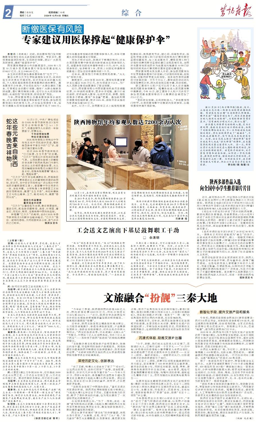“今年前三季度,陕西接待国内游客6.86亿人次,国内游客花费6367.79亿元,同比分别增长17.16%和20.51%……”近日,陕西省举办新闻发布会介绍文化和旅游领域高质量发展的相关情况,一组亮眼的数据很“吸睛”。 近年来,陕西文旅呈现出精品创作亮点频出、公共服务效能提升、非遗传承创新发展、产业集群发展壮大、旅游业态创新融合、对外交流合作深入等特点。“西安的旅游淡季,只有凌晨2点到5点”“节假日,中国有7亿人在全国各地,另外7亿人去了西安”……各种关于陕西“旅游热”的网络热梗频频爆出。 “文旅融合是文化和旅游产业相互融合,创造出内容丰富、特色鲜明的旅游产品和服务。网络热梗背后便是陕西不断推动文旅深度融合、改革创新的结果。”长期研究陕西文旅的西北大学新闻传播学院传播学系主任赵爽英说。深挖历史文化,创新表达 “有了王都,咱秦人心里就有了家了”“将士们,让这西北的风雪,送你们回家”“汝等,须如恒星、如磐石,世世代代护佑我华夏子孙”……今年9月27日,历时6年创作,备受瞩目的全国首个超大型秦文化主题演艺《赳赳大秦》在西安首演。演出结束后,迎来长达10多分钟的掌声、欢呼声,之后更是好评如潮。 “该剧完全呈现了中国舞台奇迹。”著名表演艺术家濮存昕说。陕西历史博物馆馆长侯宁彬指出,“《赳赳大秦》这种忠实于历史、又富有创造力的表现,赋予了剧作深刻的内涵,也为观众提供了一次感知历史的难得机会。” 在连续多场演出后,“为了一部剧,奔赴一座城”成为网络热议话题。《赳赳大秦》是陕西在文旅方面不断深挖优秀历史文化,激发创新创造活力、推动高质量发展的缩影。 西安大唐不夜城对“唐文化”的拆解重塑,体现在各个层面。“大雁塔、贞观、开元”三大广场、“开元盛世”等五大主题雕塑,以及唐食坊、遇见唐文创店等,展示了优秀传统文化的独特魅力;歌剧《张骞》,舞剧《丝绸之路》《传丝公主》,杂技剧《丝路彩虹》,音乐剧《丝路之声》等一批关于“一带一路”的优秀舞台剧目在国内外展演,社会反响热烈。 赵爽英表示,近年来,陕西文旅取得长足发展和不俗成绩,主要表现在其对唐、秦等文化遗产的深度挖掘上,不断加强其创新性表达,同时推动文旅跨界融合,这说明陕西在推动文化自信自强方面不断坚定。沉浸式体验,助推文旅IP出圈 “公子、姑娘,我们就从这里进入长安城了,见到诸位大人,记得行这样一个叉手礼……”11月中旬,来自南京的游客赵小徽带着家人来西安游玩,首站便选择了沉浸式唐风市井生活街区——长安十二时辰。换好汉服后,一进街区的大门,打扮成许鹤子的伴游师便吸引了他们。 在长安十二时辰,消费可以将现金换成唐朝的开元通宝,里面集聚了100余种唐朝长安最原真、最齐全的美食小吃,同时还有银器、琉璃、香料、唐绣等各类唐朝手作文创店铺。走在街区,随处可见被簇拥着游街的花魁、吆喝叫卖的游商、荔枝道上扎着辫子的丫头、眉目传情的大家闺秀与俊秀书生…… 负责开发该主题街区的陕西文化产业投资控股(集团)有限公司相关负责人表示,长安十二时辰在内容上深挖大唐盛世长安城的历史文化,涵盖长安小吃、主题文创、特色演艺、沉浸游戏、文化包间、场景体验等多元“原唐”业态,助推“长安十二时辰”IP出圈。 今年春晚西安分会场《山河诗长安》中,“李白”进行了荡气回肠的诗词朗诵,以及国产动漫《长安三万里》热播,陕西通过打造唐文化IP,以“唐诗热”吸引全国无数游客“远赴人间惊鸿宴,一睹长安盛世颜”。榆林文旅则注重打造《黑神话:悟空》游戏与陕北说书跨界融合IP,通过沉浸式说书体验,向外传递陕北人民的精神风貌和价值观念。数智化手段,提升文旅产品和服务 今年初,国潮沉浸剧场全国首店《唐朝诡事录·西行》在西安开业,其借助先进装备和VR技术,通过逼真的场景建模、动态视角切换、交互式的角色扮演等让观众沉浸其中。剧场推出不久后,迅速“破圈”,成为西安新晋热门打卡点。 2023年末,陕西发布《关于加快文旅产业发展的若干措施》提出,加快智慧文旅建设,优化升级陕西省文旅产业运行监测与应急指挥平台,逐步实现A级旅游景区客流、视频数据全部接入,同时推动利用数字技术改造提升传统旅游消费场所,打造智慧旅游、沉浸式体验新空间。 在西安大雁塔北广场,华灯初上,游客面向大雁塔戴上AR眼镜后,光影交错,更迭起伏,一幅幅盛唐的历史画卷在眼前流转,一行行古诗词向上滑动。这是“雁塔流光”沉浸式AR秀表演。 除了一些新技术用于旅游中,智慧化理念也无处不在。大唐不夜城街区集控了170个多功能集成杆、420组监控及263组广播设施打造出一套客流监控、分析与洞察的数据大屏;街区地面铺设的感应地砖灯,以科技、时尚、唯美,生动给予所有游客丰富的体验感;打造喷泉矩阵,以水为依托平台,以灯光创意为媒介,使喷泉声、光、水、色有机交融,为游客呈现了一场视觉盛宴…… “新技术是文旅创新的重要助力,借助数字技术,智慧旅游让传统旅游焕发出新活力。”西部数字经济研究院院长张鸿说。随着增强现实、虚拟现实、人工智能等科技在陕西文旅领域的广泛应用,各景区文化主题活动也在加快创新步伐。 陕西省文旅厅副厅长刘海荣表示,长期以来,陕西深挖旅游文化特质,推动文旅融合