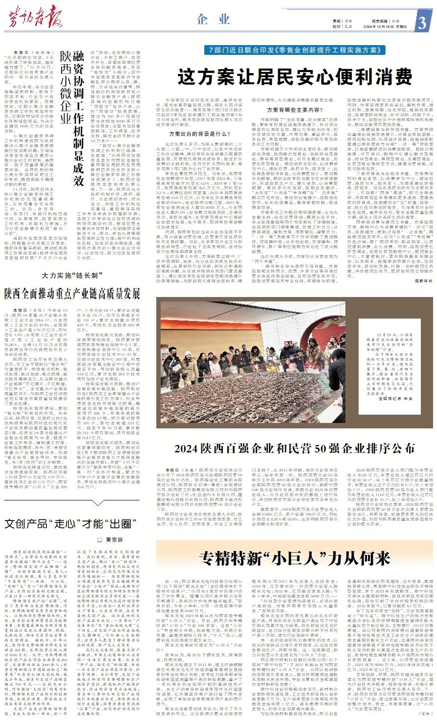 本报讯 (杨晓梅) “在泾阳联社贷款,3天就完成了审批放款,越来越方便了。”12月13日,泾阳临空科技智造产业园内一家企业的负责人说。 临近年底,该企业急需购买原材料,但由于回款不利,企业生产流动资金比较紧张。关键时刻,泾阳小微企业融资协调工作机制发挥作用,泾阳农村信用合作联社开辟绿色通道,为该企业提供1000万元的贷款支持。 小微企业融资协调工作机制是我国为统筹解决小微企业融资难和银行放贷难问题,引导信贷资金快速直达基层小微企业的工作机制,是国家一揽子增量政策的重要内容。这项机制的核心是在区县层面建立工作专班,搭建起银企精准对接的桥梁。 11月初,陕西召开支持小微企业融资协调工作机制动员部署视频会,安排部署全省有关工作。会后,全省各地、各部门、各银行机构迅速行动、认真组织,按要求建立工作机制,采取有力措施,合力打通金融惠企利民“最后一公里”。 咸阳市发展改革委印发通知,明确重点任务和工作要求,组织开展督导调研,推动机制各项工作落地见效;榆林市发展改革委组织开展“千企万户大走访”活动,全面摸排小微企业、个体工商户、农民合作社、家庭农场等经营主体的融资需求,开发“榆快贷”小程序;汉中市发展改革委联合市金融监管分局深入县、镇、村、企实地走访督帮,指导银行机构创新开发小微企业融资产品;留坝县域内金融机构打造“民宿贷”信贷产品,出台“民宿贷”贴息政策,成功为150多户民宿经营主体投放8000多万元信贷资金;安康市加强督促指导、工作调度、技术支持,确定走访目标企业16万余户…… “我省小微企业融资协调工作机制已取得一定成效。”在陕西省发展改革委会同国家金融监督管理总局陕西监管局组织召开的全省支持小微企业融资协调工作推进视频会上,陕西省发展改革委相关负责人说,下一步,陕西将充分发挥机制作用,政府、银行、企业密切协作、同向发力,市级工作机制加强督导,督促指导县级工作专班依法合规履职尽责;县级工作专班充分发挥协调机制协同联动作用,指导经营主体提供申报材料,定期组织会商解决卡点、堵点,并加大政策和典型案例宣传力度;银行机构优化流程,加快贷款办理速度,确保符合条件的小微企业应贷尽贷、应贷快贷,助力经济发展回升向好。