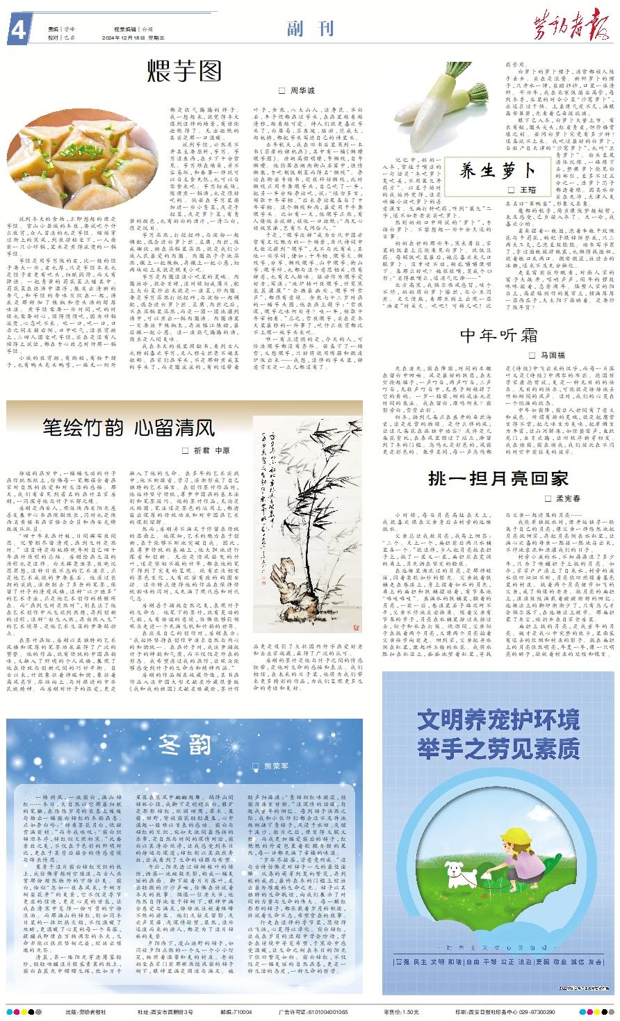 光在追光,霜在降霜,时间的车辙在留白中回响。风是最好的铁匠,在天空抡起锤子,一声叮当,两声叮当,三声叮当,无数声叮当中,无患子树褪掉了它的黄袍。一岁一枯荣,树的减法也是时间的乘法。我在留白,雁鸣何来?霜影旁白,雪骨出彩。 初冬,拍到几朵正在盛开的垂丝海棠,这是反常的物候。是什么样的风,让这几朵花在孤独中动容?或许是几朵花贪玩,在春风里错过了站点,滞留到了冬的门槛。鸟鸣也是彩色的,风霜更是彩色的。散步其间,每一声鸟鸣都是《诗经》中飞出来的汉字,而每一片落叶又是《诗经》中凋零的布匹。德国哲学家康德曾说,美是一种无目的的快乐。无目的的快乐,可能就是静静地去听松树间的风声。这时,我们的心灵在一个饱满的状态。 中年如霜降,霜让人世间有了意义和成色。所谓有趣的灵魂,就是把庸常变得不常,把乏味变为美味,把单调变为丰富,让山河解冻,如惊蛰雷声,鱼跃龙门,虫豸欢腾,让旧秩序新芽初发。我在读霜,霜在读我,我们彼此在不同的时空中前往美的彼岸。