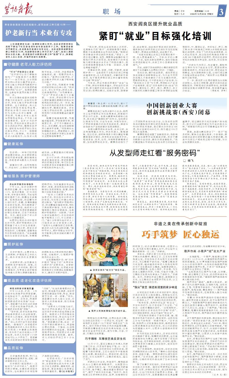 人社部最新发布的一批新职业新工种中,在养老护理员职业类别下新增了社区助老员和老年助浴员两个工种。随着养老需求不断变化,养老服务日益细分和专业化。与养老相关的新职业新工种超过15种,有的新职业新工种已正式“入编”,被纳入国家职业分类大典。养老服务行业新职业新工种“版图”扩大,拼凑起老年人安心养老、幸福享老的生活图景。■守健康 老年人能力评估师 “打分”评估助安心养老 “您平时可以自己穿脱衣服吗?”“您能够自己去厕所吗?”……东五环边,北京朝阳区光明山老年公寓评估室内,老年人能力评估师马爽和护士李冬梅,正给81岁的韩奶奶做即时评估“打分”。按照要求规范,这是每年度四次能力评估中的一次。 老人的身体健康状况和各项能力究竟如何、该如何科学养老,老年人能力评估师可提供帮助。这个新职业,由人社部联合国家市场监管总局、国家统计局于2020年发布。作为光明山养老公寓唯一的评估师,马爽从老年人服务与管理专业毕业,于今年上半年取得资质。总计21页的评估手册,评估内容主要包括日常生活活动评估、精神状态评估、感知觉与沟通评估以及社会参与评估,共4个一级指标和22个二级指标。而后再结合老人体检报告,以及老人现场平地走、上台阶、沙盘等设备设施测试,逐一观察评估老人的能力。“逐项打分和评估,汇总分数并评判老人属于哪种能力分级。” 每次评估,马爽和李冬梅将时间控制在约半小时。“时间太长,老人坐不住;时间太短,无法准确评估。”在马爽看来,“打分”评估老人能力十分重要。一方面,评估结果可为老人和家属提供清晰的自我认知和风险防控建议;另一方面,能为养老机构的服务及日常照料提供科学、精准的参考。老年人能力评估的结果,也是政府相关部门补贴政策覆盖的重要依据。 随着经验逐渐积累,马爽越来越发现,评估需要仔细,更需要艺术。对于不少高龄老人而言,表达清晰、反应快速和敞开心扉并不容易。“特别是有认知障碍的老人,更需要耐心,因为这关系到照护方案以及是否会变更等级等事项。”■健康延伸 陪诊师:一种专门陪同患者就医的职业,其主要职责包括陪同患者就医、提供情绪支持、协助患者与医务人员沟通等。 康复治疗师:运用物理治疗、作业治疗、言语治疗等手段或方法,从事康复治疗和训练的技术人员。 安宁疗护师:评估和处理患者的身体症状,密切观察患者的病情变化等,专门为生命末期患者及其家属提供身心照护和支持的专业人员。■增服务 照护管理师 系统关怀提供科学指导 下午4点,46岁的照护管理师陆亚静,骑上电动车按约上门。服务对象是一位78岁的大爷,常年患有肾病,目前每周固定透析三次,眼睛也无法看清。按规范流程,陆亚静为老人进行血压、血糖、血氧等基础生命体征监测,而后她探望了老人的居家环境,询问老人近期身体状况以及居家修脚或助浴等生活需求,记录下相关信息。当天,她还安排了老人所需的上门修脚服务。 与更早出现的养老护理员有所不同,照护管理师的工作更侧重于老人日常生活需求、身体状况监测分析、居家养老风险防控、心理情绪、康复等全方位系统性的服务。“比如最基本的生命体征的监测、采集和建档评估,为家属提供专业的照护、饮食、居家风险防控训练指导以及居家理发、按摩、助浴等日常服务需求对接。” “每次上门都要有系统的信息记录,而后统计分析老人的状况,为后续工作提出相应建议指导。”成为照护管理师以来,陆亚静越来越感觉到,相比于具体照护指导,为老人提供情绪和心理的安慰疏导,也是照护管理师的一大职责。“有老人非常信赖我们,会主动询问能不能哪天上门、什么时候上门。”她十分珍惜为每位老人上门服务的20分钟至半小时,“发现什么问题及时记录反馈,解决老人的生活实际问题。”她呼吁老人,照护管理应当尽早,而不能等出现状况或问题才寻求帮助。■照护延伸 养老护理员:从事老年人生活照料、护理服务工作的人员,是养老服务的主要提供者。 长期照护师:运用基本生活照料及护理知识、技能,在家庭、社区、养老机构、医疗机构等场所,为享受长期护理保险待遇人员等人群提供基本生活照料及与之密切相关的医疗护理、功能维护、心理照护等服务的从业人员。 认知障碍照护员:由“养老护理员”职业下的“失智老年人照护员”变更而来。主要职责是在养老机构、社区或其他相关场所工作照顾认知障碍老年人,提供日常照护服务。■提品质 适老化改造评估师 看现场听需求提高质量 中午12点多,忙活一上午的适老化改造评估师谢荻頔,在电脑前坐下,处理起手头没忙完的工作。近年来,西城区持续推进适老化改造“向前一步”,谢荻頔于去年经过培训成为一名适老化改造评估师,为家庭适老化改造“把脉”。 “简单说,适老化改造评估师就是依据老人的实际需要,评估老人的身体、居家环境等因素,以匹配老人的改造需求。”进入养老行业五年的谢荻頔说,一般情况下,有家庭适老化改造需求的老人会在相关小程序网络上申请提交改造需求,而后自己就会收到入户评估信息,与老人约定好上门时间就可以入户评估了。谢荻頔首先会花时间对居家环境现场“扫描”,“比如先看看屋内灯光如何、厨房是否有油渍、地面材质和防滑度如何等,卧室、厨房