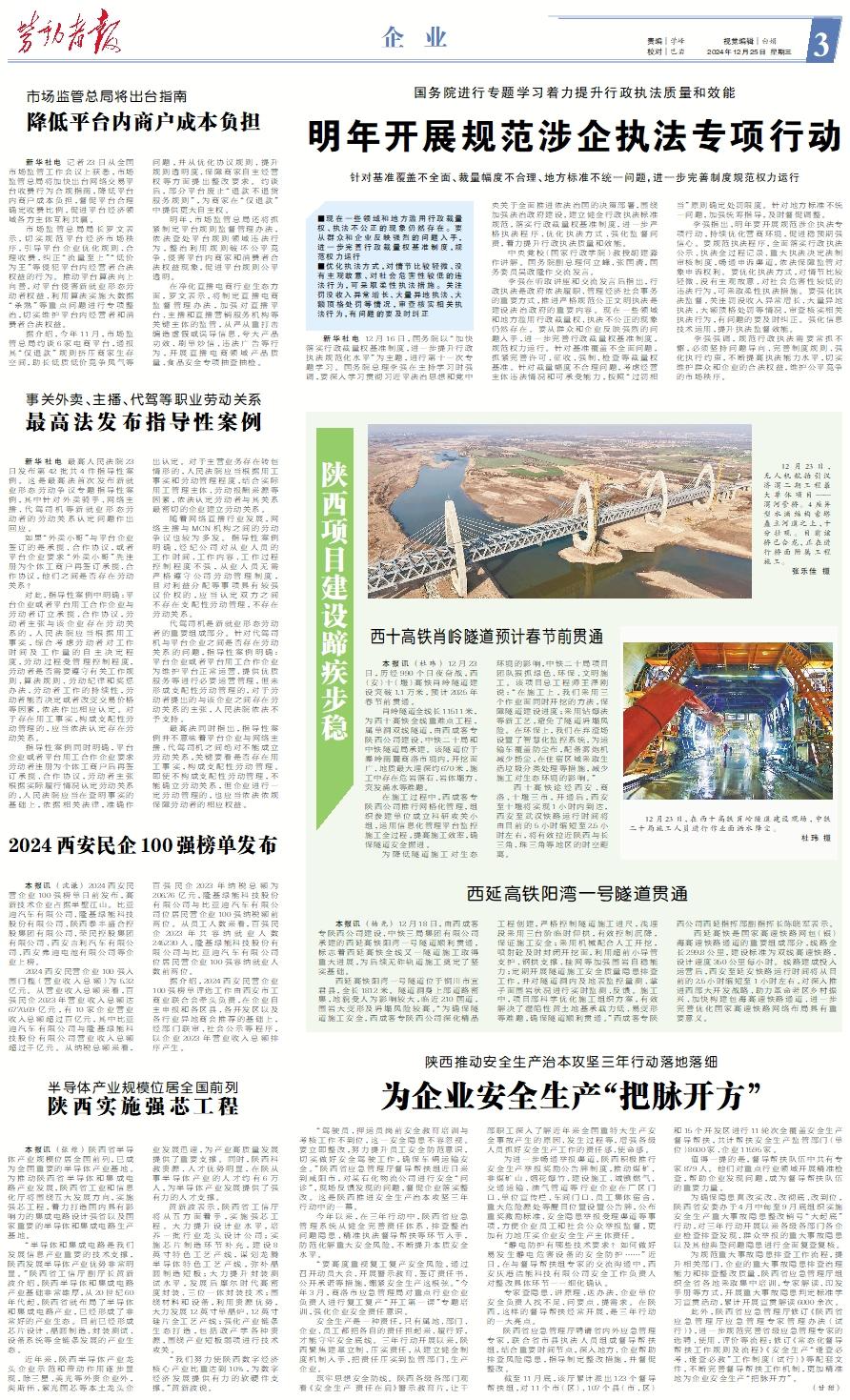 12月23日,无人机航拍引汉济渭二期工程最大单体项目——渭河管桥。4座异型水滴结构索塔矗立河道之上,十分壮观。目前该桥已合龙,正在进行桥面附属工程施工。 张乐佳 摄 12月23日,在西十高铁肖岭隧道建设现场,中铁二十局施工人员进行作业面洒水降尘。 杜玮 摄西十高铁肖岭隧道预计春节前贯通 本报讯 (杜玮) 12月23日,历经990个日夜奋战,西(安)十(堰)高铁肖岭隧道建设突破1.1万米,预计2025年春节前贯通。 肖岭隧道全线长11511米,为西十高铁全线重难点工程,属单洞双线隧道,由西成客专陕西公司建设、中铁二十局和中铁隧道局承建。该隧道位于秦岭南麓商洛市境内,开挖面广、地质最大埋深约670米,施工中存在危岩落石、岩体塌方、突发涌水等难题。 在施工过程中,西成客专陕西公司推行网格化管理,组织参建单位成立科研攻关小组,运用信息化管理平台监控施工全过程,提高施工效率,确保隧道安全掘进。 为降低隧道施工对生态环境的影响,中铁二十局项目团队狠抓绿色、环保、文明施工。该项目总工程师王泽刚说:“在施工上,我们采用三个作业面同时开挖的方法,保障隧道建设进度;采用钻爆法等新工艺,避免了隧道坍塌风险。在环保上,我们在弃渣场设置了智慧化监控系统,为运输车覆盖防尘布,配备雾炮机减少扬尘,在住宿区域采取生活垃圾分类处理等措施,减少施工对生态环境的影响。” 西十高铁途经西安、商洛、十堰三市,开通后,西安至十堰将实现1小时内到达,西安至武汉铁路运行时间将由目前的5小时缩短至2.5小时左右,将有效拉近陕西与长三角、珠三角等地区的时空距离。西延高铁阳湾一号隧道贯通 本报讯 (杨光) 12月18日,由西成客专陕西公司建设、中铁三局集团有限公司承建的西延高铁阳湾一号隧道顺利贯通,标志着西延高铁全线又一隧道施工取得重大进展,为后续无砟轨道施工奠定了坚实基础。 西延高铁阳湾一号隧道位于铜川市宜君县,全长1812米。隧道洞身上部道路密集,地貌受人为影响较大,临近210国道,围岩大变形及坍塌风险较高。“为确保隧道施工安全,西成客专陕西公司深化精品工程创建,严格控制隧道施工进尺,浅埋段采用三台阶临时仰拱,有效控制沉降,保证施工安全;采用机械配合人工开挖,喷射砼及时封闭开挖面,利用超前小导管支护、钢拱支撑、挂网等加强围岩自稳能力;定期开展隧道施工安全质量隐患排查工作,并对隧道洞内及地表监控量测、掌子面围岩状况进行实时监测、反馈。施工中,项目部科学优化施工组织方案,有效解决了湿陷性黄土地基承载力低、易变形等难题,确保隧道顺利贯通。”西成客专陕西公司西延指挥部副指挥长陈晓军表示。 西延高铁是国家高速铁路网包(银)海高速铁路通道的重要组成部分,线路全长299.8公里,建设标准为双线高速铁路,设计速度350公里每小时。线路建成投入运营后,西安至延安铁路运行时间将从目前的2.5小时缩短至1小时左右,对深入推进西部大开发战略、助力革命老区乡村振兴、加快构建包海高速铁路通道、进一步完善优化国家高速铁路网络布局具有重要意义。