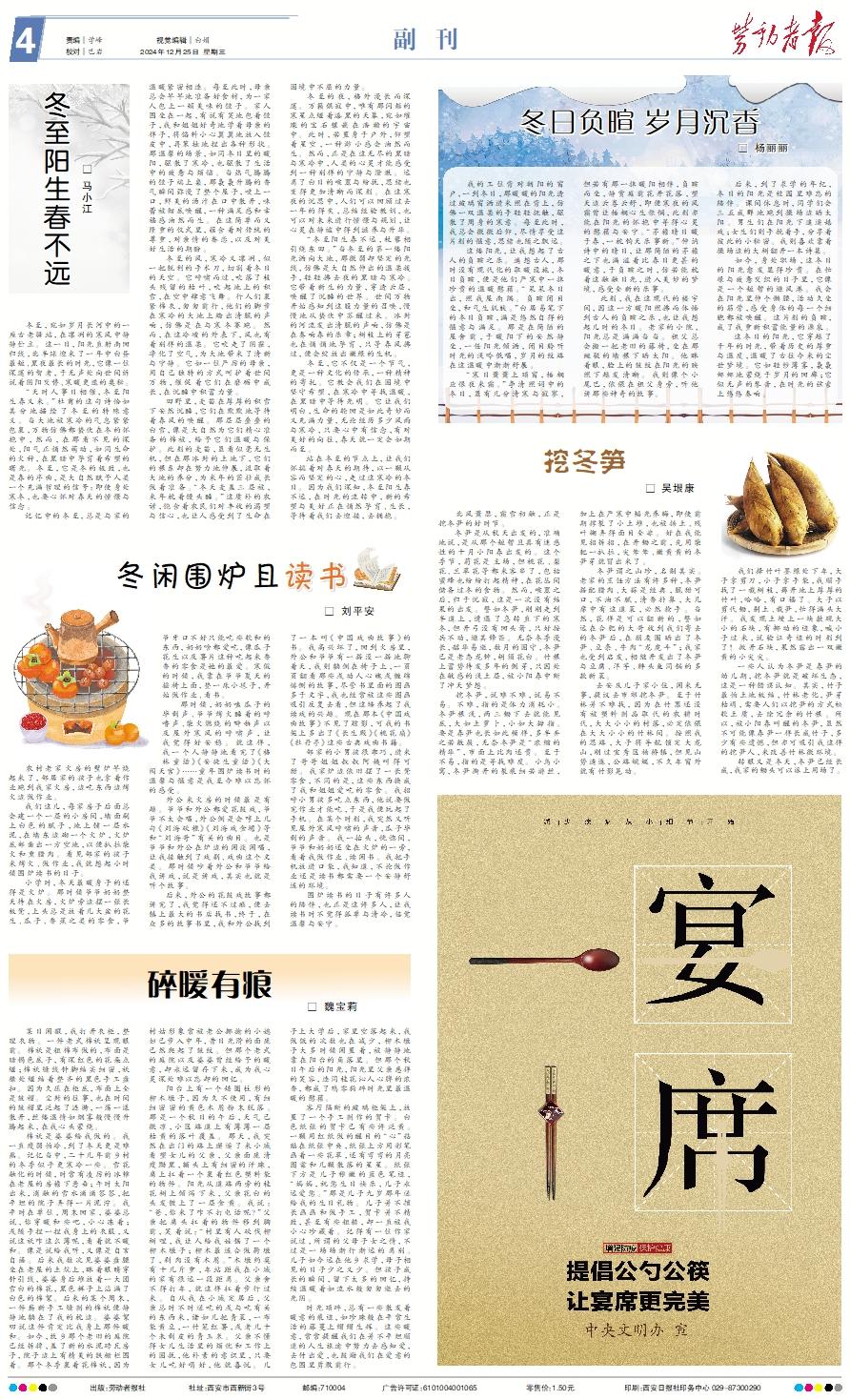 冬至,宛如岁月长河中的一座古老驿站,在凛冽的寒风中静静伫立。这一日,阳光直射南回归线,北半球迎来了一年中白昼最短、黑夜最长的时光,它像一位深邃的智者,于无声处向世间诉说着阴阳交替、寒暖更迭的奥秘。 “天时人事日相催,冬至阳生春又来。”杜甫的这句诗恰如其分地描绘了冬至的特殊意义。当大地被寒冷的气息紧紧包裹,万物仿佛都蛰伏在冬的怀抱中,然而,在那看不见的深处,阳气正悄然萌动,如同生命的火种,在黑暗中孕育着希望的曙光。冬至,它是冬的极致,也是春的序曲,是大自然赋予人类一个充满哲理的信号:即使身处寒冬,也要心怀对春天的憧憬与信念。 记忆中的冬至,总是与家的温暖紧密相连。每至此时,母亲总会早早地准备好食材,为一家人包上一顿美味的饺子。家人围坐在一起,有说有笑地包着饺子,我和姐姐好奇地学着母亲的样子,将馅料小心翼翼地放入饺皮中,再笨拙地捏出各种形状。那温馨的场景,如同冬日里的暖阳,驱散了寒冷,也驱散了生活中的疲惫与烦恼。当热气腾腾的饺子端上桌,那袅袅升腾的香气瞬间弥漫了整个屋子,咬上一口,鲜美的汤汁在口中散开,味蕾被彻底唤醒,一种满足感和幸福感油然而生。在这简单而又隆重的仪式里,蕴含着对传统的尊重,对亲情的眷恋,以及对美好生活的期盼。 冬至的风,寒冷又凛冽,似一把锐利的手术刀,切割着冬日的天空。它呼啸而过,吹落了枝头残留的枯叶,吹起地上的积雪,在空中肆意飞舞。行人们裹紧棉衣,匆匆前行,他们的脚步在寒冷的大地上踏出清脆的声响,仿佛是在与寒冬赛跑。然而,在这冷峻的外表下,风也有着别样的温柔。它吹走了阴霾,净化了空气,为大地带来了清新与宁静。它如一位严厉的母亲,用自己独特的方式呵护着世间万物,催促着它们在磨砺中成长,在沉睡中积蓄力量。 田野里,麦苗在厚厚的积雪下安然沉睡,它们在默默地等待着春风的唤醒。那层层叠叠的白雪,像是大自然为它们精心准备的棉被,给予它们温暖与保护。此刻的麦苗,虽看似毫无生机,但在那冰封的土地下,它们的根系却在努力地伸展,汲取着大地的养分,为来年的茁壮成长做着准备。“冬天麦盖三层被,来年枕着馒头睡。”这质朴的农谚,饱含着农民们对丰收的渴望与信心,也让人感受到了生命在困境中不屈的力量。 冬至的夜,格外漫长而深邃。万籁俱寂中,唯有那闪烁的寒星点缀着漆黑的天幕,宛如璀璨的宝石镶嵌在浩瀚的宇宙中。此时,若置身于户外,仰望着星空,一种渺小感会油然而生。然而,正是在这无尽的黑暗与寒冷中,人类的心灵才能感受到一种别样的宁静与澄澈。远离了白日的喧嚣与纷扰,思绪也变得更加清晰而深刻。在这寒夜的沉思中,人们可以回顾过去一年的得失,总结经验教训,也可以对未来进行憧憬与规划,让心灵在静谧中得到滋养与升华。 “冬至阳生春不远,杖藜相引绕东田。”当冬至的第一缕阳光洒向大地,那微弱却坚定的光线,仿佛是大自然伸出的温柔援手,轻轻拂去夜的黑暗与寒冷。它带着新生的力量,穿透云层,唤醒了沉睡的世界。世间万物开始感知到这股力量的召唤,慢慢地从蛰伏中苏醒过来。冰封的河流发出清脆的声响,仿佛是在奏响春的乐章;树枝上的芽苞也在悄悄地孕育,只等春风拂过,便会绽放出嫩绿的生机。 冬至,它不仅是一个节气,更是一种文化的传承,一种精神的寄托。它教会我们在困境中坚守希望,在寒冷中寻找温暖,在黑暗中等待光明。它让我们明白,生命的轮回是如此奇妙而又充满力量,无论经历多少风雨与寒冷,只要心中有信念,有对美好的向往,春天就一定会如期而至。 站在冬至的节点上,让我们怀揣着对春天的期待,以一颗从容而坚定的心,走过这寒冷的冬日。因为我们深知,冬至阳生春不远,在时光的流转中,新的希望与美好正在悄然孕育、生长,等待着我们去迎接,去拥抱。