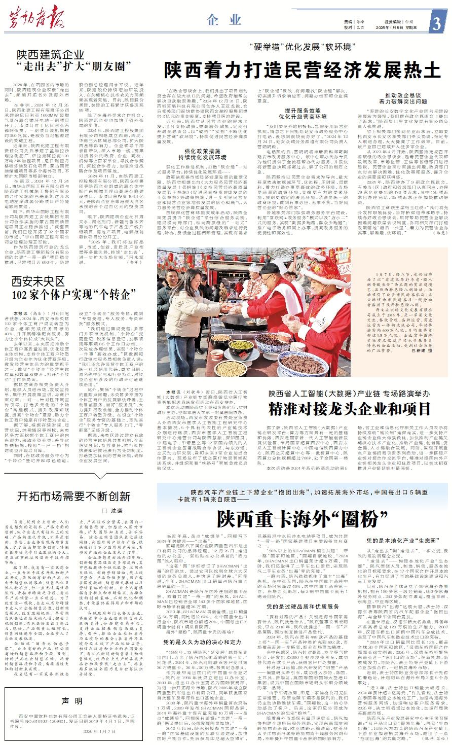 “在政企恳谈会上,我们提出了项目启动资金存在较大缺口的问题,希望政府能帮助解决贷款融资难题。”2024年12月31日,陕西特莱晶科技有限公司创办人王亚龙说,会后相关部门很快便协调陕西金融控股集团提供2亿元的资金额度,支持项目落地建设。 近年来,陕西省从民营企业的需求出发,出台支持政策,提高服务效能,定期召开政企恳谈会,以“硬招”“实招”不断优化提升营商“软环境”,持续促进民营经济高质量发展。强化政策措施持续优化发展环境 强化工作推进机制;打造“陕企通”一站式服务平台;持续优化发展环境…… 政策法规是市场经济健康发展的重要保障。陕西省相继出台《大力服务民营经济高质量发展十条措施》《支持民营经济高质量发展若干措施》《促进民间投资健康发展的十条举措》等政策措施,进一步引导民营企业和民营企业家增强发展的信心和底气,大力服务民营经济高质量发展。 围绕深化营商环境突破年活动,陕西全面拓展提升“陕企通”平台综合服务功能,建成横向跨部门、纵向跨层级的“一站式”服务平台,对企业反映的问题及诉求进行受理、转办、反馈全过程闭环管理,实现有需求上“陕企通”反映、有问题找“陕企通”解决,切实提升诉求响应率、问题办结率和企业满意度。提升服务效能优化升级营商环境 “我们要在外地招投标,急需使用新营业执照,情急之下只能给延安市政务服务中心打电话,没想到很快就办好了。”2024年12月24日,延安众诚劳务派遣有限公司负责人营娟娟说。 电话预约后,营娟娟将申请资料邮寄到延安市政务服务中心。该中心帮办代办专员为他们提供了全流程帮办代办服务,并很快将新营业执照邮寄过去,解了公司的燃眉之急。 陕西坚持以民营企业需求为导向,最大程度依法依规减环节、优流程、压时间、增便利,着力打造办事更高效的政务环境、市场更满意的政策环境、支撑更有力的要素环境、预期更稳定的法治环境、亲清更统一的政商环境,做到有事必应、无事不扰,当好民营企业的“贴心管家”。 各地相关部门加强政务服务平台建设,利用“互联网+政务服务”模式以及“店小二”式的服务,实现“数据多跑路,群众少跑腿”;推广电子政务和网上办事,提高政务服务的便捷性和高效性。推动政企恳谈着力破解突出问题 “筹建的长安数字文化产业园前期建设进展较为缓慢,我们便在政企恳谈会上提出了诉求。”陕西樊川里文化发展有限公司负责人张林说。 省上相关部门接到企业诉求后,立即委托西安市长安区相关部门牵头协调,指定专人跟进办理,大大提高了工作效率。目前,该产业园已建成并入驻多家企业。 从2023年4月开始,陕西坚持定期召开各层级的政企恳谈会,邀请民营企业代表和发展改革、市场监管、工信等省级部门进行恳谈。民营企业面对面提出问题,政府部门点对点解决困难,优化政策和服务,提升企业的满意度和获得感。 2024年,陕西举办了9期政企恳谈会。有关市(区)政府和省级部门认真回应、办理79家企业提出的170项诉求,其中135项诉求已办理完结,35项诉求正在加快推动解决。 陕西省工商联主席马玉红说:“我们将充分发挥职能优势,当好桥梁纽带和助手,持续办好政企恳谈会,用好帮助民营企业解决困难问题联席会议制度,协同相关部门打通政策落地‘最后一公里’,着力为民营企业办实事、解难题、优环境。” (郑斐)