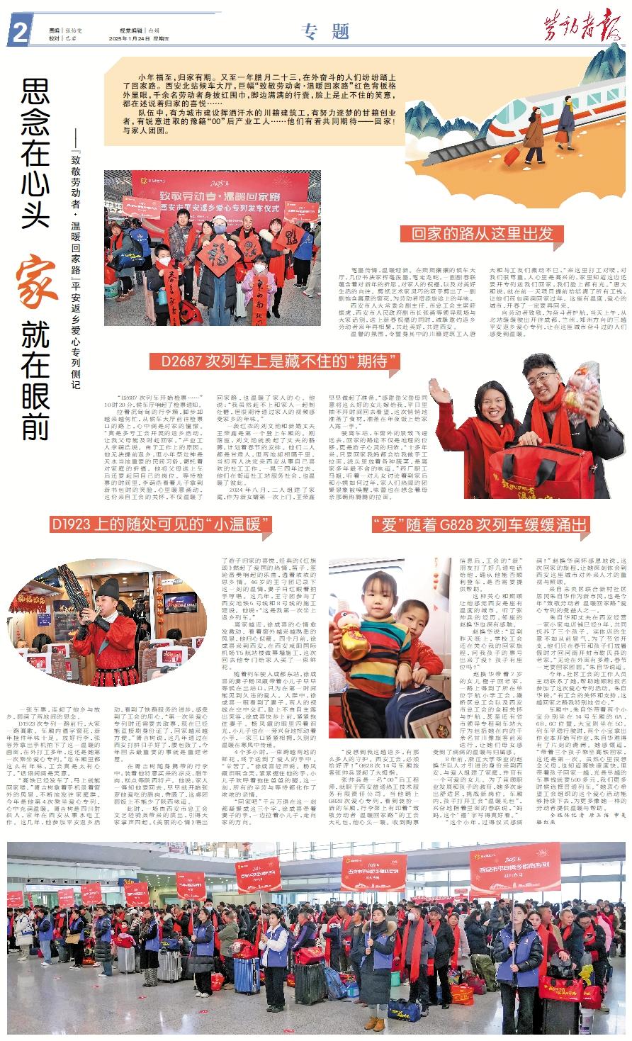 小年福至,归家有期。又至一年腊月二十三,在外奋斗的人们纷纷踏上了回家路。西安北站候车大厅,巨幅“致敬劳动者·温暖回家路”红色背板格外显眼,千余名劳动者身披红围巾,脚边满满的行囊,脸上是止不住的笑意,都在述说着归家的喜悦…… 队伍中,有为城市建设挥洒汗水的川籍建筑工,有努力逐梦的甘籍创业者,有锐意进取的豫籍“00”后产业工人……他们有着共同期待——回家!与家人团圆。回家的路从这里出发 笔墨传情,温暖迎新。在熙熙攘攘的候车大厅,几位书法家挥毫泼墨,笔走龙蛇,一副副春联蕴含着对新年的祈愿,对家人的祝福,以及对美好生活的向往。剪纸艺术家灵巧的双手剪出了一副副饱含寓意的窗花,为劳动者增添旅途上的年味。 西安市人大常委会副主任、市总工会主席薛振虎,西安市人民政府副市长张涌等领导现场与大家话别,送上新春祝福的同时,诚挚邀约返乡劳动者来年再相聚,共赴美好,共建西安。 温馨的氛围,令置身其中的川籍建筑工人唐大和与工友们激动不已,“来这里打工对喽,对我们很尊重,人心里是高兴的,家里知道这边还要开专列送我们回家,我们脸上都有光。”唐大和说,就在前一天项目提前给结清了所有工钱,让他们荷包满满回家过年。这座有温度、爱心的城市,开春了一定要再回来。 向劳动者致敬,为奋斗者护航,当天上午,从北站缓缓驶出开往成都、兰州、郑州方向的三趟平安返乡爱心专列,让在这座城市奋斗过的人们感受到温暖。D2687次列车上是藏不住的“期待” “D2687次列车开始检票……”10时20分,候车厅响起了检票通知。 拉着沉甸甸的行李箱,脚步却越来越匆忙,从候车大厅前往检票口的路上,心中满是对家的憧憬。“真是多亏工会开展的返乡活动,让我父母能及时赶回家。”产业工人李萌浩说。由于工作上的原因,他无法提前返乡,但小年祭灶神是天水当地重要的民间习俗,寄托着对家庭的祈福。他将父母送上车后还要赶回自己的岗位。等待检票的时间里,李萌浩看着儿子拿到新书包时的笑脸,心里暖意涌动,这份来自工会的关怀,不仅温暖了回家路,也温暖了家人的心。他说:“我虽然赶不上和家人一起制灶糖,但很期待通过家人的视频感受家乡的年味。” 一袭红衣的刘文艳和新婚丈夫王荣鑫是第一个登上车厢的。刚落座,刘文艳就挽起了丈夫的胳膊,计划着春节的安排。他们二人都是甘肃人,但两地却相隔千里。当初两人决定来西安从事自己喜欢的社工工作,一晃三四年过去,他们在街道社工站服务社会,也温暖了彼此。 2024年八月,二人组建了家庭,作为新女婿第一次上门,王荣鑫早早做起了准备。“感谢岳父岳母同意将这么好的女儿嫁给我,平日里抽不开时间回去看望,这次悄悄地准备了食材,准备在年夜饭上给家人露一手。” 驶离车站,车窗外的景致飞速远去,回家的路途不仅是地理的位移,更是游子心灵的归依。“十多年来,只要回家我妈都会给我做手工拉面,浇头里放着各种蔬菜,是离家多年最不舍的味道。”药厂职工马姐,听着一对儿女讨论着到家后和小姨如何过年,家人们热闹的团聚景象被唤醒,味蕾也在想念着母亲那碗热腾腾的拉面。D1923上的随处可见的“小温暖” 一张车票,连起了他乡与故乡,圆满了两地间的思念。 D1923次专列一路前行,大家一路高歌。车厢内福字窗花、新年挂件年味十足。放好行李,张容芳拿出手机拍下了这一温暖的画面,在外打工多年,这还是她第一次乘坐爱心专列。“连车厢里都这么有年味,工会真是太有心了。”话语间满是笑意。 “高铁已经发车了,马上就能回家喽。”胥吉树拿着手机录着窗外的风景,不断地发往家庭群。今年是他第4次乘坐爱心专列,心中充满温暖。胥吉树是四川射洪人,常年在西安从事水电工作。这几年,他参加平安返乡活动,看到了铁路服务的进步,感受到了工会的用心,“第一次坐爱心专列时还需要去取票,现在已经能直接刷身份证了,回家越来越方便。”胥吉树说,这几年通过在西安打拼日子好了,腰包鼓了,今年回去最重要的事就是重建老屋。 在胥吉树随身携带的行李中,装着他特意买来的凉皮、腊牛肉、糕点等陕西特产。他说,家人一得知他要回去,早早就开始张罗他爱吃的腊肉、香肠了,这桌团圆饭上不能少了陕西味道。 此时,一场由西安市总工会文艺轻骑兵带来的演出,引得大家掌声四起。《美丽的心情》唱出了游子归家的喜悦,经典的《红旗颂》燃起了爱国的热情,笛子、笙轮番奏响起的乐曲,透着浓浓的思乡情。46岁的王守团记录下这一刻的温情,妻子肖红跟着拍手哼唱。这几年,王守团参与了西安地铁5号线和8号线的施工建设。他说:“这是我第一次坐上返乡列车。” 离家越近,徐成喜的心情愈发激动。看着窗外越来越熟悉的风景,他归心似箭。四个月前,徐成喜来到西安,在西安咸阳国际机场T5航站楼做幕墙施工,这次回去他专门给家人买了一束鲜花。 随着列车驶入成都东站,徐成喜的妻子杨凤霞带着小儿子早早等候在出站口,只为在第一时间能见到久违的爱人。人群中,徐成喜一眼看到了妻子,两人的视线在空中交汇,脸上不由自主露出笑容,徐成喜快步上前,紧紧抱住妻子。杨凤霞的眼里闪着泪光,小儿子也在一旁兴奋地挥动着小手,一家三口紧紧相拥,久别的温暖在寒风中传递。 4个多小时,一束跨越两地的鲜花,终于送到了爱人的手中。“辛苦了