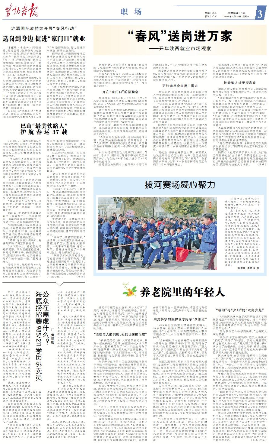 新春伊始,陕西各地积极开展“春风行动”,为求职者与企业搭建沟通桥梁,全力促进就业,保障民生。 在服务返乡农民工、脱贫人口、高校毕业生等群体就业的“春风行动”中,广大求职者与用人单位实现了“双向奔赴”,让众多求职者在重点项目、重点企业中实现了“一技傍身天地宽”。开在“家门口”的招聘会 春风拂面,阳光正好。2月6日下午,在西安市雁塔区隋大兴唐长安城明德门遗址公园,西安市“春风行动”专场招聘活动吸引众多求职者参加。 对于春节后参加的首场招聘会,西安文理学院美术学专业大四学生翟敬华格外看重。“之前,社区已经在微信群里向大家发送了这场招聘会信息。在家的时候,我就对自己的简历进行了完善。”翟敬华说。 活动当天,翟敬华早早来到招聘会现场。虽然是美术学专业出身,但性格外向的她还是决定找一份不仅具有挑战性,还能锻炼人的工作。 “今天来的企业非常多,岗位种类也很丰富。我主要关注的是销售、行政等岗位,投了几份简历,现场面试感觉还不错,希望开年后在求职路上能有一个好的收获。”翟敬华说。 本次专场招聘活动共邀请到兰州市、苏州市、运城市、铜川市、商洛市等城市组团来西安参会,与会的305家企业共提供了1.5万余个就业岗位。 招聘活动由陕西省人社厅等8个部门共同组织实施,于1月中旬至3月中旬在全省范围内开展。 西安市人社局就业促进处处长廉宏彬介绍,西安市将在“春风行动”期间举办不少于350场次的线上线下招聘活动,提供市场化就业岗位15万个。更好满足企业用工需求 春节前夕,江苏瑞尔隆鼎实业有限公司人力资源部就提前布局了新一年的招聘计划。以苏陕协作为契机,该公司早早就定下了来陕参加“春风行动”的计划。 “我们每年都会通过‘春风行动’向江苏输送一定数量的劳务人员。”2月7日,参加渭南市跨区域劳务协作专场招聘会的江苏瑞尔隆鼎实业有限公司人力资源部工作人员王娜说,此次招聘中,公司提供了多个就业岗位,尽可能满足当地群众外出务工需求和企业用工需求。 陕西省人社厅相关负责人介绍,开展“春风行动”是扎实做好春节前后劳动者换岗流动高峰期和企业开工复产关键期就业服务的重点工作。今年,陕西将支持组建劳务协作区域联盟,持续推进苏陕劳务协作、省内劳务协作和省际劳务协作,推出综合性大型招聘和区域联合招聘活动,支持劳动力人口密度大的县(区)、乡镇与园区企业开展劳务合作。 稳就业、保就业是民生大事。从三秦大地发出的外出务工专列、专车,已经成为陕西省各地每年“春风行动”的“标配”。在紫阳县火车站,载着1300余名修脚师的务工专列于2月5日缓缓开出。 根据部署,在全省“春风行动”中,各地各相关部门深入辖区用工需求较多的重点企业,建立重点企业清单和联系对接机制,了解并掌握春节前后开工计划和用工需求,着力解决招工难题。技能型人才更受青睐 渭南人雷安持有电梯操作证、消防设施操作员证等多个技能岗位证书。他计划在春节后换一份工作。 “现场看到许多招聘技能岗位的信息,自己多几个证,找工作心里也踏实。”在渭南市跨区域劳务协作专场招聘会上,雷安坦言,如今的招聘市场对技能型人才更加认可。 随着经济发展和产业升级,技能型人才在招聘市场上受到许多用工单位的青睐。“相较于学历,我们更看重求职者的个人技术能力,希望招来的人能够尽快上手项目。”比亚迪股份有限公司第十一事业部工作人员李双说。 今年陕西各地“春风行动”招聘现场,劳务品牌的展位前人数较往年有明显增多。在西安市“春风行动”启动仪式现场的“高陵汽车工匠”“周至园艺师”等劳务品牌展位前,咨询报名的求职者络绎不绝。 “符合国家相关政策,求职者还可以免费参加技能培训。”陕西汽车技工学校工作人员王蕊娟说。 陕西省人社厅相关负责人介绍,为打造劳务品牌就业“金名牌”,陕西还将推出一批薪资待遇高、收入稳定性强的高质量就业岗位,开设劳务品牌及劳务品牌引领单位招聘专区,更好助力技能人才求职。 (周明)