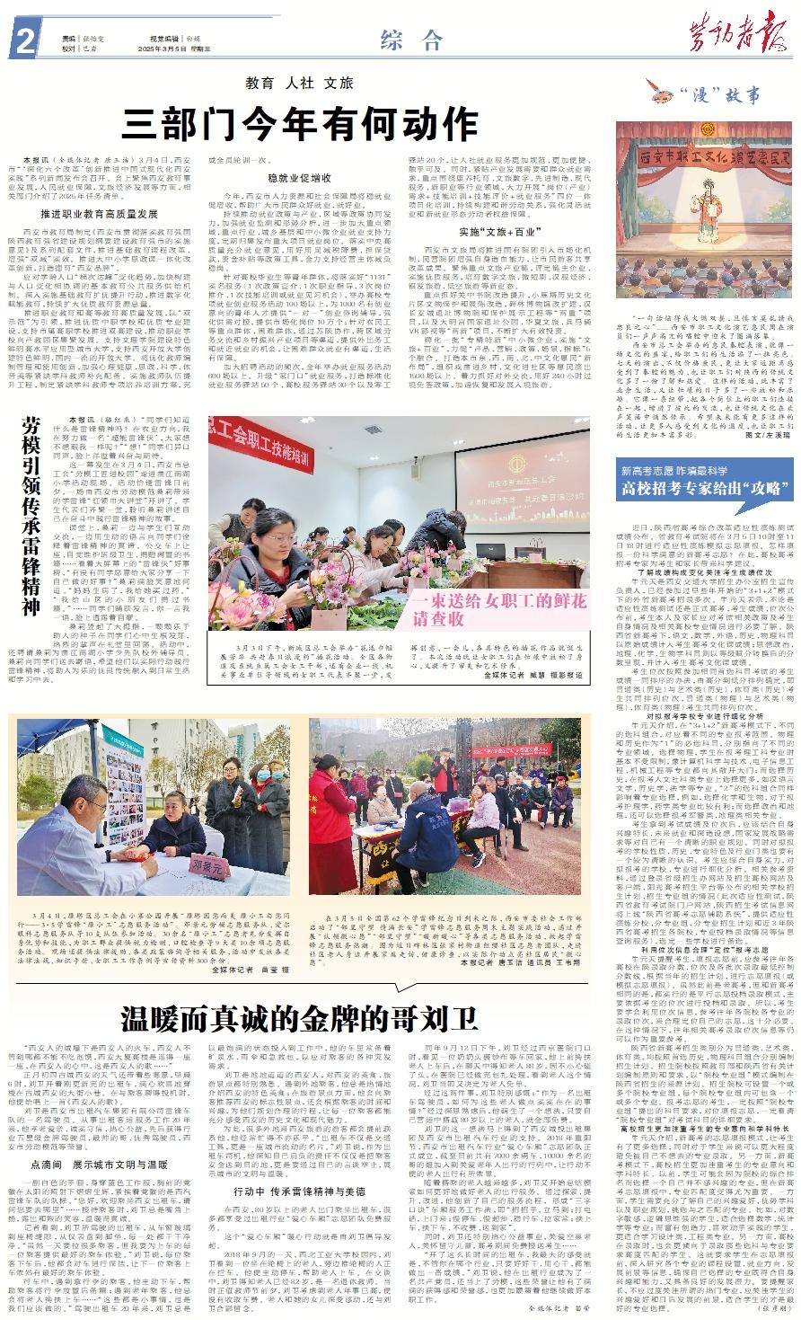 本报讯 (全媒体记者 唐玉洁) 3月4日,西安市“‘深化六个改革’创新推进中国式现代化西安实践”系列新闻发布会召开。会上聚焦西安教育事业发展,人民就业保障,文旅经济发展等方面,相关部门介绍了2025年任务清单。推进职业教育高质量发展 西安市教育局制定《西安市贯彻落实教育强国陕西教育强省建设规划纲要建设教育强市的实施意见》及系列配套文件,推进基础教育课程改革、增强“双减”实效。推进大中小学思政课一体化改革创新,打造德育“西安品牌”。 应对学龄人口“梯次达峰”变化趋势,加快构建与人口变化相协调的基本教育公共服务供给机制。深入实施基础教育扩优提升行动,推进数字化赋能教育,持续扩大优质教育资源总量。 推进职业教育和高等教育高质量发展,以“双示范”为引领,推进优质中职学校和优质专业建设,支持市属高职学校推进双高建设,推动职业学校向产教园区集聚发展。支持文理学院建设特色鲜明高水平应用型城市大学,支持西安开放大学创建特色鲜明、国内一流的开放大学。将优化教师编制管理和使用创新,加强心理健康、思政、科学、体音美等紧缺学科教师补充配备。实施教师队伍提升工程,制定紧缺学科教师专项培养培训方案,完成全员轮训一次。稳就业促增收 今年,西安市人力资源和社会保障局将稳就业促增收,帮助广大市民群众好就业、就好业。 持续推动就业政策与产业、区域等政策协同发力,加强就业监测和形势分析,进一步加大重点领域、重点行业、城乡基层和中小微企业就业支持力度,定期归集发布重大项目就业岗位。落实中央高质量充分就业意见,用好用足减税降费、担保贷款、资金补贴等政策工具,全力支持经营主体减负稳岗。 针对高校毕业生等青年群体,将落实好“1131”实名服务(1次政策宣介、1次职业指导、3次岗位推介、1次技能培训或就业见习机会),举办高校专项就业创业服务活动100场以上,为1000名有创业意向的青年人才提供“一对一”创业咨询辅导,强化供需对接,提供市场化岗位10万个;针对农民工等重点群体、困难群体,通过苏陕协作、跨区域劳务交流和乡村振兴产业项目等渠道,提供外出务工和就近就业的机会,让困难群众就业有渠道、生活有保障。 加大招聘活动的频次,全年举办就业服务活动600场以上。升级“家门口”就业服务,打造标准化就业服务驿站50个、高校服务驿站30个以及零工驿站20个,让人社就业服务更加规范、更加便捷、触手可及。同时,紧贴产业发展需要和群众就业需求,重点围绕康养托育、文旅数字、先进制造、现代服务、新职业等行业领域,大力开展“岗位(产业)需求+技能培训+技能评价+就业服务”四位一体项目化培训,持续构建和谐劳动关系,强化灵活就业和新就业形态劳动者权益保障。实施“文旅+百业” 西安市文旅局将推进国有院团引入市场化机制、民营院团增强自身造血能力,让市民游客共享改革成果。聚焦重点文旅产业链,评定链主企业、实施优质服务,培育数字文旅、微短剧、汉服经济、银发旅游、低空旅游等新业态。 重点抓好关中书院改造提升,小雁塔历史文化片区文物保护和展陈改造,碑林博物馆改扩建,汉长安城遗址博物院和保护展示工程等“两重”项目,以及大明宫国家遗址公园、华夏文旅、兵马俑VR影视等“两新”项目,不断扩大有效投资。 孵化一批“专精特新”中小微企业,实施“文旅+百业”,力促“产品、营销、政策、场景、指标”5个融合。打造本市东、西、南、北、中文化惠民“新布局”,组织戏曲进乡村、文化进社区等惠民演出1500场以上。着力抓好对外交流,用好240小时过境免签政策,加速恢复和发展入境旅游。