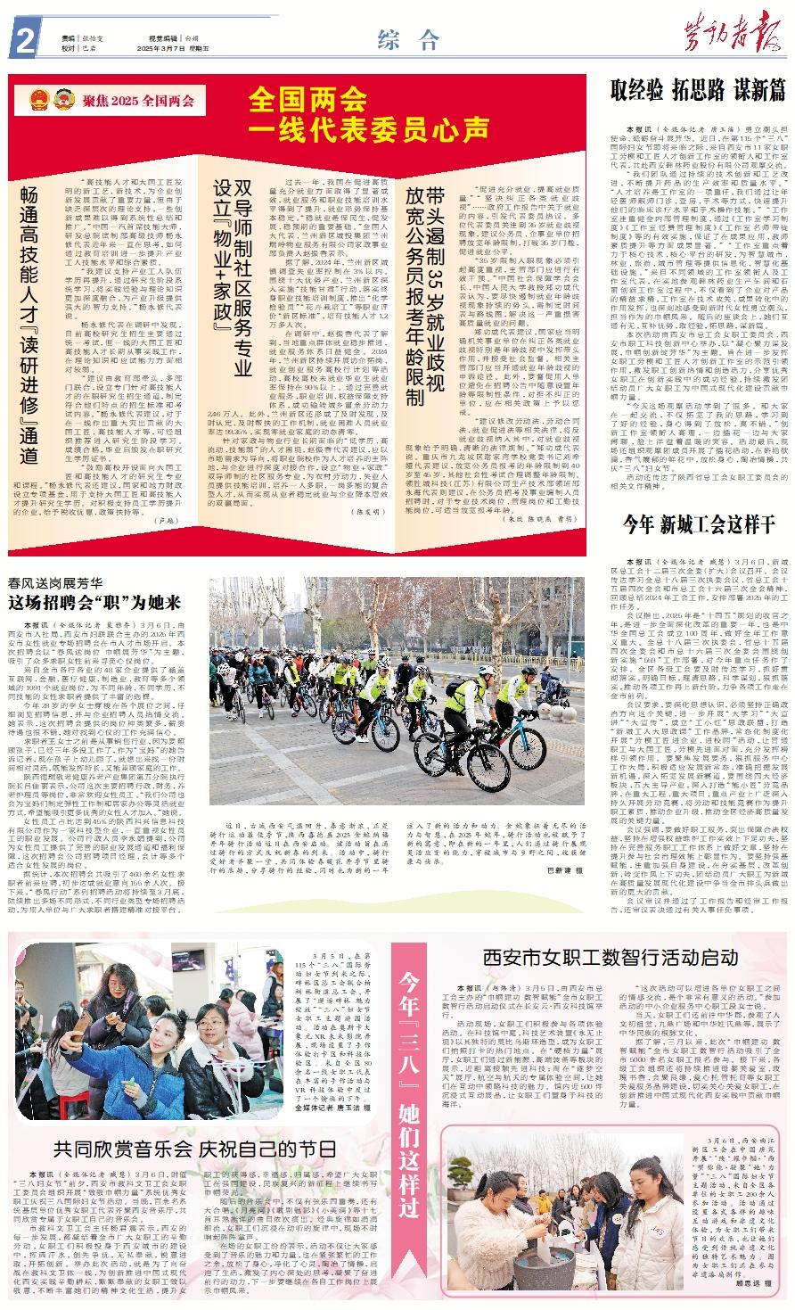 畅通高技能人才“读研进修”通道 “高技能人才和大国工匠发明的新工艺、新技术,为企业创新发展贡献了重要力量,但由于缺乏深层次的理论支持,一些创新成果难以得到系统性总结和推广。”中国一汽首席技能大师、研发总院试制部高级技师杨永修代表近年来一直在思考,如何通过教育培训进一步提升产业工人技能水平和综合素质。 “我建议支持产业工人队伍学历再提升,通过研究生阶段系统学习,将实践经验与理论知识更加深度融合,为产业升级提供强大的智力支持。”杨永修代表说。 杨永修代表在调研中发现,目前高校研究生招生主要通过统一考试,但一线的大国工匠和高技能人才长期从事实践工作,在理论知识和应试能力方面相对较弱。 “建议由教育部牵头、多部门联合,设立专门针对高技能人才的在职研究生招生通道,制定符合他们特点的招生标准和考试内容。”杨永修代表建议,对于在一线作出重大突出贡献的大国工匠、高技能人才等,可经组织推荐进入研究生阶段学习。成绩合格,毕业后颁发在职研究生学历证书。 “鼓励高校开设面向大国工匠和高技能人才的研究生专业和课程。”杨永修代表还建议,国家和地方财政设立专项基金,用于支持大国工匠和高技能人才提升研究生学历。对积极支持员工学历提升的企业,给予税收优惠、政策扶持等。 (卢越)设立“物业+家政”双导师制社区服务专业 过去一年,我国在促进高质量充分就业方面取得了显著成效,就业服务和职业技能培训水平得到了提升,就业形势保持基本稳定。“稳就业是保民生、促发展、稳预期的重要基础。”全国人大代表、兰州新区城投集团兰州瑞岭物业服务有限公司家政事业部负责人赵振香表示。 据了解,2024年,兰州新区城镇调查失业率控制在3%以内。围绕十大优势产业,兰州新区深入实施“技能甘肃”行动,落实终身职业技能培训制度,推出“化学检验员”“花卉栽培工”等职业评价“新区标准”,培育技能人才1.2万多人次。 在调研中,赵振香代表了解到,当地重点群体就业稳步推进,就业服务体系日益健全。2024年,兰州新区持续开展访企拓岗、就业创业服务高校行计划等活动,高校离校未就业毕业生就业率保持在90%以上。通过完善就业服务、职业培训、权益保障支持体系,成功输转城乡富余劳动力2.46万人。此外,兰州新区还形成了及时发现、及时认定、及时帮扶的工作机制,就业困难人员就业率达99.35%,实现零就业家庭的动态清零。 针对家政与物业行业长期面临的“低学历、高流动、技能弱”的人才困境,赵振香代表建议,应以市场需求为导向,将职业院校作为人才培养的主阵地,与企业进行深度对接合作,设立“物业+家政”双导师制的社区服务专业,为农村劳动力、失业人员提供技能培训,培养一人多职、一岗多能的复合型人才,从而实现从业者稳定就业与企业降本增效的双赢局面。 (陈发明)放宽公务员报考年龄限制 带头遏制35岁就业歧视 “促进充分就业、提高就业质量”“坚决纠正各类就业歧视”……政府工作报告中关于就业的内容,引发代表委员热议。多位代表委员关注到35岁就业歧视现象,建议公务员、企事业单位招聘放宽年龄限制,打破35岁门槛,促进就业公平。 “35岁限制入职现象必须引起高度重视,主管部门应进行有效干预。”中国社会保障学会会长、中国人民大学教授郑功成代表认为,要尽快遏制就业年龄歧视现象持续的势头,需制定时间表与路线图,解决这一严重损害高质量就业的问题。 郑功成代表建议,国家应当明确机关事业单位在纠正各类就业歧视特别是年龄歧视中发挥带头作用,并接受社会监督。相关主管部门应当开通就业年龄歧视的申诉途径。此外,要督促用人单位避免在招聘公告中随意设置年龄等限制性条件,对拒不纠正的单位,应在相关政策上予以惩戒。 “建议修改劳动法、劳动合同法、就业促进法等相关法律,将反就业歧视纳入其中,对就业歧视现象给予明确、清晰的法律规制。”郑功成代表说。重庆市九龙坡区谢家湾学校党委书记刘希娅代表建议,放宽公务员报考的年龄限制到40岁至45岁,其他社会性考试合理调整年龄限制。领胜城科技(江苏)有限公司生产技术部领班邵永海代表则建议,在公务员招考及事业编制人员招聘时,对于专业技术岗位、管理岗位和工勤技能岗位,可适当放宽报考年龄。 (朱欣 陈晓燕 曹玥)