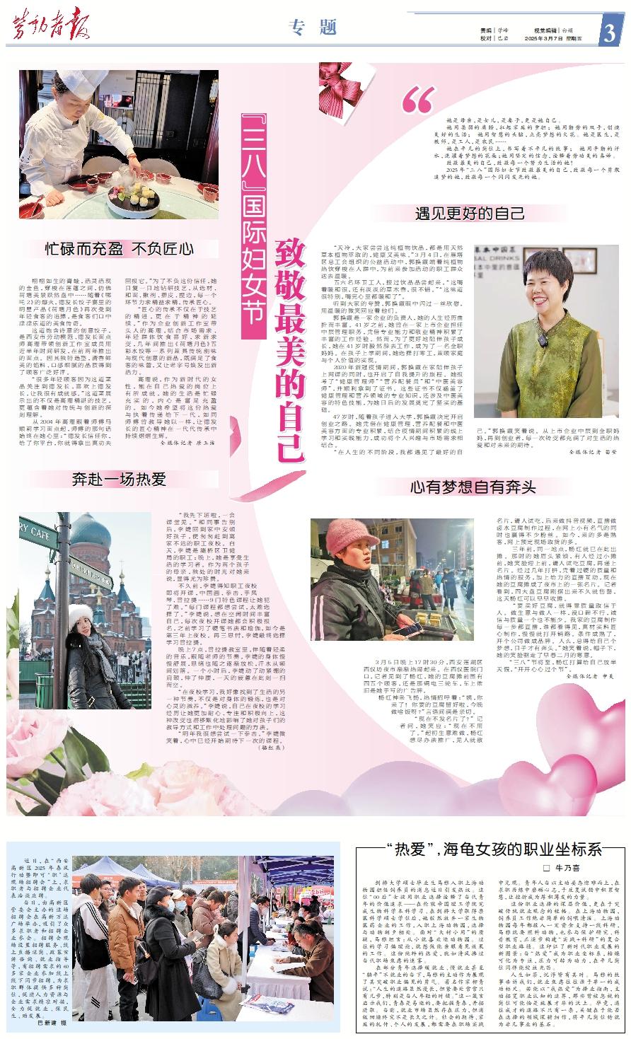 她是母亲,是女儿,是妻子,更是她自己。 她用柔弱的肩膀,扛起家庭的重担; 她用勤劳的双手,创造美好的生活; 她用智慧的头脑,点亮梦想的火花。她是医生,是教师,是工人,是农民…… 她在平凡的岗位上,书写着不平凡的故事; 她用辛勤的汗水,浇灌着梦想的花朵;她用坚定的信念,诠释着劳动美的真谛。 致敬最美的自己,致敬每一个努力生活的她! 2025年“三八”国际妇女节致敬最美的自己,致敬每一个勇敢追梦的她,致敬每一个闪闪发光的她。忙碌而充盈 不负匠心 栩栩如生的青蛙,活灵活现的金鱼,穿梭在莲蓬之间,仿佛荷塘美景跃然盘中……随着《哪吒2》的爆火,德发长饺子宴里的明星产品《荷塘月色》再次受到年轻食客的追捧,是食客们口中津津乐道的美食传奇。 这道饱含诗意的创意饺子,是西安市劳动模范、德发长面点师高珊带领创新工作室成员用近半年时间研发,在前两年推出的面点。因其独特造型,清香鲜美的馅料、口感细腻的品质得到了顾客广泛好评。 “很多年轻顾客因为这道菜品关注到德发长,喜欢上德发长,让我很有成就感。”这道菜展示出的不仅是高珊精湛的技艺,更蕴含着她对传统与创新的深刻理解。 从2004年高珊跟着师傅马顺莉学习面点起,师傅的那句话始终在她心里:“德发长信任你,给了你平台,你就得拿出真功夫回报它。”为了不负这份信任,她日复一日地钻研技艺,从选材、和面、揪剂、擀皮、捏边,每一个环节力求精益求精,传承匠心。 “匠心的传承不仅在于技艺的精进,更在于精神的延续。”作为企业创新工作室带头人的高珊,结合市场需求、年轻群体饮食喜好,求新求变,几年间推出《荷塘月色》五彩水饺等一系列兼具传统韵味与现代创意的新品,既满足了食客的味蕾,又让老字号焕发出新活力。 高珊说,作为新时代的女性,能在自己热爱的岗位上有所成就,她的生活是忙碌充实的,内心是富足充盈的。如今她希望将这份热爱与执着传递给下一代,如同师傅曾教导她以一样,让德发长的匠心精神在一代代传承中持续熠熠生辉。 全媒体记者 唐玉洁奔赴一场热爱 “我先下班啦,一会课堂见。”和同事告别后,李婕回到家中安顿好孩子,便匆匆赶到离家不远的职工夜校。白天,李婕是灞桥区卫健局的职工;晚上,她是享受生活的学习者。作为两个孩子的母亲,独处的时光对她来说,显得尤为珍贵。 不久前,李婕得知职工夜校即将开课,中国画、拳击、手风琴、普拉提……9门特色课程让她犯了难。“每门课程都想尝试,太难选择了。”李婕说,想在空闲时间丰富自己,每次夜校开课她都会积极报名,之前学习了硬笔书法和瑜伽,如今是第三年上夜校。再三思忖,李婕最终选择学习普拉提。 晚上7点,普拉提教室里,伴随着轻柔的音乐,跟随老师的节奏,李婕的身体慢慢舒展,思绪也随之逐渐放松,汗水从额间划落。一个小时后,李婕动了动紧绷的肩颈,伸了伸腰,一天的疲惫在此刻一扫而空。 “在夜校学习,我好像找到了生活的另一种节奏,不仅是对身体的锻炼,也是对心灵的滋养。”李婕说,自己在夜校的学习经历让她更加耐心、专注和积极向上,这种改变也潜移默化地影响了她对孩子们的教导方式和工作中处理问题的方法。 “明年我很想尝试一下拳击。”李婕微笑着,心中已经开始期待下一次的课程。 (骆红燕)遇见更好的自己 “天冷,大家尝尝这纯植物饮品,都是用天然草本植物萃取的,健康又美味。”3月4日,在雁塔区总工会组织的公益活动中,郭换霞端着纯植物热饮穿梭在人群中,为前来参加活动的职工群众送去温暖。 五六名环卫工人,接过饮品品尝起来,“这喝着暖和很,还有淡淡的草木香,很不错。”“这味道很特别,喝完心里都暖和了”。 听到大家的夸赞,郭换霞眼中闪过一丝欣慰,用温暖的微笑回应着他们。 郭换霞是一家企业的负责人,她的人生经历曲折而丰富。41岁之前,她曾在一家上市企业担任中层管理职务,凭借专业能力和敬业精神积累了丰富的工作经验。然而,为了更好地陪伴孩子成长,她在41岁时毅然辞去工作,成为了一名全职妈妈。在孩子上学期间,她选择打零工,兼顾家庭与个人价值的实现。 2020年新冠疫情期间,郭换霞在家陪伴孩子上网课的同时,也开启了自我提升的旅程。她报考了“健康管理师”“营养配餐员”和“中医美容师”,并顺利拿到了证书。这些证书不仅涵盖了健康管理和营养领域的专业知识,还涉及中医美容的特色技能,为她日后的发展奠定了坚实的基础。 47岁时,随着孩子进入大学,郭换霞决定开启创业之路。她凭借在健康管理、营养配餐和中医美容方面的专业积累,结合疫情期间积累的线上学习和实践能力,成功将个人兴趣与市场需求相结合。 “在人生的不同阶段,我都遇见了最好的自己。”郭换霞笑着说。从上市企业中层到全职妈妈,再到创业者,每一次转变都充满了对生活的热爱和对未来的期待。 全媒体记者 苗莹心有梦想自有奔头 3月5日晚上17时30分,西安莲湖区西仪坊夜市渐渐热闹起来。在西仪医院门口,记者见到了杨红,她的豆腐摊前围有四五个顾客,还是那辆电三轮车,车上依旧是她手写的广告牌。 杨红神采飞扬,热情招呼着:“姨,你来了!你要的豆腐留好啦,今晚做啥饭呀?”言语间满是亲切。 “现在不发名片了?” 记者问,她笑应:“现在不用了。”起初生意难做,杨红想尽办法推广,见人就散名片,请人试吃,