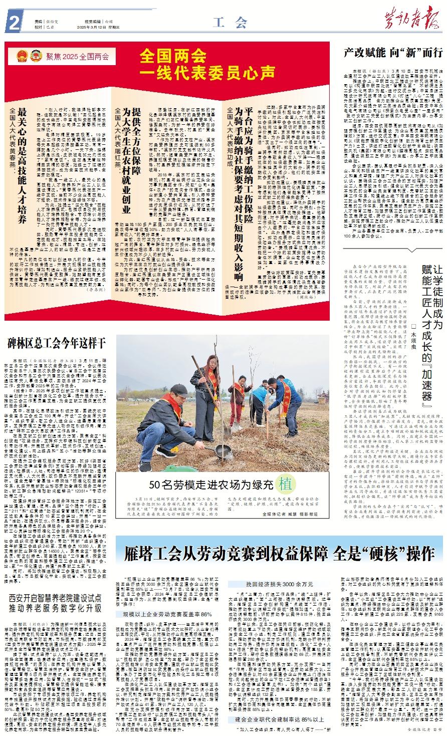 全国人大代表黄春燕:最关心的是高技能人才培养 “刚入行时,我连焊枪都拿不稳,但我就是不认输!”回忆起自己的成长经历,中国电科安徽博微长安电子有限公司焊工黄春燕代表这样说。 电焊对精度要求极高。19岁走上工作岗位的黄春燕代表坚持每天早起练习焊接基本功,常常一蹲就是几个小时。一天下来,胳膊上满是水泡,皮肤被电弧光灼伤成了“家常便饭”。但正是凭着这种精益求精的态度,她练出了过硬的焊接技术,成为全国技术能手、全国劳动模范。 “我是一线工人,最关心的是高技能人才培养和产业工人队伍建设情况。”黄春燕代表在生产一线中发现,当前不少企业高技能人才短缺,技术传承延续性不够。 为此,她提出“四大融合”技能人才培养模式,包括项目攻关与技能人才培养相融合、专项培训与技能人才培养相融合等,为企业培养了一批优秀青年技能人才。 同时,黄春燕代表多次走进校园,鼓励青年学生投身技能岗位,走技能成才、技能报国之路。在她看来,敬业、精益、专注、创新,这不仅是基层产业工人的职业态度,也是工匠精神的传承。 平凡的岗位也可以创造非凡的价值。今年的政府工作报告提出,开展大规模职业技能提升培训行动,增加制造业、服务业紧缺技能人才供给。黄春燕代表备受鼓舞,她期望能有更多有志青年走进基层生产一线,练就过硬本领,成为高技能人才,为制造业高质量发展贡献力量。 (李春剑)全国人大代表屠红燕:为大学生在农村就业创业提供全方位保障 惊蛰过后,在浙江西部的开化县华埠镇溪东村的桑蚕养殖基地,农户们正忙着整备养蚕车间、修剪桑树,为新一年的养蚕做好准备。去年秋天,村里的“黄金茧”又迎来大丰收。 “作为村里的支柱产业,溪东村桑蚕养殖历史可追溯到50多年前。”溪东村党支部书记许义凤说,然而,随着桑蚕产量的不足、养殖规模受限以及低廉的销售价格,村里养蚕规模逐渐开始走下坡路。 2018年,溪东村的发展迎来转机:村里与丝绸行业龙头企业万事利集团合作,采取“公司+集体+农户”的定向合作模式,由企业新建小蚕共育室、引入特种蚕种,为农户提供无偿技术指导并进行兜底保价收购,从而打造了一条从蚕桑种植、养育、管理到销售的完整产业链条。 目前,这一新型模式已直接带动当地150多户家庭、200多名农民就地创业,桑农每年增收超30%,助力实现“人人有事做,家家有收入”的美好愿景。 当前,农村正为大学生等青年群体提供越来越广阔的舞台,青年群体对乡村振兴、绿色经济等新兴领域兴趣浓厚,在乡村就业创业、努力实现人生价值成为不少人的新选择。 为此,屠红燕建议从土地、资金、技术等全方位为大学生在农村就业创业提供保障。 为打造优良创新创业生态,推动产学研用深度融合,屠红燕建议在桑蚕主产区建设区域性创业孵化器,配套专业设备,形成“产学研用”一体化基地;同时,为每个创业团队配备高校教授和实战企业家作为“双导师”,为创业者提供全方位的指导和支持。全国人大代表郑功成:为骑手缴纳社保要考虑对其短期收入影响 平台应为骑手缴纳工伤保险 近期,多家平台宣布为外卖骑手缴纳社保引起社会广泛关注和讨论。对此,全国人大代表、中国社会保障学会会长郑功成在接受央视网记者采访时表示,要积极评价美团、京东等平台承担社会责任,为外卖骑手缴纳社保的做法“发出了一个很正向的信号”。 但同时,郑功成也注意到,一些骑手有所顾虑,认为缴纳社保后会导致自身收入下降——根据现在的社保缴费费率,如果企业不承担其中的大部分,骑手的短期收入会减少,他们的现实生活就会受到影响。 郑功成建议,要根据灵活就业群体的特殊性优化调整政策,“要考虑到他们是否能承受得了按照正式职工的标准来缴费”。 郑功成建议,降低外卖骑手的社保缴费负担,同时分类别、分险种按照具体情况稳妥推进。他举例道,对于骑手来说,最重要的是工伤保险,“这毫无疑问是不应该由个人缴费的,平台应该承担责任”。此外是养老保险和医疗保险。郑功成表示,应该用灵活的保险经办服务方式来应对灵活的劳动者。“要根据客观情况来,不能把一个好的政策实施得让劳动者也不满意,企业老板也觉得负担加重,国家也觉得事情没办好。” 要让好政策落实好,首先要尊重劳动者的意愿,郑功成表示,要根据骑手的具体情况决定是否参保——全职骑手与平台构成事实的劳动关系,按照现行的法律应该参加,对于灵活就业者需要保留选择权。 (阚纯裕)