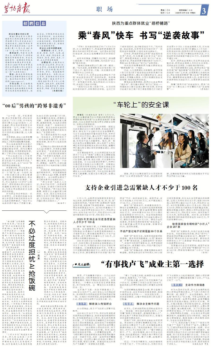 “叮咚!您有新的回收订单!”3月4日9时,在AI语音提示下,西咸新区建章路社区群众冯兴涛打开手机APP。这位患有夜盲症的创业者,此刻正处理着新的旧衣回收订单。 赶早市卖熟食,顶着烈日打零工,深夜蹲守摆地摊……由于视力障碍,冯兴涛的“打工路”格外坎坷。 “最怕天没亮就要出门,路上深一脚浅一脚。”冯兴涛说,他要照料年迈的母亲和上初三的儿子,离不开家,只能一次次婉拒社区推荐的外出工作机会。 “去年12月,社区就业创业群发布了开展‘就业服务进社区’活动的信息。我觉得机会来了。”冯兴涛回忆,活动现场,他看中了一家专做旧衣物、鞋包回收的AI科技公司,决定自己创业当老板。 “居民可以在网上自助下单。AI会对回收衣服的新旧、面料等自动审核。这份工作干起来很轻松,每月能增收近千元。”冯兴涛说,创业期间,社区专员还为他介绍了一次性创业补贴政策,让他对未来充满信心。 近年来,西咸新区通过开展“就业服务进社区”活动,先后邀请1530家企业“进社区”,帮助更多残疾人实现“家门口”就业。截至目前,西咸新区累计提供岗位15264个,帮助500余名群众在“家门口”实现增收。 冯兴涛的故事是陕西为重点群体就业“搭桥铺路”的一个缩影。 日前,人力资源和社会保障部、教育部等7部门印发《关于健全创业支持体系提升创业质量的意见》,提出面向高校毕业生、就业困难人员等重点群体,分型分类提供创业支持保障,促进创业带动就业。 聚焦就业困难群体,陕西打出就业帮扶“组合拳”,助力重点群体“家门口”创业——明确创办小微企业或从事个体经营,且所创企业或个体工商户自工商注册登记之日起正常运营6个月以上的就业困难人员,可向创业所在地县级人社部门申请每人1万元的一次性创业补贴;鼓励符合条件的就业困难人员向当地人社部门申请创业担保贷款,个人创业担保贷款额度不超过30万元,贷款期限不超过3年。 此外,陕西就业困难人员还享有就业技能培训、招用就业困难人员单位社会保险、灵活就业社会保险、公益性岗位等补贴。 为了将好政策落在实处,陕西实现从“输血兜底”到“造血赋能”的民生跃迁——扶风县创新“1345”工作法,实现困难人员稳定就业;西安市莲湖区搭建“秦云优服”智慧帮扶平台,精准帮助就业困难人员;安康市将劳务品牌转化为就业名片,让更多群众就近就业。 乘着“春风行动”的就业快车,更多“冯兴涛”在三秦大地上书写着自己的“逆袭故事”…… (李旭佳)