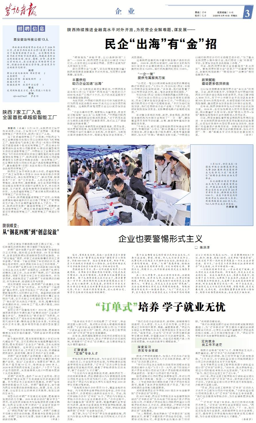 “我非常庆幸自己当初选择了‘订单班’,毕业时直接入职公司。我对现在的收入和福利待遇很满意。”宁波市轨道交通集团有限公司(以下简称“宁波轨道交通公司”)职员、西安交通工程学院2021届“订单班”毕业生张晨曦说。 近年来,陕西高校紧密结合地方经济和社会发展需求,以就业为导向,建立产学研结合的长效机制,积极推行“订单式”培养模式,全力推进毕业生充分高质量就业。 汇聚资源 “定制”专业人才 学校利用教学资源优势,为企业培养可以直接上岗的员工;企业发挥技术优势,为学校提供实践教学环境与实训师资。“订单式”培养让学生快速掌握实用技能的同时,提高了学校师资队伍的水平,解了企业的“人才之渴”。 “今天的汽车底盘维修技术课,是陕西省五一劳动奖章获得者、西安唐都进口汽车修理服务有限公司技术总监乌军河为我们上的。他讲的知识非常实用!”西安汽车职业大学汽车服务专业2201班学生任昊对笔者说。 “我校现有校企合作项目73个,覆盖全校所有专业。汽车相关专业是学校的特色专业,合作企业包含国产、合资和进口品牌的主流车企。目前,我们开设校企合作‘订单班’15个。”西安汽车职业大学校企合作办公室主任高奇表示,“合作过程中,我们注重发展‘双师型’教师,侧重聘请行业专家作为讲师,或由企业委派技术专家到学校授课,确保教学内容与岗位需求相匹配。同时,学校定期派教师到‘订单班’企业参加培训。” 据了解,为让“订单班”学生快速掌握技能,西安汽车职业大学每年邀请企业共同制定人才培养方案。 “我们会将企业的新技术、新材料、新标准等引进教材、引入课堂、引入人才培养方案,让学生在真实工作环境中真学、真做,掌握真本领。”西安汽车职业大学智能汽车与工程学院院长王放向记者介绍,“截至目前,企业为‘订单班’的师生提供教学车辆40余辆、价值逾2500万元的教学设备。为保证教学设备与市场同步,企业还会根据产品上市的周期更换、补充新的教学车辆和设备。” 深度实习 夯实专业技能 深化产学研深度融合,加强人才培养与产业发展相匹配的应用技术型人才培养体系建设,是“订单式”培养的意义所在。 “你们公司这块土地现在的使用状况和未来发展规划是什么呢?”3月1日一大早,新兰特房地产资产评估有限公司的实习资产评估助理刘相君到西咸新区的一家客户公司进行资产审查。 他迅速核对公司的营业执照等证件,并对公司提供的资产资料逐一核查……“刘相君对业务很熟悉,一上午就协助我们顺利完成了资产评估申报表填写,理清了本次评估范围的资产目录。”客户对刘相君的业务能力高度赞赏。 刘相君是西安培华学院2021级会计与金融学院“订单联培班”的学生。 自2017年起,西安培华学院会计与金融学院开设的“订单联培班”先后与新兰特房地产资产评估有限公司、中和资产评估有限公司陕西同盛分公司等评估机构在人才培养、课程建设、产学研合作等方面进行合作,建立新兰特、中和同盛等8个“订单联培班”实践基地。 “大二寒假起,我就开始在‘订单联培班’实践基地实习,积累了丰富的资产评估业务经验。公司领导对我很认可,希望我毕业后能在新兰特任职。”刘相君自豪地说。 “我们在深度挖掘行业前沿动态和实践案例的基础上,为‘订单联培班’学生提供丰富的实训课程和实习机会,让学生在实践中掌握资产评估业务的核心技能,在工作岗位能快速上手。”西安培华学院会计与金融学院副院长孟君说。 定向就业 找工作不迷茫 根据企业需求“定制”人才,保障毕业生充分、高质量就业,是“订单式”培养的最终目的。 “快毕业的时候,我已经早早被宁波地铁录取。”2月28日,在宁波轨道交通公司线网调度分公司工作的调度员支有平告诉笔者。 支有平是西安交通工程学院首届宁波轨道交通公司“订单班”的学生。“2020年,我从学校毕业,通过公司的验收考核后在这里就职。”支有平说,“如今,我已经在这里工作了近5年。” 2017年,西安交通工程学院与宁波轨道交通公司首次签订共建“订单班”协议,双方联合进行人才培养,宁波轨道交通公司对学员进行考核验收,合格者可直接入职。 “目前,西安交通工程学院‘订单班’培养的人才有不少已成为公司的中流砥柱。”宁波轨道交通公司相关负责人对“订单班”的毕业生非常满意,“我们也会继续与学校合作,为企业储备更多优秀人才。” “‘订单班’开设7年多来,我们已陆续培养数百名学生,‘订单班’的学生就业率接近100%。”西安交通工程学院相关负责人表示,“下一步,我们还会加强与企业联系,定期组织学生去企业参观、实习,确保学生所学技能与岗位需求实现无缝对接,为企业奠定坚实的专业人才基础。” (郭诗梦)
