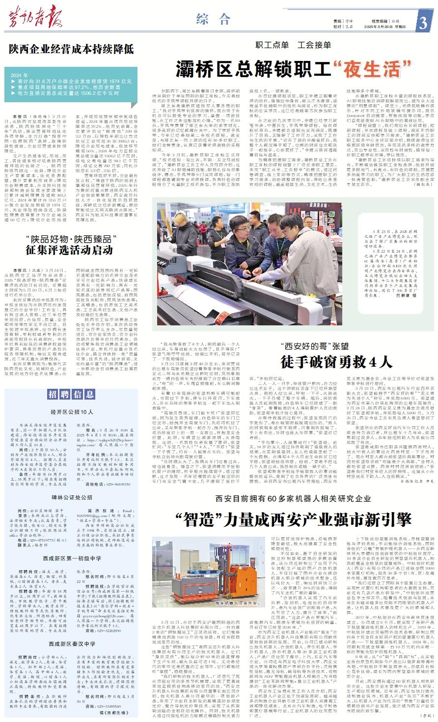 3月12日,在位于西安浐灞国际港的西安达升机器人科技集团有限公司,一台台高2米的“钢铁搬运工”正灵活运转。它们能够精准地抓取150公斤的电容器,并将其稳稳地运至目的地。 这些“钢铁搬运工”是西安达升机器人科技集团有限公司生产的抱夹机器人。它们“身形灵活”,能以每分钟50米的速度穿梭于生产车间,最大负载可达1吨。无论是轻巧的零件还是沉重的工业部件,它们都能轻松“拿捏”,稳稳搬运。 “我们研制的抱夹机器人,广泛替代了现在普遍应用的多关节机械臂,实现了更高效率地直接抓住物品移动至目的地。”西安达升机器人科技集团有限公司董事长赵江民介绍,抱夹机器人是公司最早的一项创新产品,采用了企业自主研发的高精度动态视觉定位、复合导航定位等技术,实现了从抓取到运输的全程自动化操作。同时,抱夹机器人通过伺服电机的力矩模式精确控制夹紧力可以更好地保护物品,将破损率降至最低,极大地提高了安全性和稳定性。 不仅如此,基于自主研发的独立控制器和成熟的多模态算法,该公司还研制出了应用于汽车装配生产线的国产合装机器人,不仅打破了国外企业在移动机器人细分领域的技术壁垒,还以吨位大一倍、响应时间快三分之一、效率提升20%的优势,得到了汽车主机厂商的青睐。 “合装机器人实现了汽车前后桥、发动机、电池包的自动举升,是汽车总装厂的刚需产品,大大节省了人力,提升了效率。”赵江民说,“这款产品在智能汽车、新能源汽车、燃油车领域均有很好的销量,目前订单已排至2026年。” 作为西安工业机器人产业链的“链主”企业,西安达升机器人科技集团有限公司始终坚持创新驱动发展。目前,公司已成功研制出抱夹机器人、合装机器人、牵引机器人、举升机器人、协作机器人等20多款工业机器人,产品广泛应用于海尔、上汽、长安汽车等企业。公司还与西安电子科技大学、西安交通大学等高校搭建产学研合作平台,凭借惯性导航、激光导航、磁导航等先进技术,将物联网与AGV智能搬运机器人相融合,为市场提供“工业互联网智能+复杂工业机器人”产品的一体化解决方案。 西安市工信局有关工作人员介绍,西安工业机器人产业正处于快速发展期。越来越多的制造企业开始引进工业机器人来提高工效和降低成本。尤其在汽车制造、电子制造和医疗器械等行业,工业机器人的应用更为广泛。 上下肢运动康复训练系统、脊柱康复训练与评估系统、手功能综合训练系统、国际首创的“云榻”智能护理机器人……在西安碑林环大学硬科技创新街区的中航创世展厅,10余款企业自主研发的智慧康养机器人,构筑起覆盖全场景的康复矩阵。中航创世机器人(西安)有限公司的产品已进驻全国3000余家医疗机构,服务30多个省(市、区)及海外市场,惠及数百万患者。 “我们还建立了国际首个康复云生态圈,实现针对医疗机构和患者的大数据支持,目前还有几款产品在研发中。”中航创世运营总监李士祥表示,随着技术创新与发展,未来会有越来越多应用到不同场景的机器人产品,让机器人技术惠及更广大的领域和人群。 2017年,中航创世在西安市碑林区注册成立。公司成立6个月,便实现了首研产品下肢康复训练机器人的样机生产。2019年,中航创世成功突破国外技术垄断,研制出国内首个完全自主知识产权的康复医疗机器人产品——下肢康复训练机器人。2024年,公司顺利完成全球第一台10万元机内床椅一体的智能免陪护自理机器人。 8年来,从“0”到“1”再到“N”,从实验室首台原型机到如今产品出口俄罗斯等海外市场,中航创世不断发展壮大,形成自有核心竞争优势,成长为国内智慧康养领域的领军企业。 目前,西安拥有超过60家机器人相关研究企业。这些企业主要集中在机器人研发、生产和应用领域。近年来,西安加快打造先进制造业强市,机器人产业“队伍”不断扩大,以机器人产业为代表的“智造”力量将引领推动新兴产业发展,使之成为西安产业强市建设的新引擎。 (李妮)