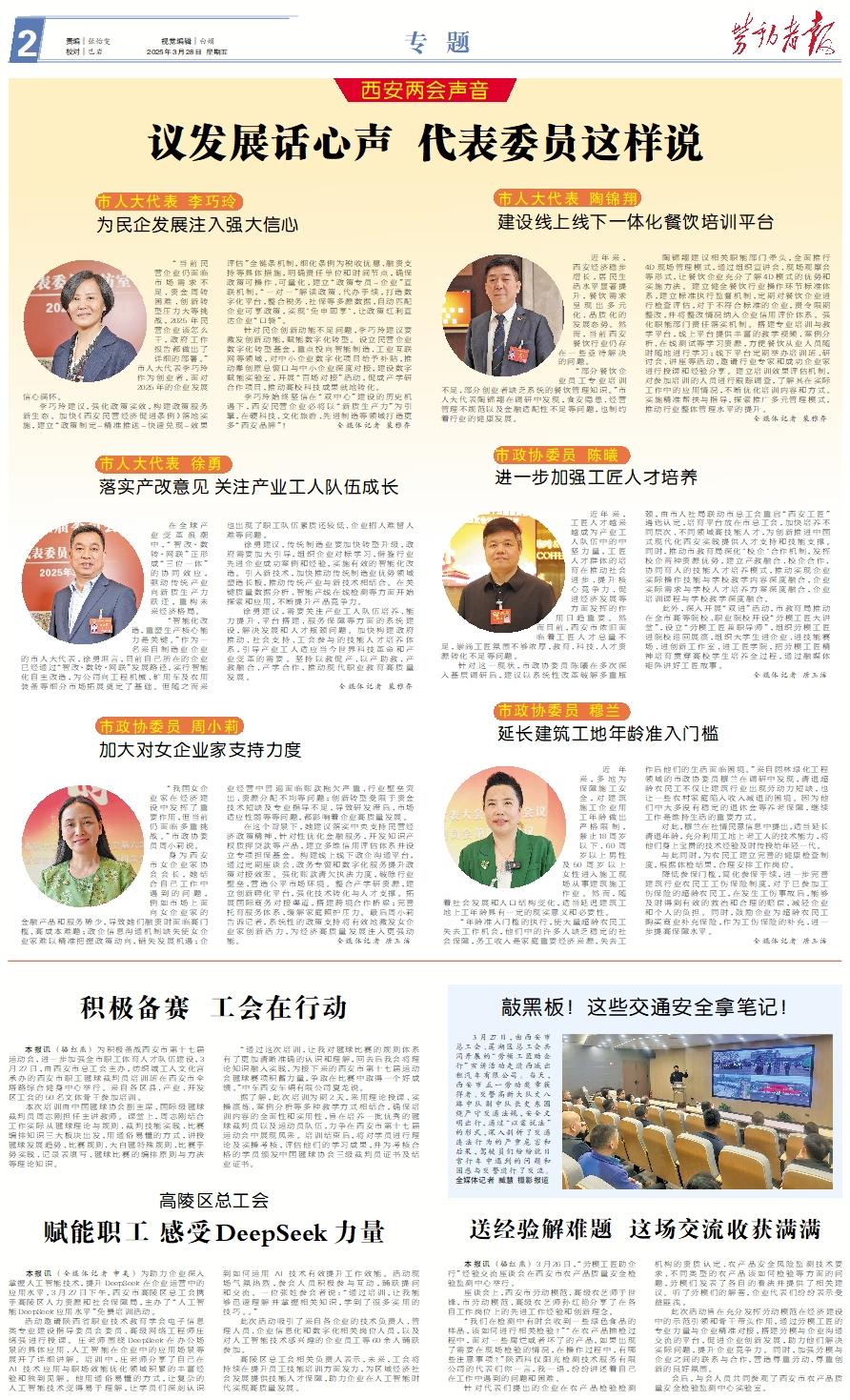 市人大代表 李巧玲为民企发展注入强大信心 “当前民营企业仍面临市场需求不足、资金周转困难、创新转型压力大等挑战,2025年民营企业该怎么干,政府工作报告都做出了详细的部署。”市人大代表李巧玲作为创业者,面对2025年的企业发展信心满怀。 李巧玲建议,强化政策实效,构建政策服务新生态。加快《西安民营经济促进条例》落地实施,建立“政策制定-精准推送-快速兑现-效果评估”全链条机制,细化条例为税收优惠、融资支持等具体措施,明确责任单位和时间节点,确保政策可操作、可量化,建立“政策专员-企业”直联机制,“一对一”解读政策、代办手续,打造数字化平台,整合税务、社保等多源数据,自动匹配企业可享政策,实现"免申即享",让政策红利直达企业“口袋”。 针对民企创新动能不足问题,李巧玲建议要激发创新动能,赋能数字化转型。设立民营企业数字化转型基金,重点投向智能制造、工业互联网等领域,对中小企业数字化项目给予补贴,推动秦创原总窗口与中小企业深度对接,建设数字赋能实验室,开展“百场对接”活动,促成产学研合作项目,推动高校科技成果就地转化。 李巧玲始终坚信在“双中心”建设的历史机遇下,西安民营企业必将以“新质生产力”为引擎,在硬科技、文化旅游、先进制造等领域打造更多“西安品牌”! 全媒体记者 裴雅乔市人大代表 陶锦翔 建设线上线下一体化餐饮培训平台 近年来,西安经济稳步增长,居民生活水平显著提升,餐饮需求呈现出多元化、品质化的发展态势。然而,当前西安餐饮行业仍存在一些亟待解决的问题。 “部分餐饮企业员工专业培训不足、部分创业者缺乏系统的餐饮管理知识。”市人大代表陶锦翔在调研中发现,食安隐患、经营管理不规范以及金融适配性不足等问题,也制约着行业的健康发展。 陶锦翔建议相关职能部门牵头,全面推行4D现场管理模式,通过组织宣讲会、现场观摩会等形式,让餐饮企业充分了解4D模式的优势和实施方法。建立健全餐饮行业操作环节标准体系,建立标准执行监督机制,定期对餐饮企业进行检查评估,对于不符合标准的企业,责令限期整改,并将整改情况纳入企业信用评价体系。强化职能部门责任落实机制。搭建专业培训与教学平台,线上平台提供丰富的教学视频、案例分析、在线测试等学习资源,方便餐饮从业人员随时随地进行学习;线下平台定期举办培训班、研讨会、讲座等活动,邀请行业专家和成功企业家进行授课和经验分享。建立培训效果评估机制,对参加培训的人员进行跟踪调查,了解其在实际工作中的应用情况,不断优化培训内容和方式。实施精准帮扶与指导,探索推广多元管理模式,推动行业整体管理水平的提升。 全媒体记者 裴雅乔市人大代表 徐勇落实产改意见 关注产业工人队伍成长 在全球产业变革浪潮中,“智改·数转·网联”正形成“三位一体”的协同效应,驱动传统产业向新质生产力跃迁,重构未来经济格局。 “智能化改造,重塑生产核心能力是关键。”作为一名来自制造业企业的市人大代表,徐勇坦言,目前自己所在的企业已经通过“智改·数转·网联”发展路径,实行智能化自主改造,为公司向工程机械、矿用车及农用装备等细分市场拓展奠定了基础。但随之而来也出现了职工队伍素质还较低、企业招人难留人难等问题。 徐勇建议,传统制造业要加快转型升级,政府需要加大引导,组织企业对标学习,借鉴行业先进企业成功案例和经验,实施有效的智能化改造。引入新技术,加快推动传统制造业优势领域塑造长板,推动传统产业与新技术相结合。在关键质量数据分析、智能产线在线检测等方面开始探索和应用,不断提升产品竞争力。 徐勇建议,需要关注产业工人队伍培养、能力提升、平台搭建、服务保障等方面的系统建设,解决发展和人才瓶颈问题。加快构建政府推动、社会支持、工会参与的技能人才培养体系,引导产业工人适应当今世界科技革命和产业变革的需要。坚持以教促产、以产助教、产教融合、产学合作,推动现代职业教育高质量发展。 全媒体记者 裴雅乔市政协委员 陈曦进一步加强工匠人才培养 近年来,工匠人才越来越成为产业工人队伍中的中坚力量,工匠人才群体的培育在推动社会进步、提升核心竞争力、促进经济发展等方面发挥的作用日趋重要。然而目前,西安市依旧面临着工匠人才总量不足,崇尚工匠氛围不够浓厚,教育、科技、人才资源转化不足等问题。 针对这一现状,市政协委员陈曦在多次深入基层调研后,建议以系统性改革破解多重瓶颈,由市人社局联动市总工会重启“西安工匠”遴选认定,培育平台放在市总工会,加快培养不同层次、不同领域高技能人才,为创新推进中国式现代化西安实践提供人才支持和技能支撑。同时,推动市教育局深化"校企"合作机制,发挥校企两种资源优势,建立产教融合、校企合作、协同育人的技能人才培养模式,推动实现企业实际操作技能与学校教学内容深度融合,企业实际需求与学校人才培养方案深度融合,企业培训课程与学校教学深度融合。 此外,深入开展“双进”活动,市教育局推动在全市高等院校、职业院校开设“劳模工匠大讲堂”,设立“劳模工匠兼职导师”,组织劳模工匠进院校巡回展演,组织大学生进企业、进技能赛场、进创新工作室、进工匠学院,把劳模工匠精神培