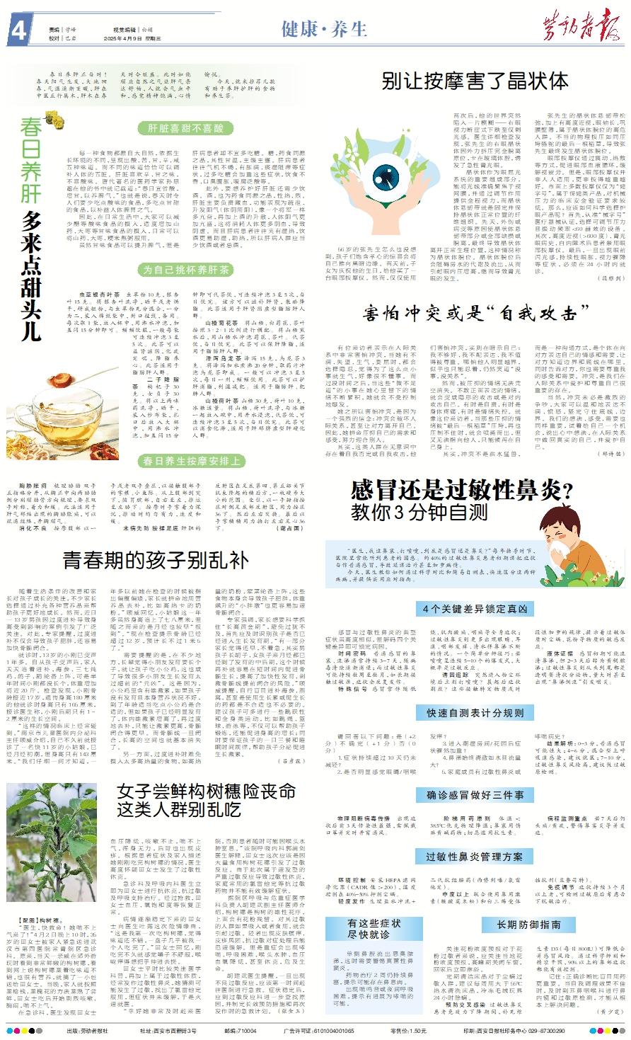 “医生,我这鼻塞、打喷嚏,到底是感冒还是鼻炎?”每年换季时节,医院里常能听到患者的困惑。约40%的过敏性鼻炎患者初期误把症状当作普通感冒,导致延误治疗甚至加重病情。 今天,医生教你如何通过科学对比和简易自测表,快速区分这两种疾病,并提供实用应对指南。4个关键差异锁定真凶 感冒与过敏性鼻炎的典型症状虽高度相似,但解码四个关键差异即可锁定病因。 时间密码 普通感冒的鼻塞、流涕通常持续3-7天,随病毒清除逐渐消退;而过敏性鼻炎可能持续数周至数月,如长期接触过敏源,症状会反复发作。 特殊信号 感冒常伴随低烧、肌肉酸痛、咽痛等全身症状;过敏性鼻炎则更多出现眼睛、耳道、咽部发痒、清水样鼻涕不断的情况。一个简单分辨技巧:若喷嚏呈连续5-10个的爆发式,大概率是过敏反应。 诱因追踪 突然进入粉尘环境后立刻打喷嚏?晨起后症状剧烈?这些接触特定物质或时段性加重的规律,提示着过敏体质对尘螨、花粉等物质的敏感反应。 液体证据 感冒初期可能流清鼻涕,但2-3天后转为黄稠脓涕;过敏性鼻炎则从头到尾都是透明蛋清状分泌物,量大时甚至出现“鼻涕倒流”引发咽炎。快速自测表计分规则 请回答以下问题:是(+2分)不确定(+1分)否(0分) 1.症状持续超过10天仍未减轻? 2.是否明显感觉眼睛/咽喉发痒? 3.进入潮湿房间/花园后症状骤然加重? 4.鼻涕始终清澈如水且流量大? 5.家庭成员有过敏性鼻炎或哮喘病史? 结果解析:0-3分,普通感冒可能性大;4-6分,混合型上呼吸道感染,建议就医;7-10分,过敏性鼻炎风险高,建议做过敏原检测。确诊感冒做好三件事 物理阻断病毒传播 出现症状后前3天传染性最强,需佩戴口罩并定时开窗通风。 阶梯用药原则 体温<38.5℃优先物理降温;鼻塞用伪麻黄碱药物;切忌滥用抗生素。 病程监测重点 若7天后仍头痛/黄痰,警惕鼻窦炎等并发症。过敏性鼻炎管理方案 环境控制 安装HEPA滤网净化器(CADR值>200),湿度控制在40%-50%抑制尘螨。 轻度发作 生理盐水冲洗+二代抗组胺药(西替利嗪/氯雷他定)。 中度以上 联合使用鼻用激素(糠酸莫米松)和白三烯受体拮抗剂(孟鲁司特)。 免疫调节 症状持续3个月以上者,可检测过敏原后考虑舌下脱敏治疗。有这些症状尽快就诊 单侧鼻腔流出恶臭脓涕,这时需要警惕真菌性鼻窦炎。 药物治疗2周仍持续鼻塞,提示可能存在鼻息肉。 出现喘鸣音或夜间呼吸困难,提示有进展为哮喘的可能。长期防御指南 关注花粉浓度预报对于花粉过敏者来说,应关注当地花粉浓度预报,高峰期关闭车窗,回家后立即淋浴。 定期清洁床品对于尘螨过敏人群,建议每周用大于55℃热水清洗床品,冷冻毛绒玩具24小时除螨。 预防交叉感染 过敏性鼻炎患者免疫力下降期间,补充维生素D3(每日800IU)可降低合并感冒风险。通过科学辨别和精准干预,90%以上的鼻部症状都能有效控制。 记住:正确诊断比盲目用药更重要。当自我调理效果不佳时,及时到耳鼻咽喉科进行鼻内镜和过敏原检测,才能从根本上解决问题。 (黄少霆)