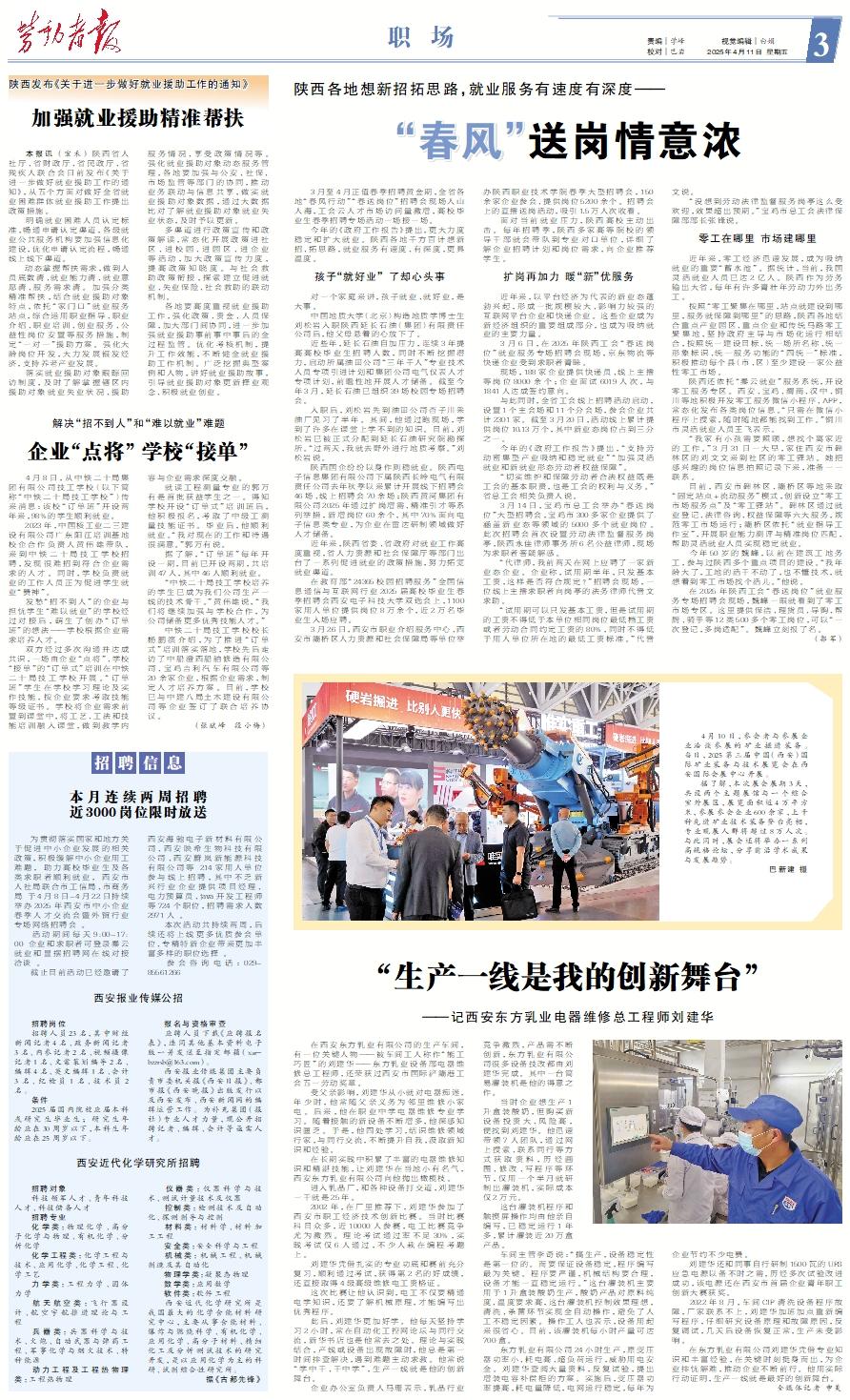 3月至4月正值春季招聘黄金期,全省各地“春风行动”“春送岗位”招聘会现场人山人海,工会云人才市场访问量激增,高校毕业生春季招聘专场活动一场接一场。 今年的《政府工作报告》提出,更大力度稳定和扩大就业。陕西各地千方百计想新招、拓思路,就业服务有速度、有深度,更具温度。孩子“就好业” 了却心头事 对一个家庭来讲,孩子就业、就好业,是大事。 中国地质大学(北京)构造地质学博士生刘松岩入职陕西延长石油(集团)有限责任公司后,他父母悬着的心放下了。 近些年,延长石油自加压力,连续3年提高高校毕业生招聘人数,同时不断挖掘潜力,启动所属油田公司“三年千人”专业技术人员专项引进计划和集团公司电气仪表人才专项计划,前瞻性地开展人才储备。截至今年3月,延长石油已组织39场校园专场招聘会。 入职后,刘松岩先到油田公司杏子川采油厂见习了半年。其间,他通过跑现场,学到了许多在课堂上学不到的知识。目前,刘松岩已被正式分配到延长石油研究院勘探所。“过两天,我就去野外进行地质考察。”刘松岩说。 陕西国企纷纷以身作则稳就业。陕西电子信息集团有限公司下属陕西长岭电气有限责任公司去年秋季以来累计开展线下招聘会46场、线上招聘会70余场;陕西黄河集团有限公司2025年通过扩岗增需、精准引才等系列举措,新增岗位60余个,其中70%面向电子信息类专业,为企业在雷达研制领域做好人才储备。 近年来,陕西省委、省政府对就业工作高度重视,省人力资源和社会保障厅等部门出台了一系列促进就业的政策措施,努力拓宽就业渠道。 在教育部“24365校园招聘服务”全国信息通信与互联网行业2025届高校毕业生春季招聘会西安电子科技大学双选会上,1100家用人单位提供岗位8万余个,近2万名毕业生入场应聘。 3月26日,西安市职业介绍服务中心、西安市灞桥区人力资源和社会保障局等单位举办陕西职业技术学院春季大型招聘会,150余家企业参会、提供岗位5200余个。招聘会上的直播送岗活动,吸引1.5万人次收看。 面对当前就业压力,陕西高校主动出击。每年招聘季,陕西多家高等院校的领导干部就会带队到专业对口单位,详细了解企业招聘计划和岗位需求,向企业推荐学生。扩岗再加力 暖“新”优服务 近年来,以平台经济为代表的新业态蓬勃兴起,形成一批规模较大、影响力较强的互联网平台企业和快递企业。这些企业成为新经济组织的重要组成部分,也成为吸纳就业的主要力量。 3月6日,在2025年陕西工会“春送岗位”就业服务专场招聘会现场,京东物流等快递企业受到求职者青睐。 现场,188家企业提供快递员、线上主播等岗位8000余个;企业面试6019人次,与1841人达成签约意向。 与此同时,全省工会线上招聘活动启动,设置1个主会场和11个分会场,参会企业共计2301家。截至3月20日,活动线上累计提供岗位10.13万个,其中新业态岗位占到三分之一。 今年的《政府工作报告》提出,“支持劳动密集型产业吸纳和稳定就业”“加强灵活就业和新就业形态劳动者权益保障”。 “切实维护和保障劳动者合法权益既是工会的基本职责,也是工会的权利与义务。”省总工会相关负责人说。 3月14日,宝鸡市总工会举办“春送岗位”大型招聘会,宝鸡市300多家企业提供了涵盖新业态等领域的5000多个就业岗位。此次招聘会首次设置劳动法律监督服务岗亭,陕西永佳律师事务所6名公益律师,现场为求职者答疑解惑。 “代律师,我前两天在网上应聘了一家新业态企业。企业称,试用期半年,只发基本工资,这样是否符合规定?”招聘会现场,一位线上主播求职者向岗亭的法务律师代晋文求助。 “试用期可以只发基本工资,但是试用期的工资不得低于本单位相同岗位最低档工资或者劳动合同约定工资的80%,同时不得低于用人单位所在地的最低工资标准。”代晋文说。 “没想到劳动法律监督服务岗亭这么受欢迎,效果超出预期。”宝鸡市总工会法律保障部部长张锋说。零工在哪里 市场建哪里 近年来,零工经济迅速发展,成为吸纳就业的重要“蓄水池”。据统计,当前,我国灵活就业人员已达2亿人。陕西作为劳务输出大省,每年有许多青壮年劳动力外出务工。 按照“零工聚集在哪里,站点就建设到哪里,服务就保障到哪里”的思路,陕西各地结合重点产业园区、重点企业和传统马路零工聚集地,坚持政府主导与市场化运行相结合,按照统一建设目标、统一场所名称、统一形象标识、统一服务功能的“四统一”标准,积极推动每个县(市、区)至少建设一家公益性零工市场。 陕西还依托“秦云就业”服务系统,开设零工服务专区。西安、宝鸡、渭南、汉中、铜川等地积极开发零工服务微信小程序、APP,常态化发布各类岗位信息。“只需在微信小程序上搜索,随时随地都能找到工作。”铜川市灵活就业人员王飞表示。 “我家有小孩需要照顾,想找个离家近的工作。”3月31日一大早,家住西安市碑林区的刘文文来到社区的零工驿站。她把感兴趣的岗位信息拍照记录下来,准备一一联系。 目前,西安市碑林区、灞桥区等地采取“固定站点+流动服务”模式,创新设立“零工市场服务点”及“零工驿站”。碑林区通过就业登记、法律咨询、权益保障等六大服务,规范零工市场运行;灞桥区依托“就业指导工作室”,开展职业能力测评与精准岗位匹配,帮助灵活就业
