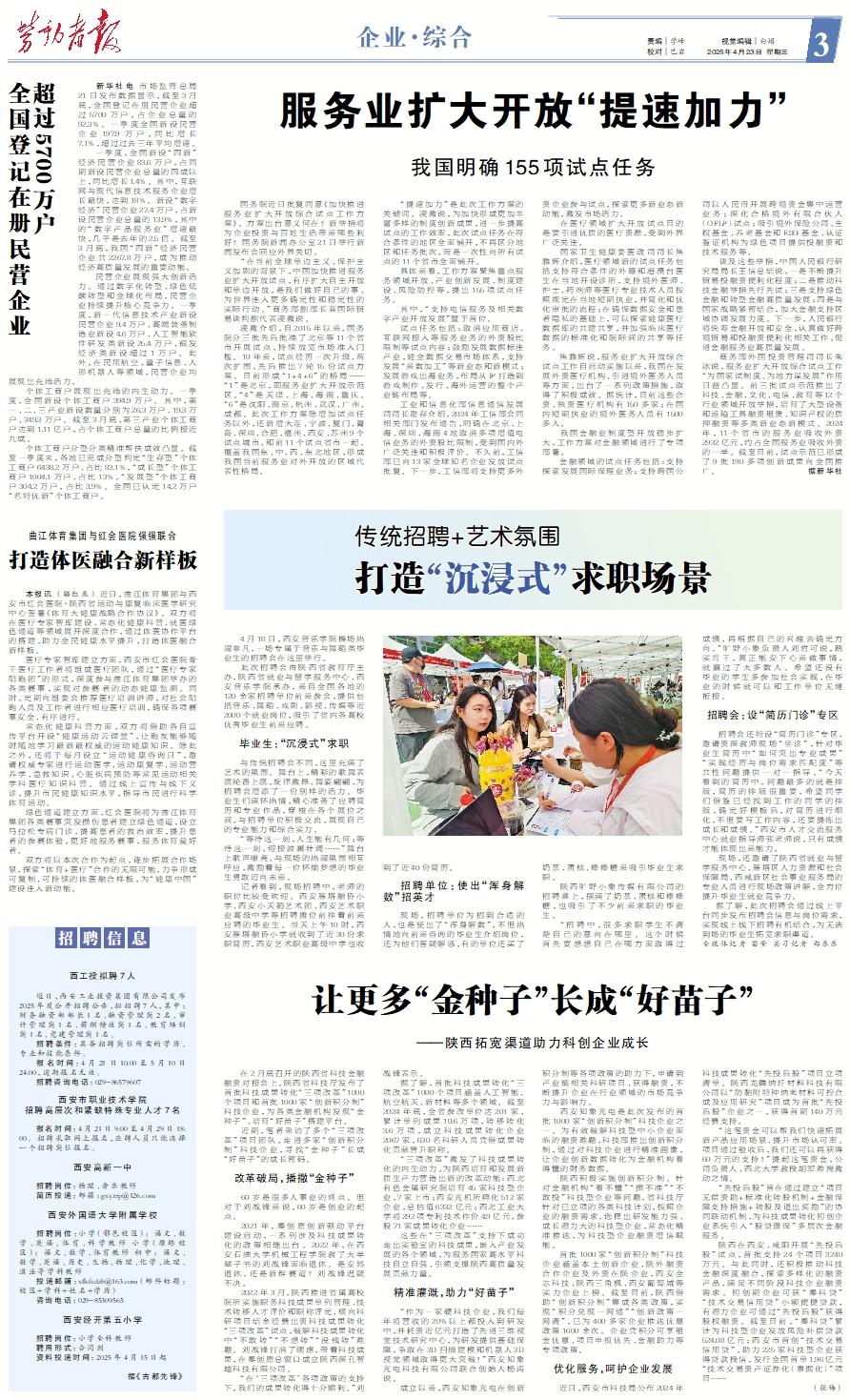 在2月底召开的陕西省科技金融融资对接会上,陕西省科技厅发布了首批科技成果转化“三项改革”1000个项目和首批1000家“创新积分制”科技企业,为各类金融机构发现“金种子”、培育“好苗子”搭建平台。 近期,笔者采访了多个“三项改革”项目团队,走进多家“创新积分制”科技企业,寻找“金种子”长成“好苗子”的成长密码。改革破局,播撒“金种子” 60岁是很多人事业的终点。但对于刘战锋来说,60岁是创业的起点。 2021年,秦创原创新驱动平台建设启动,一系列涉及科技成果转化的政策相继出台。2022年,在西安石油大学机械工程学院教了大半辈子书的刘战锋面临退休。是安然退休,还是新辟赛道?刘战锋迟疑不决。 2022年3月,陕西推进省属高校院所实施职务科技成果单列管理、技术转移人才评价和职称评定、横向科研项目结余经费出资科技成果转化“三项改革”试点,破解科技成果转化中“不敢转”“不想转”“没钱转”难题。刘战锋打消了顾虑,带着科技成果,在秦创原总窗口成立陕西深孔智越科技有限公司。 “在‘三项改革’各项政策的支持下,我们的成果转化得十分顺利。”刘战锋表示。 据了解,首批科技成果转化“三项改革”1000个项目涵盖人工智能、航空航天、新材料等多个领域。截至2024年底,全省参改单位达201家,累计单列成果10.6万项,转移转化3.6万项,成立科技成果转化企业2067家,630名科研人员凭借成果转化贡献晋升职称。 “三项改革”激发了科技成果转化的内生动力,为陕西培育和发展新质生产力营造出新的改革动能:西北有色金属研究院培育45家科技型企业,7家上市;西安光机所孵化512家企业,总估值6332亿元;西北工业大学将292项专利技术作价4.9亿元,参股71家成果转化企业…… 这些在“三项改革”支持下成功走出实验室的科技成果,嵌入产业发展的各个领域,为服务国家高水平科技自立自强、引领支撑陕西高质量发展贡献力量。精准灌溉,助力“好苗子” “作为一家硬科技企业,我们每年将营收的20%以上都投入到研发中,并耗资近亿元打造了先进三维视觉技术研究中心,为研发提供基础保障,争取在3D扫描建模和机器人3D视觉领域取得更大突破!”西安知象光电科技有限公司联合创始人杨涛说。 成立以来,西安知象光电在创新积分制等各项政策的助力下,申请到产业链相关科研项目、获得融资,不断提升企业在行业领域的市场竞争力与影响力。 西安知象光电是此次发布的首批1000家“创新积分制”科技企业之一。为有效破解科技型中小企业面临的融资难题,科技部推出创新积分制,通过对科技企业进行精准画像,让企业创新数据转化为金融机构看得懂的财务数据。 陕西积极实施创新积分制。针对金融机构“看不懂”“摸不准”“不敢投”科技型企业等问题,省科技厅针对已立项的各类科技计划,按照企业的融资需求,选择出研发能力强、成长潜力大的科技型企业,常态化精准推送,为科技型企业融资增信赋能。 首批1000家“创新积分制”科技企业涵盖本土创新企业、陕外融资合作企业及外资在陕企业,西安全志科技、陕西三角枫、西安葡萄城等实力企业上榜。截至目前,陕西借助“创新积分制”集成各类政策,实现“积分兑现一网通”“创新政策一网清”,已为400多家企业推送优惠政策1600余次。企业凭积分可享租金优惠、项目申报优先、金融助力等专项政策。优化服务,呵护企业发展 近日,西安市科技局公布2024年科技成果转化“先投后股”项目立项清单。陕西龙麟纳纤材料科技有限公司以“防黏附特种纳米材料可控合成及应用研究”项目成为首批“先投后股”企业之一,获得首期140万元经费支持。 “这笔资金可以帮我们快速拓展新产品应用场景、提升市场认可率。项目通过验收后,我们还可以再获得60万元的支持!”提起这笔资金,公司负责人、西北大学教授胡军难掩激动之情。 “先投后股”旨在通过建立“项目无偿资助+标准化转股机制+金融保障支持措施+转股及退出奖励”的协同联动机制,为科技成果转化初创企业系统引入“股贷债保”多层次金融服务。 陕西在西安、咸阳开展“先投后股”试点,首批支持24个项目3240万元。与此同时,还积极推动科技金融深度融合,探索多样化的融资产品,满足不同阶段科技企业融资需求。初创期企业可获“秦科贷”“技术交易信用贷”小额便捷贷款,有潜力企业可通过“先投后股”获得股权融资。截至目前,“秦科贷”累计为科技型企业发放风险补偿贷款524.08亿元;西安市首创“技术交易信用贷”,助力225家科技型企业获得贷款授信,发行全国首单1.96亿元“技术交易资产证券化(票据化)”项目…… (张梅)
