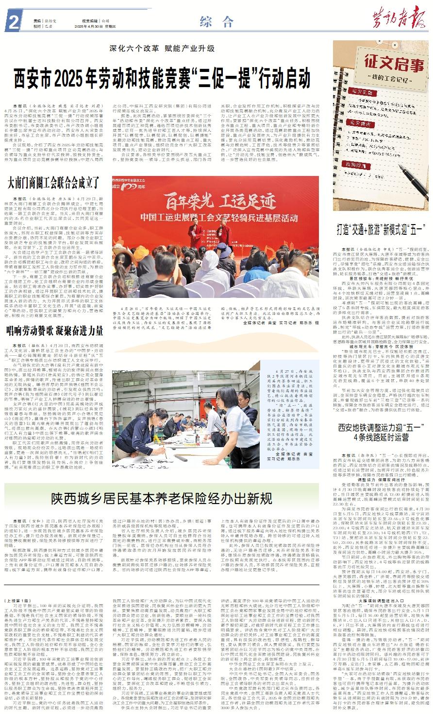 本报讯 (全媒体记者 臧慧 实习记者 刘蔚) 4月25日,“深化六个改革 赋能产业升级”2025年西安市劳动和技能竞赛“三促一提”行动视频部署会议在中航富士达科技股份有限公司召开。西安市委副书记、市委政法委书记,市产改协调小组组长李婧出席并宣布活动启动。西安市人大常委会副主任、市总工会主席、市产改协调小组副组长薛振虎主持。 会议现场,介绍了西安市2025年劳动和技能竞赛“三促一提”行动和重点项目立功竞赛活动;与会领导为重点支持单位代表授牌、颁授支持资金,并为重点项目立功竞赛参赛单位授旗;中建八局西北公司、中煤科工西安研究院(集团)有限公司进行视频连线交流发言。 据悉,此次竞赛活动,紧紧围绕省委深化“三个年”活动和市委“深化六个改革”重点任务,通过开展超百项的工种竞赛、遴选百项经济技术创新优秀成果、培育一批先进单位和工匠人才等,持续深入开展“以赛促学、以赛促训、以赛促创、以赛提能”主题劳动和技能竞赛,推动竞赛向重点工程、重大项目、重点产业靠拢,组织动员全市广大职工改革发展勇当先,建功立业新时代。 会议要求,各相关单位要围绕产改五大重点工作,坚持党委统一领导、工会牵头抓总、部门各司其职、企业发挥作用工作机制,积极探索产改与劳动和技能竞赛融合机制,充分激发产业工人动力活力,让产业工人在产业升级和创新发展中发挥更大作用;要紧扣“深化六个改革”重点任务,积极围绕全市重点工程、重大项目、重点产业和专精特新企业开展各类竞赛活动,通过竞赛助推重点工程加快建设、重点产业发展壮大,为产业升级提供有力支撑;要充分运用竞赛结果,强化激励机制,推动竞赛与劳模选树、工匠评选、技术等级晋升等紧密结合,广泛深入宣传竞赛中涌现的先进人物和典型案例,让“劳动光荣、技能宝贵、创造伟大”蔚成风气,进一步营造良好的社会氛围。