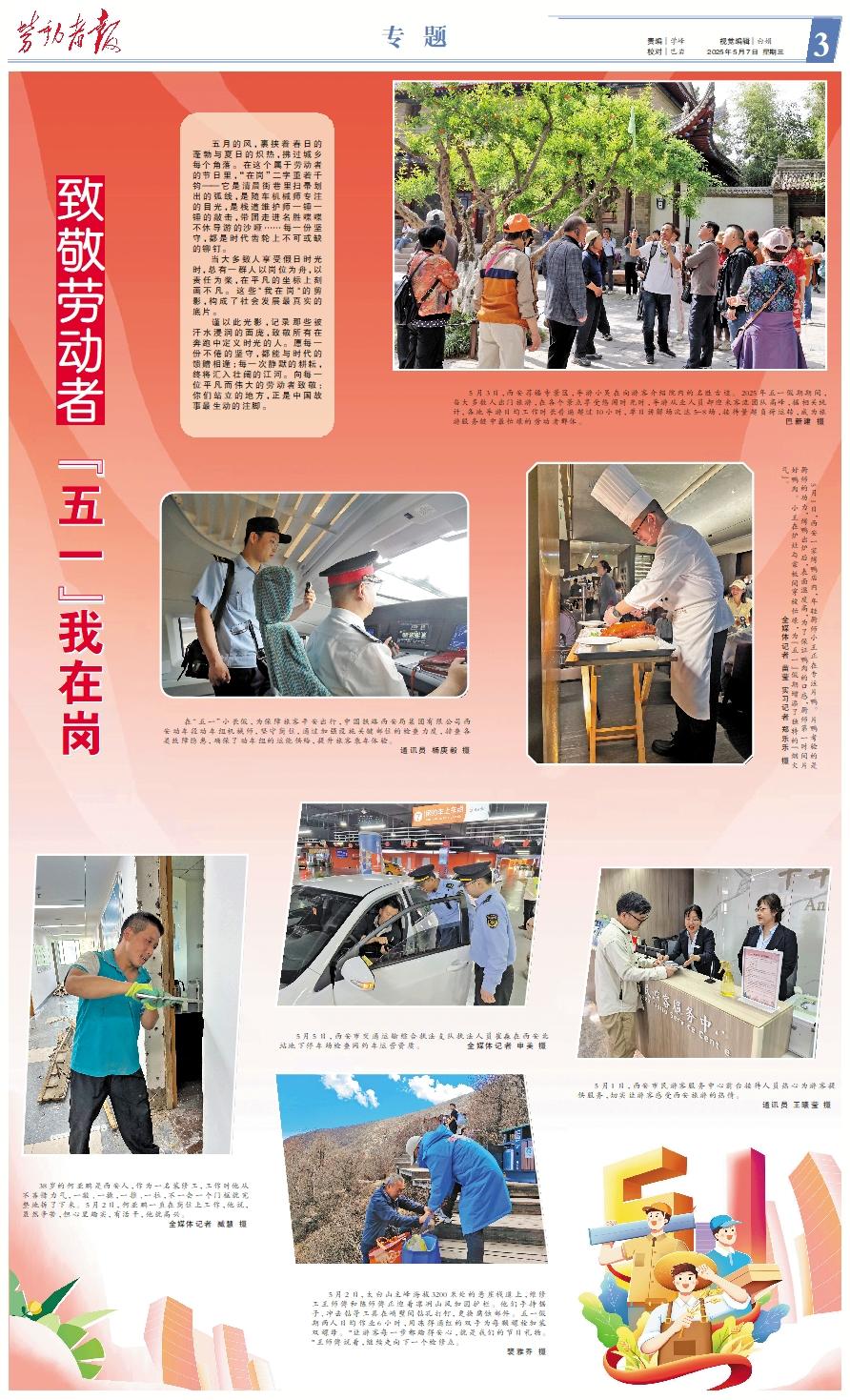 五月的风,裹挟着春日的蓬勃与夏日的炽热,拂过城乡每个角落。在这个属于劳动者的节日里,“在岗”二字重若千钧——它是清晨街巷里扫帚划出的弧线,是随车机械师专注的目光,是栈道维护师一锤一锤的敲击,带团走进名胜喋喋不休导游的沙哑……每一份坚守,都是时代齿轮上不可或缺的铆钉。 当大多数人享受假日时光时,总有一群人以岗位为舟,以责任为桨,在平凡的坐标上刻画不凡。这些"我在岗"的剪影,构成了社会发展最真实的底片。 谨以此光影,记录那些被汗水浸润的面庞,致敬所有在奔跑中定义时光的人。愿每一份不倦的坚守,都能与时代的馈赠相逢;每一次静默的耕耘,终将汇入壮阔的江河。向每一位平凡而伟大的劳动者致敬:你们站立的地方,正是中国故事最生动的注脚。 5月3日,西安荐福寺景区,导游小吴在向游客介绍院内的名胜古迹。2025年五一假期期间,当大多数人出门旅游,在各个景点享受悠闲时光时,导游从业人员却迎来客流团队高峰,据相关统计,各地导游日均工作时长普遍超过10小时,单日讲解场次达5-8场,接待量超负荷运转,成为旅游服务链中最忙碌的劳动者群体。 巴新建 摄 在“五一”小长假,为保障旅客平安出行,中国铁路西安局集团有限公司西安动车段动车组机械师,坚守岗位,通过加强设施关键部位的检查力度,排查各类故障隐患,确保了动车组的运能供给,提升旅客乘车体验。 通讯员 杨庚毅 摄 5月1日,西安一家烤鸭店内,年轻厨师小王正在专注片鸭。片鸭考验的是厨师的功力,烤鸭出炉后,表面温度高,为了保证鸭肉的口感,厨师第一时间片好鸭肉。小王在炉灶与案板间穿梭忙碌,为“五一”假期增添了独特的“烟火气”。 全媒体记者 苗莹 实习记者 郑乐乐 摄 38岁的何亚鹏是西安人,作为一名装修工,工作时他从不吝惜力气,一敲、一撬,一推、一拉,不一会一个门框就完整地拆了下来。5月2日,何亚鹏一直在岗位上工作,他说,虽然辛苦,但心里踏实,有活干,他就高兴。 全媒体记者 臧慧 摄 5月5日,西安市交通运输综合执法支队执法人员崔淼在西安北站地下停车场检查网约车运营资质。 全媒体记者 申美 摄 5月2日,太白山主峰海拔3200米处的悬崖栈道上,维修工王师傅和陈师傅正迎着凛冽山风加固护栏。他们手持锯子、冲击钻等工具在峭壁间钻孔打钉,更换腐蚀部件。五一假期两人日均作业6小时,用冻得通红的双手为每颗螺栓加装双螺母。"让游客每一步都踏得安心,就是我们的节日礼物。"王师傅说着,继续走向下一个检修点。 裴雅乔 摄 5月1日,西安市民游客服务中心前台接待人员热心为游客提供服务,切实让游客感受西安旅游的热情。 通讯员 王曦莹 摄