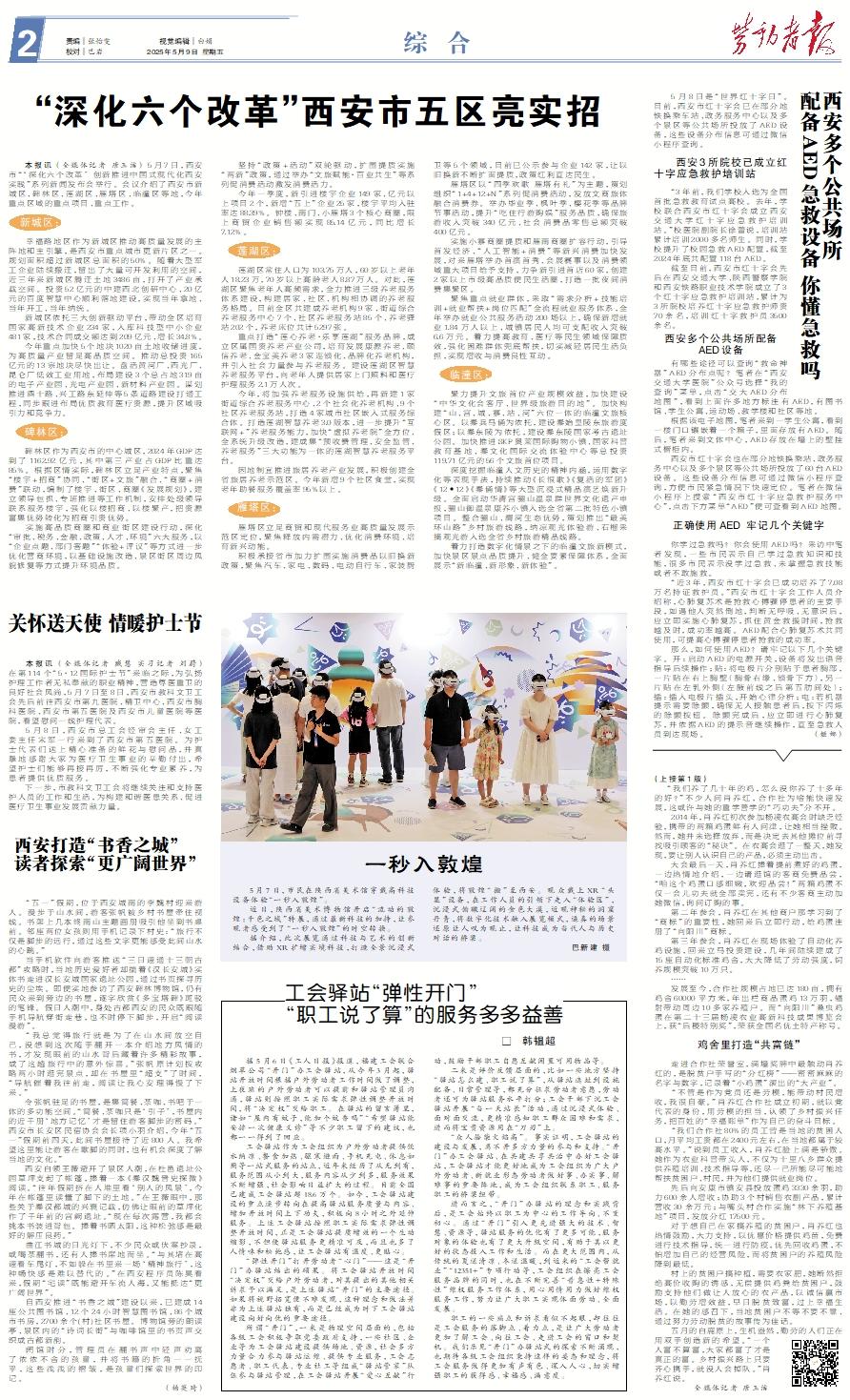 5月8日是“世界红十字日”。目前,西安市红十字会已在部分地铁换乘车站、政务服务中心以及多个景区等公共场所投放了AED设备,这些设备分布信息可通过微信小程序查询。 西安3所院校已成立红十字应急救护培训站 “3年前,我们学校入选为全国首批急救教育试点高校。去年,学校联合西安市红十字会成立西安交通大学红十字应急救护培训站。”校医院副院长徐蕾说,培训站累计培训2000多名师生。同时,学校提升了校园急救AED配置,截至2024年底共配置118台AED。 截至目前,西安市红十字会先后在西安交通大学、陕西警察学院和西安铁路职业技术学院成立了3个红十字应急救护培训站,累计为3所院校培养红十字应急救护师资70余名,培训红十字救护员3500余名。西安多个公共场所配备AED设备 有哪些途径可以查询“救命神器”AED分布点呢?笔者在“西安交通大学医院”公众号选择“我的查询”菜单,点击“交大AED分布地图”,看到上面许多地方标注有AED,有图书馆、学生公寓、运动场、教学楼和社区等地。 根据该电子地图,笔者来到一学生公寓,看到一楼门口镶嵌着一个箱子,里面存放有AED。随后,笔者来到文体中心,AED存放在墙上的壁挂式橱柜内。 西安市红十字会也在部分地铁换乘站、政务服务中心以及多个景区等公共场所投放了60台AED设备。这些设备分布信息可通过微信小程序查询,方便市民紧急情况下快速定位。笔者在微信小程序上搜索“西安市红十字应急救护服务中心”,点击下方菜单“AED”便可查看到AED地图。正确使用AED 牢记几个关键字 你学过急救吗?你会使用AED吗?采访中笔者发现,一些市民表示自己学过急救知识和技能,很多市民表示没学过急救、未掌握急救技能或者不敢施救。 “近3年,西安市红十字会已成功培养了7.08万名持证救护员。”西安市红十字会工作人员介绍称,心肺复苏术是抢救心搏骤停患者的主要手段,如遇他人突然倒地,判断无呼吸、无意识后,应立即实施心肺复苏,抓住黄金救援时间,抢救越及时,成功率越高。AED配合心肺复苏术共同使用,可提高心搏骤停患者抢救的成功率。 那么,如何使用AED?请牢记以下几个关键字。开:启动AED的电源开关,设备将发出语音指导后续操作;贴:将电极片分别贴于患者胸部,一片贴在右上胸壁(胸骨右缘、锁骨下方),另一片贴在左乳外侧(左腋前线之后第五肋间处);插:插入电极片插头,开始心律分析;电:若机器提示需要除颤,确保无人接触患者后,按下闪烁的除颤按钮。除颤完成后,应立即进行心肺复苏,并依据AED的提示音继续操作,直至急救人员到达现场。 (姬娜)