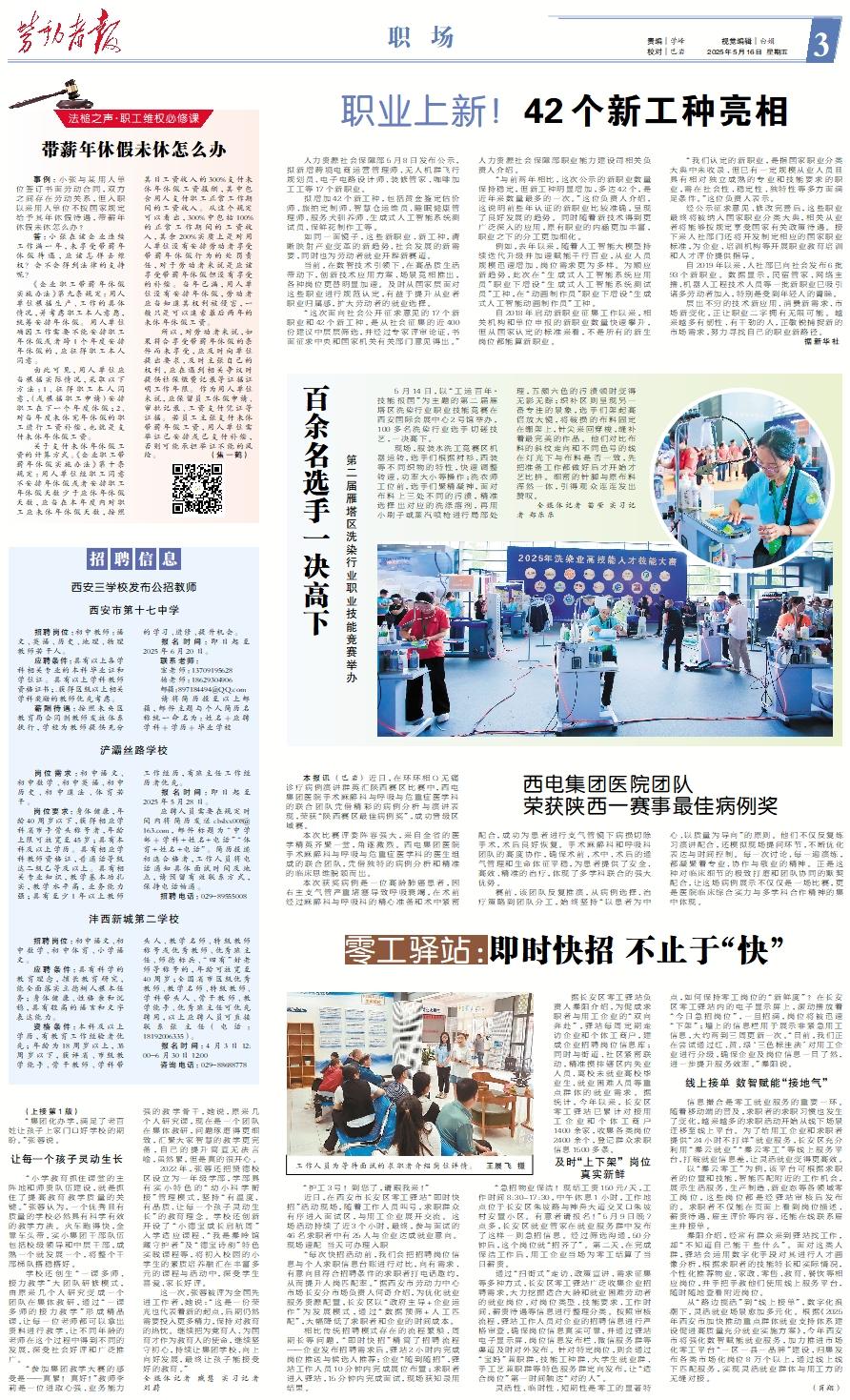 工作人员为等待面试的求职者介绍岗位详情。 王展飞 摄 “护工3号!到您了,请跟我来!” 近日,在西安市长安区零工驿站“即时快招”活动现场,随着工作人员叫号,求职群众有序进入面试区,与用工企业展开交流。这场活动持续了近3个小时,最终,参与面试的46名求职者中有25人与企业达成就业意向。现场速配 当天可办理入职 “每次快招活动前,我们会把招聘岗位信息与个人求职信息台账进行对比,向有需求、有意向且符合招聘条件的求职者打电话邀约,从而提升人岗匹配率。”据西安市劳动力中心市场长安分市场负责人何奇介绍,为优化就业服务资源配置,长安区以“政府主导+企业运作”为发展模式,通过“数据预筛+人工匹配”,大幅降低了求职者和企业的时间成本。 相比传统招聘模式存在的流程繁琐、周期长等问题,“即时快招”精简了招聘流程——企业发布招聘需求后,驿站2小时内完成岗位推送与候选人推荐;企业“随到随招”,驿站工作人员10分钟内完成展位布置;求职者进入驿站,15分钟内完成面试,现场获知录用结果。 据长安区零工驿站负责人秦阳介绍,为促成求职者与用工企业的“双向奔赴”,驿站每周定期走访企业和个体工商户,建成企业招聘岗位信息库;同时与街道、社区紧密联动,精准摸排辖区内失业人员、离校未就业高校毕业生、就业困难人员等重点群体的就业需求。据统计,今年以来,长安区零工驿站已累计对接用工企业和个体工商户1400余家,收集各类岗位2400余个,登记群众求职信息1500多条。及时“上下架” 岗位真实新鲜 “急招物业保洁!现结工资150元/天,工作时间8:30-17:30,中午休息1小时,工作地点位于长安区朱坡路与神舟大道交叉口朱坡村安置小区。有意者请报名!”5月9日晚7点多,长安区就业管家在就业服务群中发布了这样一则急招信息。经过筛选沟通,50分钟后,这个岗位就“招齐了”。第二天,在完成保洁工作后,用工企业当场为零工结算了当日薪资。 通过“扫街式”走访、政策宣讲、需求征集等多种方式,长安区零工驿站广泛收集企业招聘需求,大力挖掘适合大龄和就业困难劳动者的就业岗位,对岗位类型、技能要求、工作时间、薪资待遇等信息进行整理分类。按照审核流程,驿站工作人员对企业的招聘信息进行严格审查,确保岗位信息真实可靠,并通过驿站电子显示屏、岗位信息发布栏、微信服务群等渠道及时对外发布。针对特定岗位,则会通过“宝妈”兼职群、技能工种群、大学生就业群、手工艺兼职群等特色服务群定向发布,让“适合岗位”第一时间触达“对的人”。 灵活性、临时性、短期性是零工的显著特点,如何保持零工岗位的“新鲜度”?在长安区零工驿站内的电子显示屏上,滚动播放着“今日急招岗位”,一旦招满,岗位将被迅速“下架”;墙上的信息栏用于展示非紧急用工信息,大约两到三周更新一次。“目前,我们正在尝试通过红、黄、绿‘三色标注法’对用工企业进行分级,确保企业及岗位信息一目了然,进一步提升服务效率。”秦阳说。线上接单 数智赋能“接地气” 信息撮合是零工就业服务的重要一环。随着移动端的普及,求职者的求职习惯也发生了变化,越来越多的求职活动开始从线下场景迁移至线上平台。为了给用工企业和求职者提供“24小时不打烊”就业服务,长安区充分利用“秦云就业”“秦云零工”等线上服务平台,打破就业信息差,让灵活就业变得更高效。 以“秦云零工”为例,该平台可根据求职者的位置和技能,智能匹配附近的工作机会,展示生活服务、生产制造、新业态等各领域零工岗位,这些岗位都是经驿站审核后发布的。求职者不仅能在页面上看到岗位描述、薪资待遇、雇主评价等内容,还能在线联系雇主并接单。 秦阳介绍,经常有群众来到驿站找工作,却“不知道自己能干些什么”。面对这类人群,驿站会运用数字化手段对其进行人才画像分析,根据求职者的技能特长和实际情况,个性化推荐物业、家政、零售、教育、餐饮等相应岗位,并手把手教他们使用线上服务平台,随时随地查看附近岗位。 从“路边揽活”到“线上接单”,数字化浪潮下,灵活就业场景愈加多元化。根据《2025年西安市加快推动重点群体就业支持体系建设促进高质量充分就业实施方案》,今年西安市将强化数智赋能就业服务,加力推进市场化零工平台“一区一县一品牌”建设,归集发布各类市场化岗位8万个以上,通过线上线下匹配服务,实现灵活就业群体与用工方的无缝对接。 (肖翔)