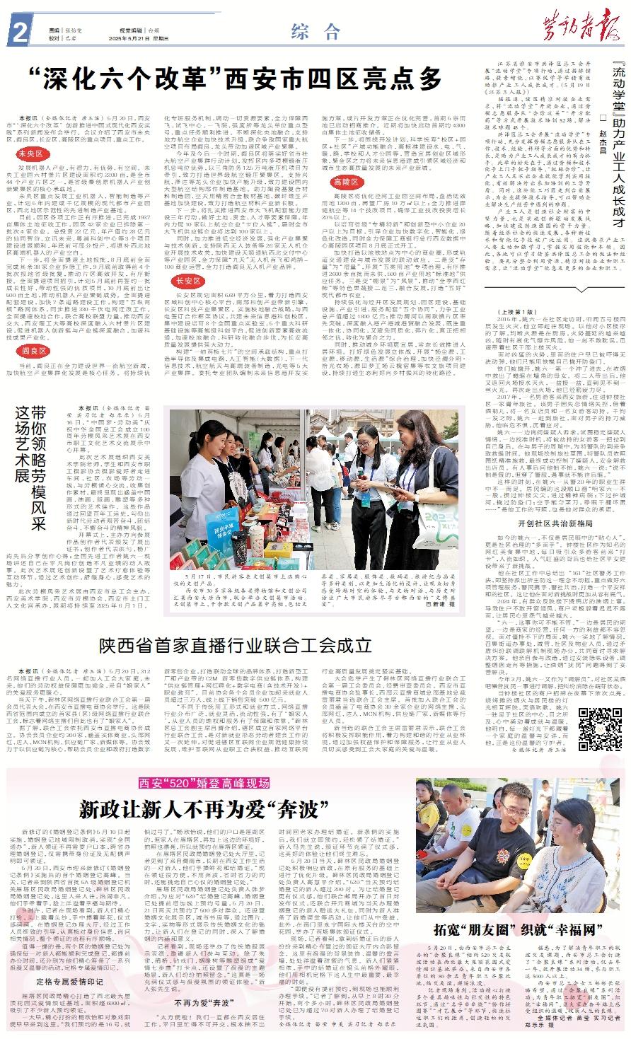 新修订的《婚姻登记条例》5月10日起实施,婚姻登记地域限制取消,实现“全国通办”,新人领证不再需要户口本,跨省办理婚姻登记,仅需携带身份证及无配偶声明即可领证。 5月20日,西安市迎来新修订《婚姻登记条例》实施后的首个婚姻登记高峰。当天,记者来到陕西省首批5A级婚姻登记机关雁塔区民政局婚姻登记处、碑林区民政局婚姻登记处,这里人来人往,热闹非凡,他们手牵着手,脸上洋溢着幸福与期待。 9时许,记者在现场看到,新人们精心打扮,头上戴着头纱,手中捧着鲜花,仪式感满满。在婚姻登记办理大厅,经过工作人员细致的引导,认真核对身份信息,询问相关情况,整个领证的流程有序顺畅。 值得一提的是,两个区的婚姻登记处为确保每一对新人都能顺利完成登记,都提前办公时间,还分别为他们精心筹备了一系列浪漫又温馨的活动,定格专属爱情印记。定格专属爱情印记 雁塔区民政局精心打造了西北最大屋顶花园式爱情颁证基地,面积超6000㎡,吸引了不少新人预约领证。 一大早,精心打扮的杨欣怡和对象刘阳便早早来到这里。“我们预约的是16号,就怕过号了。”杨欣怡说,他们的户口是莲湖区的,但家人在雁塔区,再加上这边的环境好,拍照也漂亮,所以就预约在雁塔区领证。 在雁塔区民政局婚姻登记处大厅里,记者见到了来自渭南市,长期在西安工作生活的一对新人,他们手捧鲜花和结婚证。“现在领证很方便,不用奔波,省时省力的同时,还能挑选自己心仪的婚姻登记处。” 雁塔区民政局婚姻登记处负责人韩梦介绍,为应对“520”结婚登记高峰,婚姻登记处提前增加线上预约号量,5月20日、21日两天共预约了500多对群众。还设置婚姻文化展示区、城市书房等,通过图片、文字、实物等形式展示传统婚姻文化的魅力,让新人们在登记的同时,深入了解婚姻的内涵和意义。 记者看到,现场还举办了传统婚服展示表演,邀请新人们参与互动。除了朱雀、鹊桥、钻戒门、姻缘树等雕塑组成“爱情七步曲”打卡点,还设置了浪漫的主题场景,新人们纷纷拍照留念。“这真是一场充满仪式感与浪漫氛围的领证体验。”新人张先生说。不再为爱“奔波” “太方便啦!我们一直都在西安居住工作,平日里忙得不可开交,根本抽不出时间回老家办理结婚证。新条例的实施后,我们就立即预约,轻松领了结婚证。”新人马先生说,颁证环节充满了仪式感,这美好的体验让他们终生难忘。 5月20日当天,碑林区民政局婚姻登记处积极响应新政,在原有服务的基础上进行了优化升级。碑林区民政局婚姻登记处负责人高慧平介绍,“520”当天预约结婚登记的新人超过200对。为让结婚登记更有仪式感,他们联合邮局开办了首日封发布仪式,还联合开元商城为当天办理婚姻登记的新人赠送大礼包,同时为新人准备了新婚课堂等活动,让他们从中受益。此外,在南门里永宁国际大楼天台的空中花园,举办了两场集体颁证仪式。 现场,记者看到,拿到结婚证后的新人纷纷来到精心布置过的颁证大厅内合影留念。这里有浪漫的背景装饰、温馨的誓言墙,处处洋溢着甜蜜的气息。新人们紧紧相依,手中的结婚证在镜头前格外耀眼,他们用相机定格下这人生中最重要、最幸福的时刻。 “即便没有提前预约,到现场也能顺利办理手续。”记者了解到,从早上8时30分开始,两个多小时,碑林区民政局婚姻登记处已为超过70对新人办理了结婚登记手续。全媒体记者 苗莹 申美 实习记者 郑乐乐