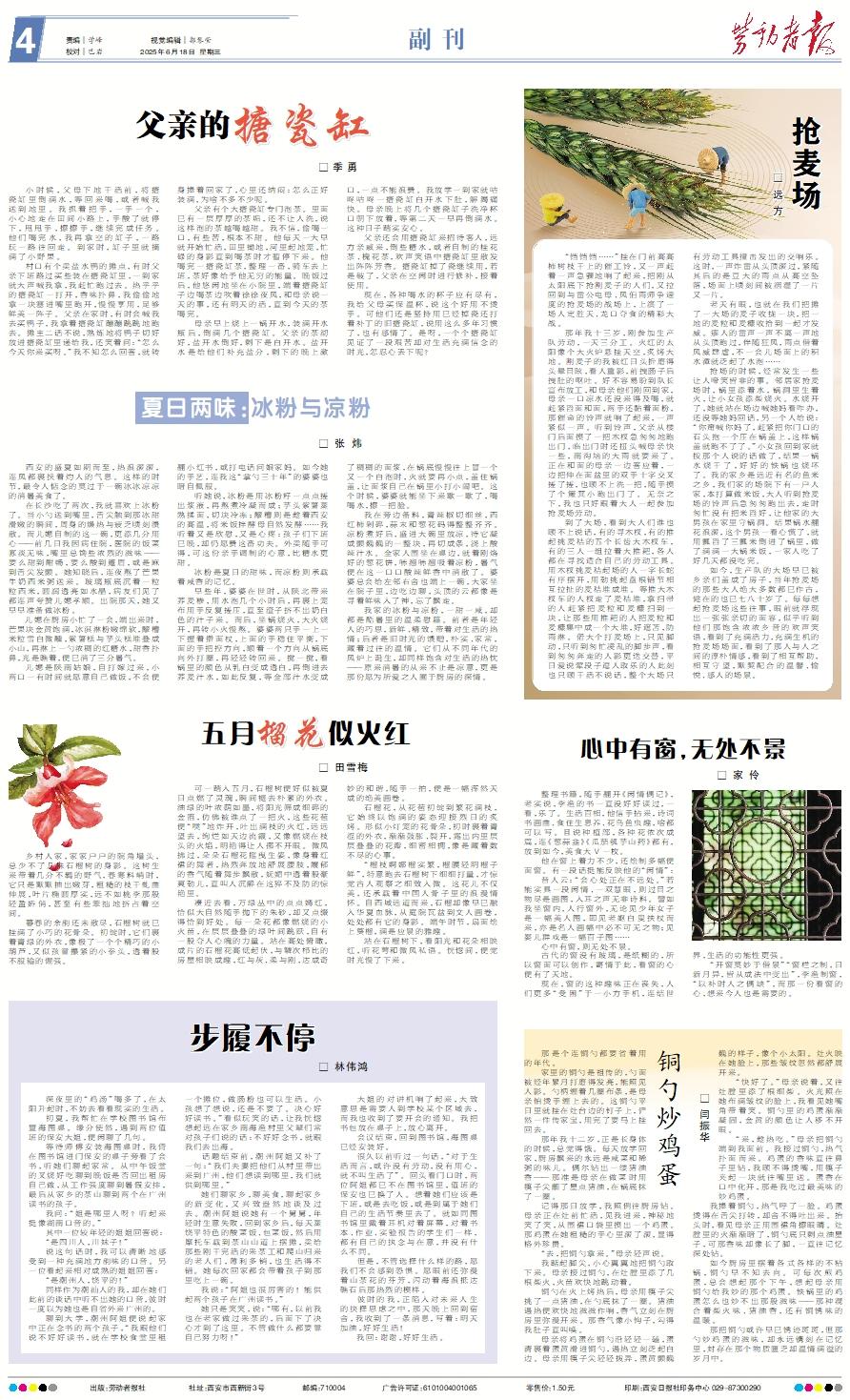 西安的盛夏如期而至,热浪滚滚,连风都裹挟着灼人的气息。这样的时节,最令人惦念的莫过于一碗冰冰凉凉的消暑美食了。 在长沙吃了两次,我就喜欢上冰粉了。当小勺送到嘴里,舌尖触到那冰甜滑嫩的瞬间,周身的燥热与疲乏顷刻溃散。而儿媳自制的这一碗,更添几分用心——前几日我因病住院,医院的饭菜寡淡无味,嘴里总馋些浓烈的滋味——要么甜到酣畅,要么酸到蹙眉,或是麻到舌尖发颤。她知晓后,连夜熬了芒果牛奶西米粥送来。玻璃瓶底沉着一粒粒西米,圆润透亮如水晶,病友们见了都连声夸赞儿媳孝顺。出院那天,她又早早准备做冰粉。 儿媳在厨房小忙了一会,端出来时,芒果块金黄饱满,冰淇淋粉嫩绵软,醪糟米粒雪白微醺,紫薯糕与芋头糕堆叠成小山,再淋上一勺浓稠的红糖水,甜香扑鼻,光是瞧着,便已消了三分暑气。 儿媳是陕南姑娘,自打嫁过来,小两口一有时间就愿意自己做饭,不会便翻小红书,或打电话问娘家妈。如今她的手艺,连我这“掌勺三十年”的婆婆也暗自佩服。 听她说,冰粉是用冰粉籽一点点搓出浆液,再熬煮冷凝而成;芋头紫薯蒸熟揉面,切块冷冻;醪糟则是趁着西安的高温,将米饭拌酵母自然发酵……我听着又是欣慰,又是心疼:孩子们下班已晚,却仍愿费这番功夫。外卖随手可得,可这份亲手调制的心意,比糖水更甜。 冰粉是夏日的甜味,而凉粉则承载着咸香的记忆。 早些年,婆婆在世时,从陕北带来荞麦糁,用水泡几个小时后,再裹上笼布用手反复搓压,直至渣子挤不出奶白色的汁子来。而后,坐锅烧火,大火烧开,再转小火慢熬。婆婆两只手一上一下握着擀面杖,上面的手稳住平衡,下面的手把控方向,顺着一个方向从锅底向外打圈,再轻轻转回来。搅一搅,看锅里的颜色从乳白变成透白,再倒进去荞麦汁水,如此反复,等全部汁水变成了稠稠的面浆,在锅底慢慢往上冒一个又一个白泡时,火就要再小点,盖住锅盖,让面浆自己在锅里小打小闹吧。这个时候,婆婆就能坐下来歇一歇了,喝喝水,擦一把脸。 我在旁边备料,青辣椒切细丝,西红柿剁碎,蒜末和葱花码得整整齐齐。凉粉煮好后,盛进大碗里放凉,待它凝成颤巍巍的一整块,再切成条,浇上酸辣汁水。全家人围坐在桌边,就着刚烙好的葱花饼,哧溜哧溜吸着凉粉,暑气便在这一口口酸辣鲜香中消散了。婆婆总会给左邻右舍也端上一碗,大家坐在院子里,边吃边聊,头顶的云都像是寻着鲜味入了神,忘了飘走。 我家的冰粉与凉粉,一甜一咸,却都是酷暑里的温柔慰藉。前者是年轻人的巧思,新鲜、精致,带着对生活的热情;后者是旧时光的馈赠,朴实、家常,藏着过往的温情。它们从不同年代的风炉上诞生,却同样饱含对生活的热忱——原来消暑的从来不止是凉意,更是那份愿为所爱之人囿于厨房的深情。