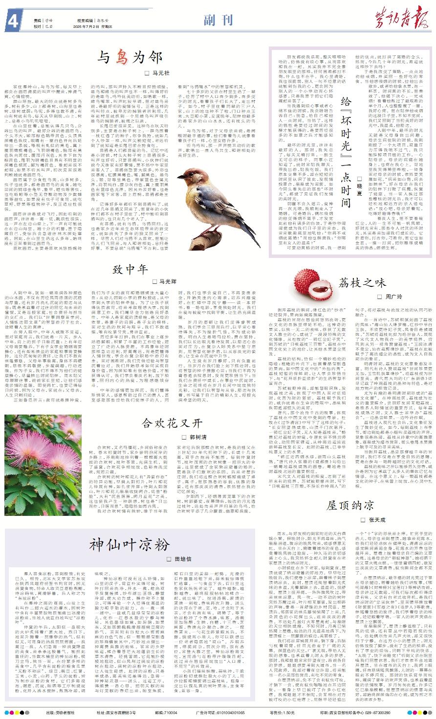 家住秦岭山,与鸟为邻,每天早上都会在画眉清脆的叫声中醒来,神清气爽,心情愉悦。 群山环抱,最大的特点就是树多鸟多,树有多少,山上都是树,山沟里也是树,绿树成荫;鸟呢,多得也数不清,有山有树就有鸟,每天从早到晚,山上、树上,总是小鸟叽叽喳喳。 在山里住着,总能认得几只鸟,分辨出鸟的叫声。最好分辨的是画眉鸟,个头不大,额部棕色略带黄色,头顶具深褐色纵纹,眼睛有一圈白色并向后延伸出一条线,喙根有虬似的黑毛,翼上覆羽橄榄褐色,飞羽暗褐色,胸部有黑色纵向斑纹,腹部污灰色,其余下体为棕黄色,尾羽为暗褐色且具有不明显的深褐色横斑,脚为褐黄色。看起来很不起眼,如果不听其叫声,初次见面很难判断她就是画眉鸟。 画眉属于杂食性鸟类,山多树多,虫子也就多,都是画眉鸟的美食,她吃田间的铜绿金龟甲、象甲、蝗虫等害虫,也吃蚯蚓等小型无脊椎动物及少数蜂类等益虫,如果没有虫子可食用,就吃草籽、野果等植物种子,反正适应性很强。 画眉往往是成对飞行,因此听到的画眉声,往往是一高一低,跳跃性很强,这一声在左边山梁上,下一声有可能就在右边山沟里。她十分的机警,善于隐藏自己,受惊后会急速往林木深处窜逃。因此,在山里生活这么多年,始终没有正面看到过画眉鸟。 喜欢画眉,主要是喜欢其悠扬婉转的鸣叫,那叫声持久不断且抑扬顿挫,雄鸟和雌鸟的叫声也不一样,叫得好听的是雄鸟,鸣吟优美动听,如唱歌一样,雌鸟嘴笨,叫声比较单调,但对雄鸟来说,是最好听的爱情信号。正是这样的鸣叫特点,被卑劣的捕猎者所利用,几年前村里就抓到一个用雌鸟叫声吸引雄鸟的捕猎者,被绳之以法。 长尾巴雀很常见。这种鸟在秋天特别多,主要是在柿子树上,一群鸟围着一枝红透了的柿子,你争我抢,就如几个人吵架一样,叫声尖锐短促,老远听到了就知道是长尾巴雀在抢食吃。 喜鹊是人们都喜爱的鸟。记忆中还是小时候,村头大柿子树上喜鹊很多,叫声也好听,只要喜鹊叫,小伙伴们就说今天谁家有好事情,果不然中午家里来客人了。喜鹊体型要大很多,外形也很漂亮,虹膜黑褐色,嘴、脚黑色。雄鸟头、颈、背等呈黑色,带紫蓝色金属光泽,肩羽纯白,腰杂灰白色,翼上覆羽黑色有蓝绿色光泽。因其外表好看,也是画家笔下常客,喜上眉梢,喜鹊都是主角。 记得好多年都听不到喜鹊叫了,就在近几年喜鹊又回来了,但童年的小伙伴们都不在村子里住了,村中能听到喜鹊叫的,也只有几个老人了。 有喜鹊,就有乌鸦。乌鸦回归,这也是家乡近年来生态环境带来的新变化,就如消失了多年的狼又回来了一样。尽管人们对乌鸦不太喜欢,但能让鸟儿们飞回来,与人和谐相处,总归是好事。不要总说“乌鸦嘴”不吉利,也要看到“乌鸦喝水”中的智慧和机灵。 七十多岁的父亲在村里生活了一辈子,经历了村中人口由少到多,由多变少的时光,看着孩子们长大了,走出村子。如今,村子里住着同辈的三户人家,山上的地也种不了啦,门口种点玉米、大豆和小菜,安度晚年,陪伴他最多的是家乡的山山水水,还有枝头的鸟儿。 与鸟为邻,对于父母亲来说,是闲暇时最幸福的事,他们看着鸟儿就像看着孩子们一样,心里安稳许多。 听鸟鸣叫,那一声声悦耳动听的歌声,歌唱出一曲人鸟共生、和谐相处的美好生活。