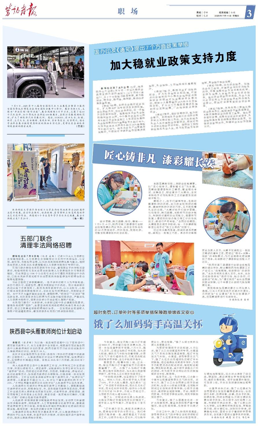 设计草稿、拷贝画稿、彩绘、镶嵌……7月5日-6日,陕西省第三届漆器行业职业技能竞赛在西安举办,来自全省各地市的50名晋级选手,同台竞技、现场比拼,完整呈现漆器创作的全流程。 本届竞赛是省级二类职业技能赛事,以“匠心铸非凡、漆彩耀长安”为主题。竞赛设置漆器制作工赛项,覆盖理论考试、实操技艺、职业素养三大模块,全面考核选手对传统髹饰工艺的掌握及创新设计能力。 赛场之上,选手们凝神专注,毛刷轻蘸漆料时的沉稳、刻刀游走纹样时的精准、镶嵌材料拼合时的巧思,无不展现着扎实的功底。“大赛对选手们设计草稿、勾勒雏形、拷贝画稿、定格细节的设计能力,制胎时对基材的应用能力,髹漆环节反复上漆把控的综合能力等工序的传统技艺,都进行严苛考验。”全国劳动模范,大赛组委会成员李程说,每一个步骤都能彰显出选手对“慢工出细活”的坚守。 经过两天激烈角逐,圆满完成各项赛程,涌现出一批能工巧匠。承办单位雁塔区总负责人表示,大赛不仅涌现出一批技艺精湛的青年工匠,更通过‘理论+实操+创新’的考核模式,为行业标准化建设提供了范本,有效推动了漆器职业技能人才培养。 “陕西省第三届漆器行业职业技能竞赛的成功举办,标志着陕西传统漆器工艺产业迈入‘技能赋能、创新驱动’的新阶段。”主办方相关负责人表示,未来,主办方将持续深化“政府引导、校企协同、行业联动”机制,为“漆艺陕军”走向全国提供坚实保障,让千年漆艺在新时代焕发璀璨光彩。 据现场参加竞赛的漆艺公司负责人透露,已与3名获奖选手达成合作意向,共同研发“长安漆韵”系列文创漆器产品,将竞赛成果进行有效转化。 全媒体记者 苗莹