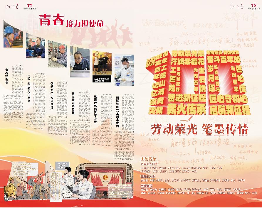 青春淬钢魂 全国劳动模范魏海霞,甘肃酒钢集团宏兴钢铁股份有限公司钢铁研究院不锈钢研究所热轧产品研究责任工程师。她扎根钢铁生产一线22载,用青春与奋斗传承“铁山精神”。 2009年,酒钢向不锈钢转型,热轧加热炉成工艺调整“瓶颈”。她临危受命,查图纸、钻烟道,打破传统认知,实现炉卷轧机从轧制碳钢到不锈钢的跨越。此后,以“加热速率趋近性”为导向,经无数次试验,开创国内不锈钢行业单座加热炉“多品种、小批量”差异化生产先例,助力酒钢不锈钢钢种大幅增加。 作为研发人员,魏海霞紧盯世界前沿,钻研钛、锆、镍及钛合金加工技术,多项专利为酒钢有色金属加工提供支撑。面对国家重点工程材料难题,不畏艰难,解决高温镍基合金等技术瓶颈,提升轧制成功率,打破国外技术封锁,年创效超2亿元。 她还积极推动数字化研发,牵头引进先进软件,率团队完成相关项目,缩短研发周期、降低成本。此外,攻克超高碳高端手刮剃须刀用钢等行业难题,实现产品国产化;主导绿色钢铁项目,助力企业绿色发展。 甘肃工人报记者 胡江一腔“虎”劲儿闯出来 全国劳动模范何小虎,航天科技集团六院西安航天发动机有限公司数控车工,1986年出生在陕北的一个普通的农村家庭。如今,他加工的长征系列火箭发动机燃烧系统微小孔精度误差控制在了头发丝的1/20以内,并拥有99.9%的产品合格率,突破了制约行业十余年的技术瓶颈。 在生产加工燃烧系统微小孔过程中,一个极其细微的误差,就可能会引发燃料燃烧不稳定,甚至导致整个发射任务失败。何小虎深知自己的工作对国家、民族的重要战略意义,他初生牛犊不怕“虎”,不断钻研新技术、新材料,狠抓每一项细节,创造性提出“微小孔高效加工法”和“异型零件高效找正法”,实现了我国在薄壁加工、数字化加工领域的重大突破,助力长征火箭每一次的顺利点火和安全运行,并年均节约成本超百万元。 2025年,国家高级技师、高级工程师、航天特级技师何小虎当选“全国劳动模范”。年轻的他还培养出了多位高级技师,为我国的航天事业贡献源源不断的新鲜血液。 劳动者报记者 顾思远创新激活“绿色动能” 全国劳动模 范梁坤龙,1991 年出生,是河南 省四通锅炉有限 公司技术创新小 组副组长 。 锅炉是推动工业生产的“心脏”,梁坤龙把“在技术上多突破一点”作为奋斗目标,力争让“中国制造”的心跳更加强劲。 他主动承担低氮燃烧机自主生产研发任务,带领技术创新小组成员日夜奋战,成功完成低氮燃烧器的制造工艺与产品质量、技术水平、研发与创新等工作。以他的名字命名的劳模创新工作室,先后为公司培养技能人才56人,工作室80℅的员工都获得了周口市科学技术进步一等奖。 梁坤龙严把技术关和质量关,研发设计的贯流式蒸汽锅炉被省工信厅评为河南省制造业单项冠军,填补了国内技术空白,达到国际先进技术水平,并入选工业和信息化部《国家工业节能技术装备推荐目录》,成为河南省工业领域节能节水和固废综合利用技术装备。该系列产品为企业带来直接经济效益2800余万元。 河南工人日报记者 葛颖核匠廿年铸重器 全国劳动模范王秋枫,中核四0四有限公司第三分公司高级技师。 深耕乏燃料后处理事业20余载,面对国内行业空白、国外技术封锁,带领团队完成8000余份设计变更,优化整改1400余项调试问题,获取240多万个调试数据,突破多项关键技术,助力我国成为少数自主掌握乏燃料后处理技术的国家,使铀资源可持续供给大幅延长。 进入新时代,王秋枫锚定前沿技术,自主研发改进系统,掌握关键设备连续运行技术,实现生产线过渡。 工作中,他凭借韧劲和干劲,解决诸多技术难题,自主研发去污装置。他完成多项技术改进,获15项国家专利、发布1项核行业标准、发表2篇论文,主导多项国家重点科研专项,荣获10项国家科学技术进步奖。 此外,王秋枫主动扛起人才培养重任,编制手册,投身工程建设与技术研究,扎根一线建立大师创新工作室。在他的带动下,团队成绩斐然,培养输送2000余名专业人才,为我国后处理事业筑牢人才根基。 甘肃工人报记者 胡江放眼世界的青年力量 2025年春节档,电影《哪吒2:之魔童闹海》以破百亿票房的成绩震撼全球,不仅刷新了中国电影票房纪录,更让国际影坛看到中国特效技术的飞跃。 在这部现象级动画的背后,一支扎根西安的年轻团队——数字怪兽,正以极致匠心悄然走入大众视野。 这家不到50人的特效公司,全部由“90”后及“00”后组成。他们凭借对国产动画的深刻理解和满腔热爱,成为了电影《哪吒2:之魔童闹海》的核心特效供应商。 参与《哪吒2》项目的制片总监冯吉介绍:“干我们这一行,耐心是必不可少的,电影里海妖附着在金箍棒上的镜头艺术性比较强,模型组和灯光组为了这2秒钟的画面,整整修改了一个半月。” “我们一直在努力做自己的动画电影以及原创IP。”谈及未来,冯吉表示,他们正在积极与高校合作,将在西安建立动画产业基地。“我们一直以来的目标,就是用动画改变世界!” 劳动者报 刘翊琪破解核电安全技术难题 潘广镇,巩义市泛锐熠辉复合材料有限公司首席工程师,1986年出生于山东泰安大汶河畔,毕业于西北工业大学机械制造及其自动化专业,博士学位。他坚守生产研发一线,为助推新材料产业发展提供了强有力的技术支撑,为推动经济高
