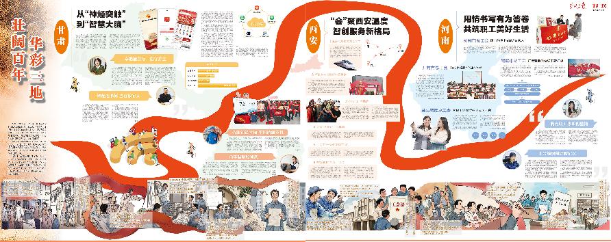 本期“百年工运 山河同频”联合策划专版,邀您共同翻阅百年工运的生动篇章。这里有“我与工会的故事”,汇聚一线劳动者最质朴的心声,讲述工会在维权帮扶、技能提升、排忧解难中那份“娘家人”的温暖,字里行间流淌着职工与工会组织的深情厚谊。 我们同步呈现河南、甘肃、西安三地工会的亮点工作,聚焦思想引领、建功立业、权益维护、服务升级等领域的创新实践与丰硕成果,展现百年工运精神在新时代焕发的蓬勃生机与强大力量。 特别设计的“漫画时间轴:百年工运大事记”,则以生动笔触勾勒中华全国总工会从峥嵘岁月走向辉煌今日的关键足迹,让厚重历史跃然纸上,清晰铭刻中国工人阶级与工会组织的光辉奋斗历程。故事里有温度,亮点中有创新,足迹中见传承,共同编织成百年工运的壮阔图景。甘 肃从“神经突触”到“智慧大脑” 打开“陇工惠”APP,点击首页分类中的“顺丰寄件”,快捷完成上门寄件、查件功能;打开“懒人听书”模块,党政、财经、文学、儿童等类目一应俱全;在“工会智汇助手”输入“困难帮扶对象建档标准”,“深度困难”“相对困难”“意外之困”等精准回答,成了职工解决疑难问题的便捷助手……在数字时代浪潮下,甘肃省总工会积极探索工会服务新模式,以“陇工惠”APP功能迭代升级为核心,从服务不断拓展的“神经突触”到“全省工会一张网”的“智慧大脑”,将“智慧工会”建设推向纵深,生动诠释了甘肃省工会数字化转型的丰硕成果。 截至目前,“陇工惠”APP已成为服务职工群众的“数字桥梁”。平台累计注册用户突破193万,实名认证近169万,接入工会单位超2.2万家,总访问量达4959.91万次。亮眼的数据背后,是甘肃省总工会持续推进平台功能迭代升级和服务拓展的不懈努力。 在平台功能拓展方面,“陇工惠”APP推陈出新,不仅新增了顺丰寄件、QQ阅读-懒人听书、AI智能问答、卡券中心等实用模块,还对母婴休息室及托管班申报审核、困难帮扶申请等多个模块进行优化完善。同时完成了资产管理平台与硬件设备的对接、积分商城与银联卡券的对接等一系列功能开发,全方位提升服务质量与效率。 在数据资源体系建设方面,今年3月至4月,“智慧工会”平台多项指标实现增长,技术创新成果申报393项、新业态会员入会324人、省级劳动模范申报234人等,各类数据的增长体现了平台在工会工作中的重要支撑作用。 全省工会“一张网”连通工作同样进展迅速。今年以来,新增834家单位接入全省工会网络,累计覆盖2.2万家工会组织。其中,定西、武威市积极响应,展现出强劲的发展势头。同步上线的“智慧财资一体化系统”实现业务全流程线上办理。新开通“陇工惠·嘉峪关”专享子站,进一步丰富了平台服务体系。 为提高职工参与度,增强“智慧工会”的凝聚力、吸引力。甘肃省总工会开展了一系列特色活动。省总工会经审办、天水市总工会等单位开展的线上知识竞答吸引7.4万人次参与;“工会请你吃牛大”消费券活动带动新业态会员认证热潮;各级工会组织的50余场婚恋交友、技能培训等活动,形成线上线下服务闭环。使平台新增服务模块获得3.2万人次访问,职工月活量持续攀升。 接下来,甘肃省总工会将继续以“1216+N”建设体系为蓝本,不断拓展普惠服务的深度和广度,重新定义新时代的工会服务内涵,全力打造独具西部特色的智慧工会样板,为职工群众带来更优质、更便捷的工会服务。 甘肃工人报记者 高颖蓝 幸福藏在每一份守护里 还记得2021年那个金秋,我调任张掖市总工会,开始暖心服务。带着这份初心,我和工会同仁进企业、走车间、访职工,在机床轰鸣声中倾听诉求,于万家灯火里感知冷暖,最终将工会工作的千头万绪,编织成“一条主线、两个抓手、五家建设、六项工程”这一清晰的工作蓝图。 三年来,当我们把技能竞赛从每年2000场次扩展到4000场次,将竞技舞台深深扎根在生产一线;六个县区的工人文化宫渐次落成,构筑起属于劳动者的文化殿堂和精神港湾;在劳模公园、劳动广场,退休老劳模指着展板给孙辈讲述往事;在“幸福奶爸”培训班里,年轻父亲们笨拙却认真地学着冲奶粉……这些画面让“三个精神”有了最生动的注脚。 从“送温暖”到“送技能”,从“帮扶解困”到“品质生活”,“张掖惠工”品牌的每个项目都承载着职工的笑脸。当新就业形态劳动者在工会驿站喝上热水,当单身职工在工会搭建的“鹊桥会”里相知相识……我愈发懂得,工会人的幸福,就在于成为党和职工群众之间最温暖的纽带。 刘晓红 架起连心桥 当好娘家人 2010年,我成为了一名工会工作者,对工会工作有了更深的理解。 在一场场劳动竞赛中,我被能源报国的豪情深深鼓舞;在防洪防汛、疫情防控、重点工程慰问中,我跟广大职工一起,感受到了工会组织的深切关怀;在一线职工的创新成果在国家级平台摘金夺银时,我看到了工匠精神的弘扬和传承;在为职工办好一件件急难愁盼的实事时,我由衷的为自己是一名“娘家人”而自豪! 15年的工会经历,让我对工会工作充满热爱。 在岗位建功中搭桥修路,在维护权益中播撒阳光,在普惠服务中传递幸福,在文化惠民中凝聚人心,解好雪中送炭的难事、做好锦上添花的好事,办好改革创新的实事,是我们每一名工会干部的责任和使命。我将继续秉承工会的宗旨和精神,努力工作,积极