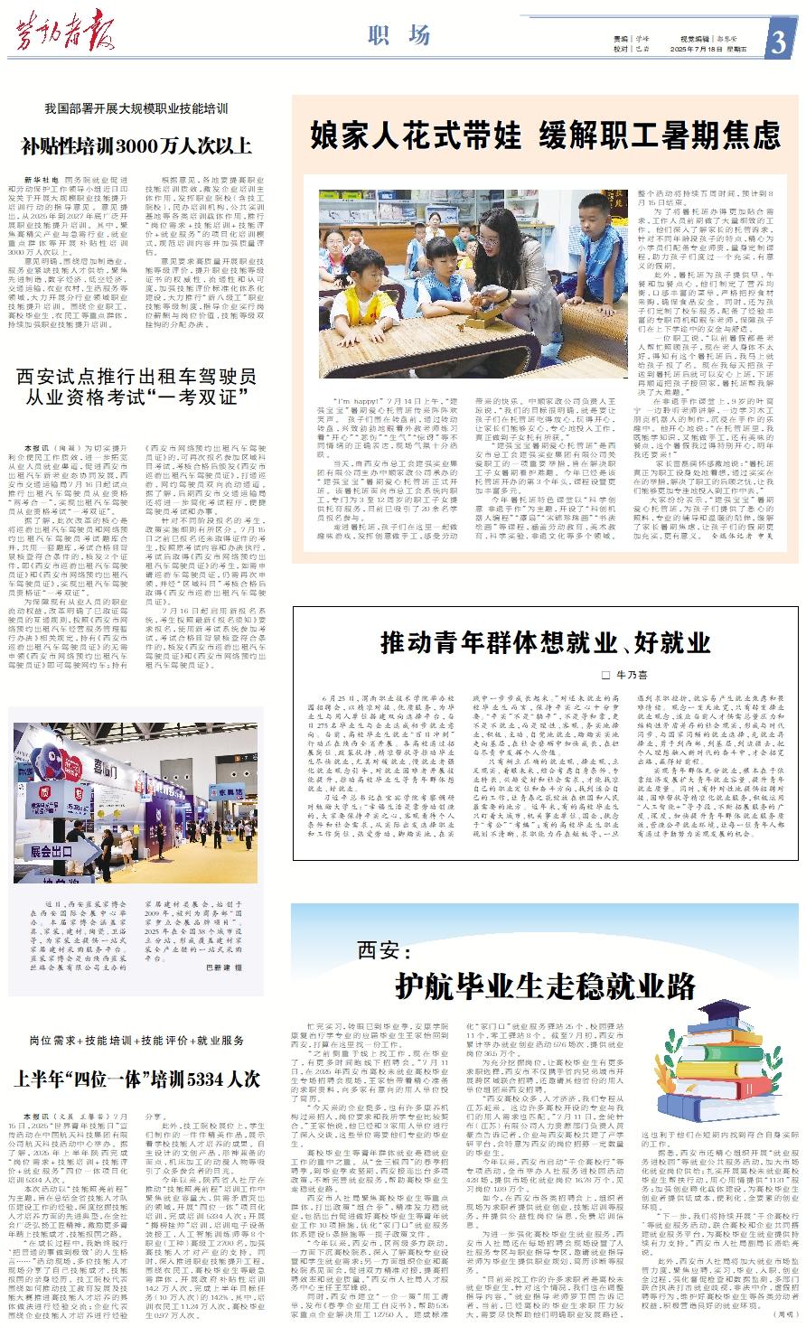 忙完实习,转眼已到毕业季,安康学院康复治疗学专业的应届毕业生王家怡回到西安,打算在这里找一份工作。 “之前侧重于线上找工作,现在毕业了,有更多时间跑线下招聘会。”7月11日,在2025年西安市离校未就业高校毕业生专场招聘会现场,王家怡带着精心准备的求职资料,向多家有意向的用人单位投了简历。 “今天来的企业挺多,也有许多康养机构过来招人,岗位要求和我所学专业比较契合。”王家怡说,他已经和3家用人单位进行了深入交谈,这些单位需要他们专业的毕业生。 高校毕业生等青年群体就业是稳就业工作的重中之重。从“金三银四”的春季招聘季,到毕业季攻坚期,西安接连出台多项政策,不断完善就业服务,帮助高校毕业生走稳就业路。 西安市人社局聚焦高校毕业生等重点群体,打出政策“组合拳”,精准发力稳就业,包括出台促进做好高校毕业生等青年就业工作10项措施、优化“家门口”就业服务体系建设5条措施等一揽子政策文件。 “今年以来,西安市、区两级多方联动,一方面下沉高校院系,深入了解高校专业设置和学生就业需求;另一方面组织企业和高校院系见面会,促进双方精准对接,提高招聘效率和就业质量。”西安市人社局人才服务中心主任王军锋说。 同时,西安市建立“一企一策”用工清单,发布《春季企业用工白皮书》,帮助535家重点企业解决用工12750人。建成标准化“家门口”就业服务驿站25个、校园驿站11个、零工驿站8个。截至7月初,西安市累计举办就业创业活动576场次、提供就业岗位36.5万个。 为充分挖掘岗位,让高校毕业生有更多求职选择,西安市不仅携手省内兄弟城市开展跨区域联合招聘,还邀请其他省份的用人单位组团来西安招聘。 “西安高校众多、人才济济,我们专程从江苏赶来。这边许多高校开设的专业与我们的用人需求也匹配。”7月11日,金轮针布(江苏)有限公司人力资源部门负责人黄豪杰告诉记者,企业与西安高校共建了产学研平台,会特意为西安的岗位招募一定数量的毕业生。 今年以来,西安市启动“千企高校行”等专项活动,全市举办人社服务进校园活动428场,提供市场化就业岗位16.78万个、见习岗位1.09万个。 如今,在西安市各类招聘会上,组织者现场为求职者提供就业创业、技能培训等服务,并提供公益性岗位信息、免费培训信息。 为进一步强化高校毕业生就业服务,西安市人社局还在每场招聘会现场设置了人社服务专区与职业指导专区,邀请就业指导老师为毕业生提供职业规划、简历诊断等服务。 “目前来找工作的许多求职者是离校未就业毕业生,针对这个情况,我们也在调整指导内容。”就业指导老师罗卫国告诉记者,当前,已经离校的毕业生求职压力较大,需要尽快帮助他们明确职业发展路径,这也利于他们在短期内找到符合自身实际的工作。 据悉,西安市还精心组织开展“就业服务进校园”等就业公共服务活动,加大市场化就业岗位供给;扎实开展离校未就业高校毕业生帮扶行动,用心用情提供“1131”服务;加强创业孵化载体建设,为高校毕业生创业者提供低成本、便利化、全要素的创业环境。 “下一步,我们将持续开展‘千企高校行’等就业服务活动,联合高校和企业共同搭建就业服务平台,为高校毕业生就业提供持续有力支持。”西安市人社局副局长潘皓亮说。 此外,西安市人社局将加大就业市场监管力度,聚焦应聘、实习、毕业、入职、创业全过程,强化督促检查和数据监测,多部门联合执法打击就业歧视、非法中介、虚假招聘等行为,维护好高校毕业生等各类劳动者权益,积极营造良好的就业环境。 (周明)