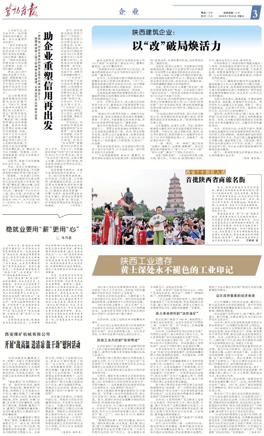 1941年5月的长乐塬窑洞车间里,宝鸡申新纱厂的工人日夜劳作,将纱锭飞转的隆隆机声化作抗击日寇的“工业枪炮”。 同年秋天的定边盐湖边,八路军第三五九旅的战士们在盐田劳作。他们用白色盐晶换来的物资,支撑起陕甘宁边区的经济命脉。 1943年的陕北高原上,延长石油厂七1井加深至86米时发生强烈井喷,日产原油超96吨。这是边区军民自力更生开发石油的艰辛历程中,钻获的首个高产油井。 …… 光阴流转,这些工业遗存并未随着时间湮灭。 自2017年工业和信息化部公布首批国家工业遗产名单以来,陕西省的宝鸡申新纱厂、延长石油厂、定边盐场相继入选。它们见证历史,在保护与发展中绽放出新的生命力。抗战工业内迁的“窑洞奇迹” 宝鸡申新纱厂前身是汉口申新第四纺织厂,在抗日战争时期辗转迁建而成,1939年8月复工,是国内为数不多保留较完整的抗战工业遗产。 依托遗产核心物项打造的长乐塬抗战工业遗址公园,以“工合之光”“工创天地”“长乐家园”3个组团全景式展现近百年宝鸡这座城市工业发展的光荣与梦想。 近日,来长乐塬抗战工业遗址公园的游客络绎不绝。 公园内,福新申新大楼的立面装饰简洁明快,薄壳车间的建筑设计尽显蛋壳力学原理,1921年的粗纱头开松机依然运转有声、可演示操作……这些都是见证抗战时期民族工业艰苦奋斗、实业救国的“活化石”。 最令人震撼的是由青砖箍砌的24孔窑洞车间。尽管看上去与普通窑洞无异,但它们在民族危亡时刻,承载着工业救国的希望。至今,窑洞车间内还放置着当时使用的细纱机、纱锭等实体遗存。 迁址宝鸡后,为了最大限度防范日军轰炸,申新纱厂因地制宜,在长乐塬北侧挖掘窑洞,将约70%的纺织设备搬入其中,开辟地下“第二工厂”。1941年4月19日,窑洞车间正式运转。 “窑洞顶部有数十米的黄土覆盖,非常牢固。洞内纵横交错,有交通道、吸尘塔、避让洞、透气孔等配套设施。”长乐塬片区开发建设管理委员会主任王敏告诉记者,“日本飞机轰炸宝鸡时,纱厂的工人一直在窑洞车间不间断生产,支持前方抗战。” 当时,申新纱厂还利用404火车头、3000千瓦发电机发电,开办电厂、面粉厂、油脂饲料厂,并建成学校、医院。 “在工业遗产的保护利用上,我们坚持完整再现工厂的传统格局、历史风貌和空间尺度,融入现代文旅体验,希望人们能在这里触摸历史记忆、感悟民族精神。”王敏说。助力革命胜利的“功臣油矿” 延长石油厂始建于1905年,是我国陆上石油工业的发祥地。这里不仅见证了中国陆上第一口油井“延一井”的诞生,还承载着“埋头苦干”的红色基因。 2018年,工业和信息化部认定延长石油厂为国家工业遗产,核心物项有7项10个点。现七里村采油厂所在地就是延长石油厂旧址。 1907年钻成出油的“延一井”,结束了中国大陆不产石油的历史。同年建成的七里村炼油厂,拉开了中国石油工业发展的序幕。 在革命战争年代,作为重要战略物资和工业“血液”的石油极度匮乏,直接影响着全国人民抗战救国的进程。为支援抗战,石油工人尝试自主钻探石油。 延长石油厂克服重重困难在七里村开展钻探工作,钻探的七1井、七3井等,为边区军工生产、交通运输提供了关键保障,有力地支援了抗日战争和解放战争,延长石油厂也被誉为“功臣油矿”。在艰苦创业的过程中,延长石油厂培育了大量埋头苦干、开拓创新的石油队伍和工程技术人员,奠定了新中国石油工业发展的坚实基础。 遗产核心物项还有新中国石油工业地质勘探标杆的“延深探一井”、中国陆相生油理论发源地的“延长石油三大石油地质教育教学实践点”,以及见证新中国重视石油事业发展的“苏联专家招待所”等。 近年来,七里村采油厂全力推进工业遗产宣传教育、保护利用工作,深入挖掘、丰富、提升百年老厂宝贵的精神文化遗产,大胆探索创新工业遗产保护和利用的途径,推动工业遗产保护利用与文化传承、产业创新、高质量发展深度融合。 2023年,七里村采油厂被授予“石油和化工行业红色教育基地”。 如今,站在中国陆上第一口油井旧址前,锈迹斑驳的井架基座、磨损严重的木制绞盘,仍在诉说着创业的艰辛。延长石油历史陈列馆的实物展品、历史影像和沙盘模型,再现了企业从清末官办油厂到现代化综合能源集团的蜕变。边区政府重要的经济来源 从空中俯瞰6月的定边盐湖,整齐的小格子盐田宛若大自然的调色盘。湖中不同的矿物质和藻类随着温度和光线变化,呈现出粉紫、琥珀金等色彩。 定边盐湖产盐历史悠久,始于秦汉、昌于唐代、盛于明清,边塞盐商文化与红色打盐历史在这里交汇。 1934年,陕甘边革命根据地成立陕甘边区盐场堡盐厂,以保障军队和边区人民用盐。 1937年陕甘宁边区政府成立后,非常重视盐业发展,强化对食盐生产、运输、销售等各个环节的管理,推动边区盐业发展和民生改善。后来,在艰苦奋斗、自力更生的号召下,八路军第三五九旅2000多名指战员来到定边盐场堡驻防打盐,开展生产自救。 “定边盐湖是边区政府非常重要的经济来源。战士们与当地群众一起打盐,每天天不亮就出操,太阳升起来就下湖。从湖心把盐运到湖畔,往返六七里地,一天运送十多趟,直干到日落西山。再以盐易物,为当地创造了盐税收入。”延长石油定边盐化工有限公司党委书记、总经理冯建亮介绍。 指