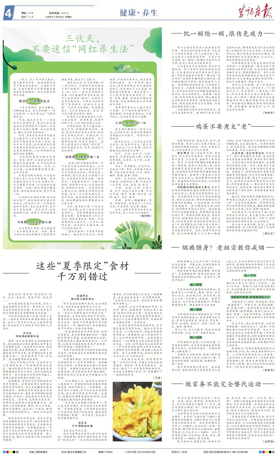 三伏天,是一年中阳气最旺、湿气最重的时节。在这段最热的日子里该如何养生?上海市名中医、上海中医药大学附属曙光医院朱抗美教授谈一谈伏天的常见养生误区。喝奶茶,不如喝淡盐水 三伏天要晒背、抱冬瓜睡觉、光脚踩在地上、用艾草泡脚……网上流传的“三伏天养生法”可谓花样百出。 对此,朱抗美直言:“三伏天的养生误区很多,有些人在不清楚自己体质的情况下就对一些网红养生法趋之若鹜,我们非常着急,建议大家适当做减法。” 其实,及时补充水分才是最朴实也最适合三伏天的养生法。尤其对于特别爱出汗的人来说,假如补水不及时,体内的液体总量会随着汗液的排出而减少,血液容易变得黏稠,心血管疾病的发病率就容易增加。 而补水的最佳选择是淡盐水。奶茶、咖啡、运动功能饮料大都属于热性食物,并不能很好地改善身体缺水的状态。此外,也可以喝一点养阴解暑的绿豆汤、麦冬百合汤。 与爱出汗的人相比,不容易出汗的人在三伏天会更难熬。朱抗美建议这类人可以适当晒太阳,吃点桂枝羊肉汤,从而起到发散的作用。不要一整天待在空调房间里,避开最热的时段,到户外动一动。 人体好比天然的空调,在炎热的环境下,体内的热量会通过汗液排出,假如24小时一直待在恒温的环境内,毛孔无法开泄,并不利于身体健康。适当出汗,能促进新陈代谢,有助于身体保持通畅。午后晒背,不如午后小憩 从去年夏天开始,网上就盛传三伏天晒背养生法。结果,有不少对此法趋之若鹜的人因为晒背晒到中暑,被送去了急诊室。 朱抗美认为,背上有督脉,督一身之阳气,正确晒背确实有助于阳气的提升。但中医讲究的是天、地、人合一,夏天本来就阳气旺盛,从中医脉学的角度来说,很多人会表现为“脉洪”,也就是气血会充盈体表。如果在炎热的环境下坚持晒背,就好比火上浇油。尤其是舌苔偏红、体质偏热的人,反而容易晒出病。其实,夏天反而要适当养阴、藏阴。 夏季的午后最好能适当小憩,心静自然凉。修身养性、保持平和的心态,才是顶级的养生之道。 同样的道理,有些人喜欢在三伏天艾灸,觉得能事半功倍。其实,夏季本就容易毛孔舒张,体内的气会随之外泄。中医认为,气能生血,气与血互相依附。过于频繁的刮痧、艾灸容易耗气。有些人经常去不正规的“养生馆”,反而会感到无力、头晕,这就是气脱的表现。辨明体质,是养生第一步 “我在门诊中经常会遇到一些十分关注养生知识的病人,以白领女性居多。她们在网上学习了不少中医养生知识,但往往是一知半解,有人甚至完全搞错了方向,来咨询后才恍然大悟。”朱抗美说,“中医有句话叫‘以精气分阴阳,则阴阳不可离;以寒热分阴阳,则阴阳不可混’。无论流行什么养生方法,都要先辨明自己的体质,而且一个人的体质不是一成不变的,最好能请医生进行判断,然后根据体质选择最适合自己的方法。” 比如,有些地方有“三伏天吃羊肉”的习惯,认为三伏天吃羊肉能补阳气。这就要根据自己的体质来选择。体质偏热的人吃太多羊肉,就很容易长痘、便秘。而体质偏寒的人适当吃一点羊肉,就很合适。假如喝太多绿豆汤,说不定就会拉肚子。 “最近我遇到一位身体不适的老病人。她说自己的生活一向很规律,平时很注重养生,就是水果吃得比较多。进一步询问,她才告知,因为看到网上说吃荔枝能补阳气,就连续吃了几天荔枝,结果导致口腔溃疡。”朱抗美举了一个门诊中非常普遍的例子。荔枝、芒果、榴莲、哈密瓜等都是热性水果,对体质偏热的人来说要适可而止。 还有很多养生达人喜欢用艾叶泡脚。艾叶确实能够通阳气、温经散寒,但皮肤经常长痘、大便干的人,并不适合用艾叶泡脚。三伏天,也可以补一补 夏天要不要进补?很多人认为,天热出汗多,补进去的营养容易随着出汗而流失。这其实是一种误区。 朱抗美认为,三伏天也可以适当进补,而且食补为先,药补也可。她列出了以下食谱,供大家根据自己的体质来选择—— 补气。乏力、出汗多、气短、脸色淡、舌有齿痕的人群,可适当食用黄芪、生晒参、太子参、山药、扁豆、黄精。 补血。头晕眼花、头发早白、记忆力下降、舌淡、月经量少的人群,可适当食用赤豆、红枣、枸杞、猪肝、桂圆、桑椹、阿胶。 补阳。乏力怕冷、精神不振、大便溏、舌胖大的人群,可适当吃一点羊肉、牛肉、韭菜、鸡、红参。 补阴。怕热、心烦、大便欠畅、口干、舌红少苔的人群,可以吃甲鱼、鸭子、黄鳝、西洋参、石斛、枫斗、百合、银耳。 补精。老年人腰酸腿软、耳鸣、牙齿脱落、舌瘦苔少,可以吃生蚝、冬虫夏草、哈士蟆、鲍鱼。 此外,如果去年冬天的膏方还没有吃完,在三伏天可以继续吃。 (陈俊珺)