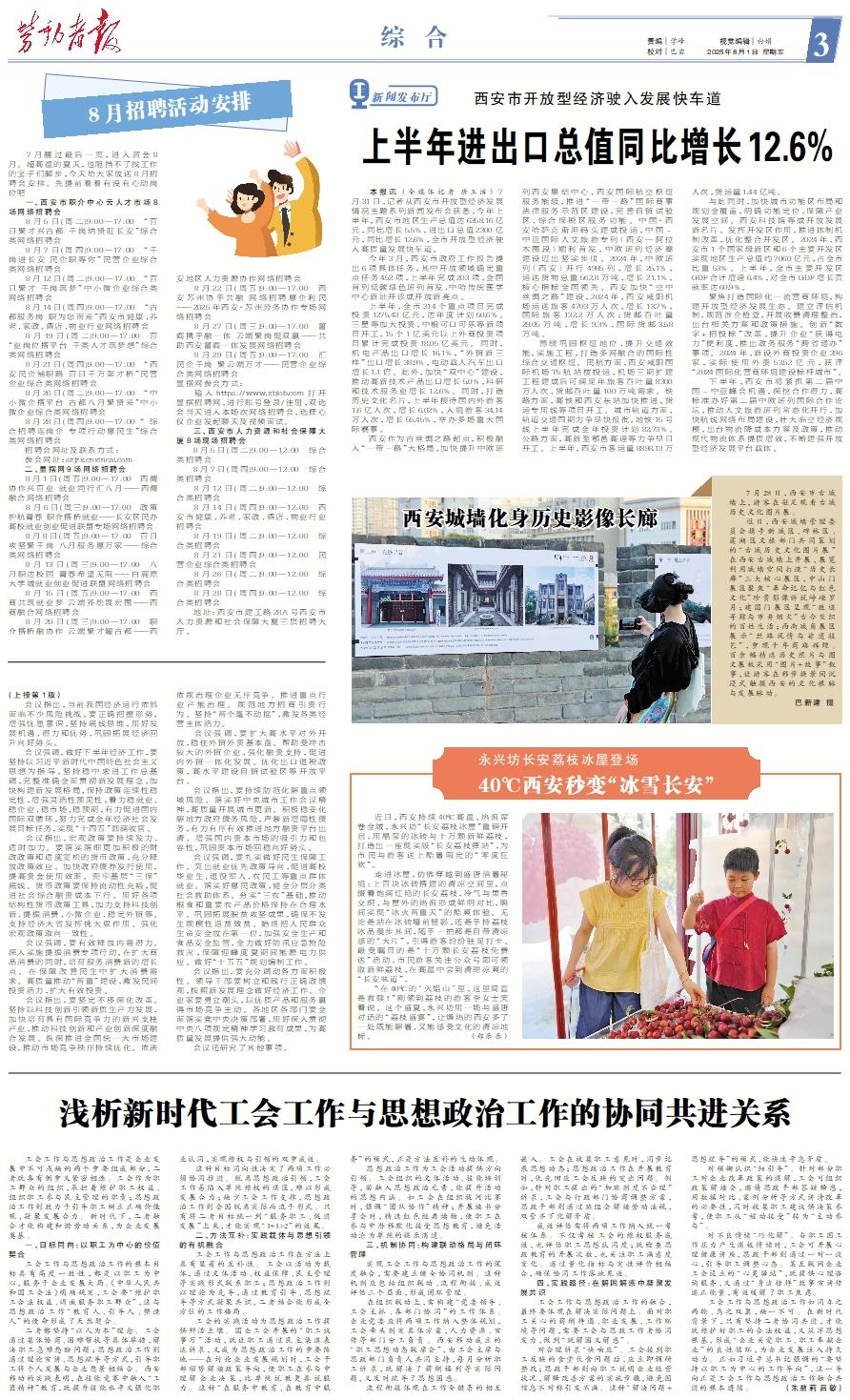 本报讯 (全媒体记者 唐玉洁) 7月31日,记者从西安市开放型经济发展情况主题系列新闻发布会获悉,今年上半年,西安市地区生产总值达6358.16亿元,同比增长5.5%,进出口总值2300亿元,同比增长12.6%,全市开放型经济驶入高质量发展快车道。 今年3月,西安市政府工作报告提出6项具体任务,其中开放领域确定重点任务452项,上半年完成203项,全国首列低碳绿色班列首发、中哈传统医学中心新址开诊成开放新亮点。 上半年,全市314个重点项目完成投资1275.43亿元,达年度计划50.6%。三星等加大投资,中粮可口可乐等新项目开工,15个1亿美元以上外商投资项目累计完成投资18.05亿美元。同时,机电产品出口增长16.1%,“外贸新三样”出口增长38.9%,电动载人汽车出口增长1.1倍。此外,加快“双中心”建设,推动高新技术产品出口增长5.0%,科研和技术服务业增长12.6%。同时,打造历史文化名片,上半年接待国内外游客1.6亿人次,增长6.02%,入境游客34.14万人次,增长55.45%,举办多场重大国际赛事。 西安作为古丝绸之路起点,积极融入“一带一路”大格局,加快提升中欧班列西安集结中心、西安国际航空枢纽服务能级,推进“一带一路”国际商事法律服务示范区建设,完善自贸试验区、综合保税区服务功能。中国·西安哈萨克斯坦码头建成投运,中国-中亚国际人文旅游专列(西安—阿拉木图段)顺利首发,中欧班列经济圈建设迈出坚实步伐。2024年,中欧班列(西安)开行4985列,增长25.1%,运送货物总重562.8万吨,增长21.1%,核心指标全国领先。西安加快“空中丝绸之路”建设,2024年,西安咸阳机场运送旅客4703万人次,增长13.7%,国际旅客132.2万人次;货邮吞吐量29.05万吨,增长9.3%,国际货邮3.58万吨。 围绕巩固枢纽地位、提升交通效能,实施工程,打造多网融合的国际性综合交通枢纽。民航方面,西安咸阳国际机场T5航站楼投运,机场三期扩建工程建成后可满足年旅客吞吐量8300万人次、货邮吞吐量100万吨需求。铁路方面,高铁和西安东站加快推进,货运专用线等项目开工。城市轨道方面,轨道交通四期力争尽快报批,地铁15号线上半年完成全年投资计划82.73%。公路方面,高新至鄠邑高速等力争早日开工。上半年,西安市客运量8898.13万人次,货运量1.44亿吨。 与此同时,加快城市功能区布局和规划全覆盖,明确功能定位,保障产业发展空间。西安科技馆等成开放发展新名片。发挥开发区作用,推进体制机制改革,优化整合开发区。2024年,西安市1个国家级新区和6个主要开发区实现地区生产总值约7060亿元,占全市比重53%。上半年,全市主要开发区GDP合计增速6.4%,对全市GDP增长贡献率达60.9%。 聚焦打造国际化一流营商环境,构建开放型经济发展生态。建立评估机制,规范涉企检查,开展收费清理整治,出台相关方案和政策措施。创新“数字+招投标”改革,提升企业“获得电力”便利度,推出政务服务“跨省通办”事项。2024年,新设外商投资企业396家,实际使用外资53.52亿元,获评“2024国际化营商环境建设标杆城市”。 下半年,西安市将紧抓第二届中国-中亚峰会机遇,深挖合作潜力,高标准办好第二届中欧班列国际合作论坛,推动人文旅游班列常态化开行,加快航线网络布局建设,壮大临空经济规模,出台物流降成本方案及政策,推动现代物流体系提质增效,不断建强开放型经济发展平台载体。