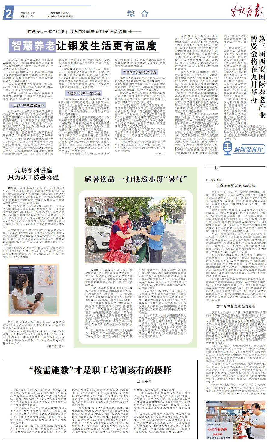 本报讯 (全媒体记者 唐玉洁) 8月14日,记者从第三届西安国际养老产业博览会(以下简称“西安老博会”)新闻发布会上获悉,该博览会将于9月19日至21日在西安国际会展中心隆重举办。本届展会以“秦系银龄 怡养长安”为主题,设有3.2万平方米的展出面积、12大特色展区及15场专业活动,旨在打造西北地区养老产业的标杆盛会,有力推动银发经济的高质量发展。 发布会介绍,本届西安老博会展出总面积达3.2万平方米,规模位居全国养老展会前列,共设置12个特色展区,实现养老全产业链覆盖。其中,政府及城市组团展区将集中展示全省及各地区养老产业发展成果;智慧养老展区聚焦智能养老机器人、可穿戴辅助设备等科技产品;适老化产品及智能家居展区提供适老化改造整体解决方案;医养结合展区呈现医康养融合发展成果;老年用品银发消费展区则以“银龄集市”形式展示老年人生活用品、药食同源食品等。 届时,展会预计吸引500余家国内外企业、机构参展,较去年规模翻倍。日本、韩国多家企业将组团参展,集中展示国际先进养老技术与产品,国际化水平显著提升。 本届展会三大亮点尤为突出。首先,专业化与国际化水平提升,12大展区细分领域,国际企业组团参展,全面呈现养老产业新成果;其次,聚焦行业前沿,搭建“政产学研用”对接平台,集中发布养老科技成果,推动产业链协同;最后,打造沉浸式消费场景,涵盖“衣食住行旅娱购”全维度,现场提供健康义诊、智能产品试用等惠民服务,满足老年人多元化需求。 西安老博会的持续举办,对陕西养老产业具有显著助推作用。展会已成为产业发展的“催化剂”:通过整合国内外资源,推动本地产业从“单一服务”向“产业链集群”跨越;构建“养老+文旅”“养老+医疗”等融合生态,为银发经济注入新动能;培育适老化市场,加速银发消费扩容,提升老年人幸福感。 近年来,西安市为推动智慧养老,积极搭建高水平交流平台。本届展会“智慧养老展区”将集中展示前沿成果;出台《西安市开展智慧养老院建设试点方案》,确定3家试点机构并给予资金支持;培育本土品牌,建成适老化产品展销中心,引入100余种智慧产品,通过“银龄大集”等活动让科技惠及更多老人。