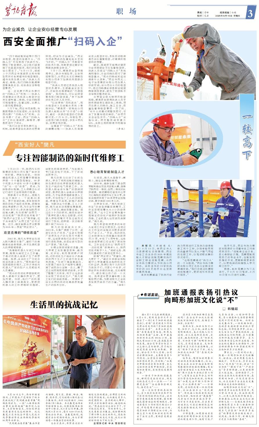 “扫个码就能知道哪个部门来检查、检查内容是什么。‘扫码入企’不仅规范了执法行为、降低了检查频次,也让我们感受到了有温度的服务,我们的发展信心更足了。”8月11日,说起上个月西安市莲湖区北关市场监管所对永辉超市的检查情况,超市有关负责人说,“执法人员亮证、亮码,我们扫码后能清晰查看食品安全、化妆品安全等检查事项。” 这一变化源于西安市推行的“扫码入企”机制——执法人员需提前在系统录入检查计划并生成专属二维码,企业扫码即可核验身份、监督过程,从源头上避免随意检查。 7月下旬,西安市司法局、市数据局联合印发通知,在全市范围内推广“扫码入企”机制。在全市推广之前,西安“扫码入企”工作在莲湖区、雁塔区、鄠邑区进行了试点。 “我们在全省率先推行这一机制,就是希望优化法治化营商环境,切实为企业减负。”西安市司法局法治监督处处长王剑飞介绍,“‘扫码入企’不是简单的技术升级,而是要通过数字化倒逼执法理念转变。” 7月7日,鄠邑区应急管理局牵头,联合市场监管、生态环境等部门,在西安庆长石油销售有限公司余下加油站开展联合检查行动。 “执法人员通过系统录入检查任务清单,生成涵盖安全生产、污染防治等领域的‘行政检查码’。我扫码后,可以实时查看各部门检查进度。”余下加油站有关工作人员介绍。 “以前害怕‘突然袭击’,现在检查前3天就能在系统上看到计划。”鄠邑区一家物流公司负责人赵刚点开“企企通”小程序,最近一次联合检查的记录清晰可见:7月15日,市场监管、交通部门联合检查,涉及4项内容,结果全部合格。 这得益于“扫码入企”系统的提醒功能——执法人员需提前录入检查计划,系统自动检测是否存在重复检查,对高频次检查自动预警。 最近,莲湖区卫健局对辖区企业开展职业卫生监督检查时,执法人员通过“扫码入企”系统亮明身份,企业扫码后即可了解检查重点。“现在扫码就知道该准备什么资料。”西安市西无二电子信息集团有限公司负责人任新军说,该公司在6月的检查中,通过扫码提前获悉职业健康档案规范要求,避免了因资料不全导致的整改延误。 在智慧交通大楼项目检查现场,鄠邑区住建局执法人员手持终端设备生成动态二维码,项目负责人扫码后,施工安全、质量监督等检查事项一目了然。“有什么问题对照整改即可,省去了反复沟通的麻烦。”该项目安全总监表示,“扫码入企”实施以来,项目整改效率提升50%,未再出现因标准不明确导致的返工。 (李妮)