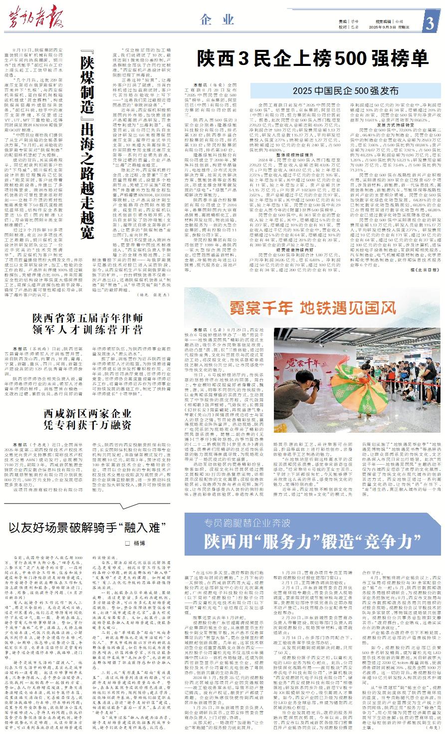 本报讯 (任荣) 全国工商联8月28日发布“2025中国民营企业500强”榜单。京东集团、阿里巴巴(中国)有限公司、恒力集团有限公司位居前三。 陕西入围500强的3家企业分别是:隆基绿能科技股份有限公司,排名第128位;陕西泰丰盛合控股集团有限公司,排名第133位;荣民控股集团有限公司,排名第347位。 隆基绿能科技股份有限公司成立于2000年,聚焦科技创新,构建单晶硅片、电池组件、分布式光伏解决方案、地面光伏解决方案、氢能装备等业务板块,形成支撑全球零碳发展的“绿电”+“绿氢”产品和解决方案能力。 陕西泰丰盛合控股集团有限公司成立于2016年,是集国际国内大宗商品贸易、高端精细化工、新材料开发应用、物流运输、金融服务为一体的大型企业集团,拥有控股公司11家、参股公司3家。 荣民控股集团有限公司创建于1999年,是陕西一家大型综合类民营企业,经营范围涵盖新材料、金融、冷链物流与进出口贸易、现代服务业、房地产等。