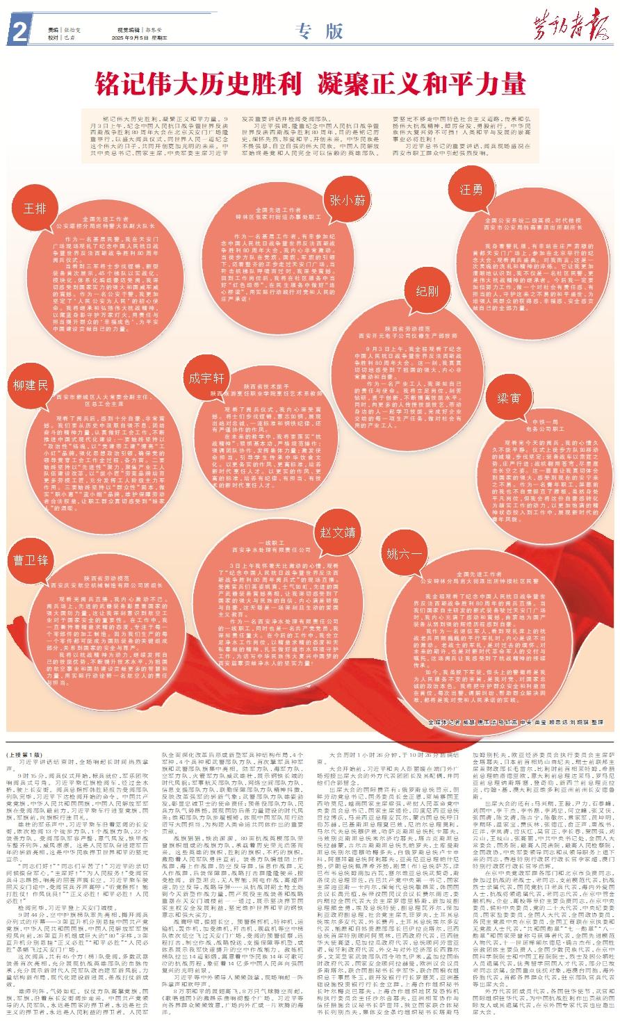 铭记伟大历史胜利,凝聚正义和平力量。9月3日上午,纪念中国人民抗日战争暨世界反法西斯战争胜利80周年大会在北京天安门广场隆重举行,以盛大阅兵仪式,同世界人民一道纪念这个伟大的日子,共同开创更加光明的未来。中共中央总书记、国家主席、中央军委主席习近平发表重要讲话并检阅受阅部队。 习近平强调,隆重纪念中国人民抗日战争暨世界反法西斯战争胜利80周年,目的是铭记历史、缅怀先烈、珍爱和平、开创未来。中华民族是不畏强暴、自立自强的伟大民族。中国人民解放军始终是党和人民完全可以信赖的英雄部队。要坚定不移走中国特色社会主义道路,传承和弘扬伟大抗战精神,踔厉奋发、勇毅前行。中华民族伟大复兴势不可挡!人类和平与发展的崇高事业必将胜利! 习近平总书记的重要讲话、阅兵现场盛况在西安市职工群众中引起强烈反响。王排全国先进工作者公安灞桥分局巡特警大队副大队长 作为一名基层民警,我在天安门广场现场观礼了纪念中国人民抗日战争暨世界反法西斯战争胜利80周年阅兵仪式。 当看到三军将士步伐铿锵、新型装备首次展示,45个梯队以实战化、模块化、体系化编组豪迈受阅,我深切感受到国家实力的强大和国威军威的震撼。作为一名公安干警,我更加坚定了‘人民公安为人民’的初心使命。我将继承和弘扬伟大抗战精神,以藏蓝身影守护万家灯火,用责任与担当提升群众的‘幸福成色’,为平安中国建设贡献自己的力量。张小蔚全国先进工作者碑林区张家村街道办事处职工 作为一名基层工作者,有幸参加纪念中国人民抗日战争暨世界反法西斯战争胜利80周年大会,我内心非常激动。当徒步方队在党旗、国旗、军旗的引领下,迈着整齐的正步走过天安门广场,当歼击机梯队呼啸而过时,我深受震撼。回到工作岗位后,我将在社区服务中当好“红色纽带”,在民生服务中做好“连心桥梁”,用实际行动践行对党和人民的庄严承诺!汪勇全国公安系统二级英模、时代楷模西安市公安局韩森寨派出所副所长 我身着警礼服,有幸站在庄严肃穆的首都天安门广场上,参加在北京举行的纪念大会、观看阅兵盛典。对我而言,这是一次灵魂的洗礼和精神的淬炼。它让我更加清晰地认识到,我不仅是一名社区民警,更是伟大抗战精神的继承者。今后我一定要加倍努力工作,做一个对社会有责任感、有担当的人,守护这来之不易的和平盛世,为增强人民群众的获得感、幸福感、安全感贡献自己的全部力量。柳建民西安市新城区人大常委会副主任、区总工会主席 观看了阅兵后,感到十分自豪、非常震撼。我们要从历史中汲取自强不息、团结奋斗的精神力量,认真做好工会工作,不断推进中国式现代化建设:一要始终坚持以“政治性”铸魂,以“党建带工建”擦亮“工小红”品牌,强化思想政治引领,确保党的领导贯穿工会工作全过程、各方面。二要始终坚持以“先进性”聚力,聚焦产业工人队伍建设改革,以“能小匠”劳竞品牌培育更多劳模工匠,充分发挥工人阶级主力军作用。三要始终坚持以“群众性”固本,做实“职小惠”“蓝小帽”品牌,维护保障劳动者合法权益,让职工群众真切感受到“娘家人”的温暖。成宇轩陕西省技术能手陕西旅游烹饪职业学院烹饪艺术系教师 观看了阅兵仪式,我内心深受震撼。将士们步伐铿锵、意志如钢,展现出绝对忠诚、一流标准和钢铁纪律,还有严谨协作的作风。 在未来的教学中,我将要落实“抗战精神”:狠抓基本功,严格规范操作;强调团队协作,发挥集体力量;激发使命担当,引导学生传承中华饮食文化。以更务实的作风、更高标准,培养新时代烹饪人才。以更实的作风、更高的标准,培养有纪律、有担当、有技术的新时代烹饪人才。纪刚陕西省劳动模范西安开元电子公司仪器生产部技师 9月3日上午,我全程观看了纪念中国人民抗日战争暨世界反法西斯战争胜利80周年大会。这一刻,我真真切切地感受到了祖国的强大,内心非常激动和自豪。 作为一名产业工人,我深知自己的责任与使命。我将立足岗位,刻苦钻研,勇于创新,不断提高技能水平。同时,向更多的人传授技能技艺,带动身边的人一起学习技能,完成好企业交给的每一项生产任务,做对社会有用的产业工人。梁寅中铁一局电务公司职工 观看完今天的阅兵,我的心情久久不能平静。仪式上徒步方队如移动的城墙,步伐坚定;装备战车以雷霆之势,庄严行进;战机翱翔苍穹,尽显鹰击长空之姿。这一幕幕让我真切体会到国家的强大,感受到现在的安宁来之不易。作为一名青年职工,屏幕前的我也不自觉挺直了腰板,虽然身处平凡岗位,但我会将这份自豪感转化为踏实工作的动力,以更加饱满的精神状态投入到工作中,展现新时代的青年风貌。曹卫锋陕西省劳动模范西安庆安航空机械制造有限公司班组长 观看完阅兵直播,我内心激动不已。阅兵场上,先进的武器装备彰显着国家的强大国防力量,这让我深刻意识到航空工业对于国家安全的重要性。在工作中,我一直秉持着精益求精的态度,专注于每一个零部件的加工制造。因为我们生产的每一个零件都可能成为国防装备的关键组成部分,关系到国家的安全与尊严。 我将以抗战精神为动力,继续发挥自己的技能优势,不断提升技术水平,为祖国的航空事业和国防建设贡献更多的智慧和力量,用实际行动诠释一名