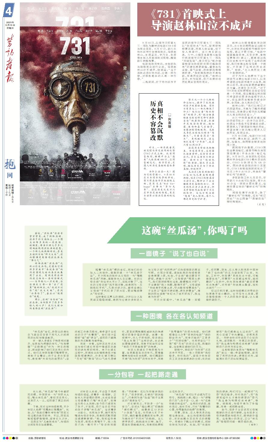 9月18日,以侵华日军第七三一部队为题材的电影《731》将与观众见面。9月17日,影片在哈尔滨举行全球首映式,导演赵林山,主演姜武、李乃文、孙茜等主创人员到首映式现场,揭秘影片拍摄故事。 电影放映完毕后,主创团队与到场观众进行交流。导演赵林山泣不成声,他说道:“这个首映必须在哈尔滨,它是一种告慰,对那些逝去的人是一种告慰。” 二战期间,位于哈尔滨市平房区的侵华日军第七三一部队以“防疫给水”为名,秘密研制细菌武器,开展人体实验,犯下反人类暴行。该片由长影出品。片中,小贩王永章等人被强行抓进侵华日军第七三一部队“特设监狱”,受日军以“配合健康检查与防疫研究即可换取自由”的虚伪承诺欺骗,遭受冻伤实验、毒气实验、活体解剖等极端折磨。“我觉得我拍的不是电影,而是历史的证据。”赵林山表示,作为导演,自己有责任将历史真实呈现给观众。 赵林山在接受媒体采访时表示,在6年的跨国取证过程当中,在所有历史和细节缝隙当中发现,谎言才更可怕。“电影中健康换取自由、天皇亲善、食物宝贵等词(谎言),都是通过我们在史料当中发现了这样的端倪,我们觉得这些仅仅是一个端倪,才形成了这样的历史悲剧。” 他说,“在人类历史上是一个至暗时刻。” 对于为什么选择当下这个时间节点推出电影《731》,以及希望通过电影传递什么信息,赵林山表示,通过电影更想凝聚社会力量,达成社会共识,“对于731的史实挖掘和史实追证仅仅是一个开端,通过揭露这样的罪行希望团结更多热爱和平的人士,将这段历史能够形成全世界、全民族、全人类的记忆”。 赵林山称:“我们以铭记之名回望历史,不是为了揭开疼痛的伤疤,而是要让和平的光照耀在人类文明的征途上。” 在片中饰演被抓来做实验的普通百姓之一的李乃文表示,扮演这个角色不仅要做足功课,更要深入了解那段特殊的历史,希望全球上映后能让更多人记住历史,反思过去。 9月18日起,电影《731》将在中国、澳大利亚、新西兰、美国、加拿大、韩国等全球多地陆续上映。 据网络平台数据,《731》预售总票房破亿,成春节档后首部预售票房(不含点映)破亿电影。9月20日,主创团队还将赴衢州举办电影《731》衢州寻迹活动。《731》公映时长为125分钟。国内多地影院的排片表显示,《731》首场放映时间定在了当天上午9点18分,并注有“警钟长鸣”的标识。 多家影院工作人员表示,尽管影片9点就可以放映,但9点18分这一时间点更有意义,也是特意安排的“警钟长鸣”特殊场次。 网络售票平台显示,除了“警钟长鸣”特殊场,还有“铭记历史”“勿忘国耻”“吾辈自强”等特殊场次。 (王雯)